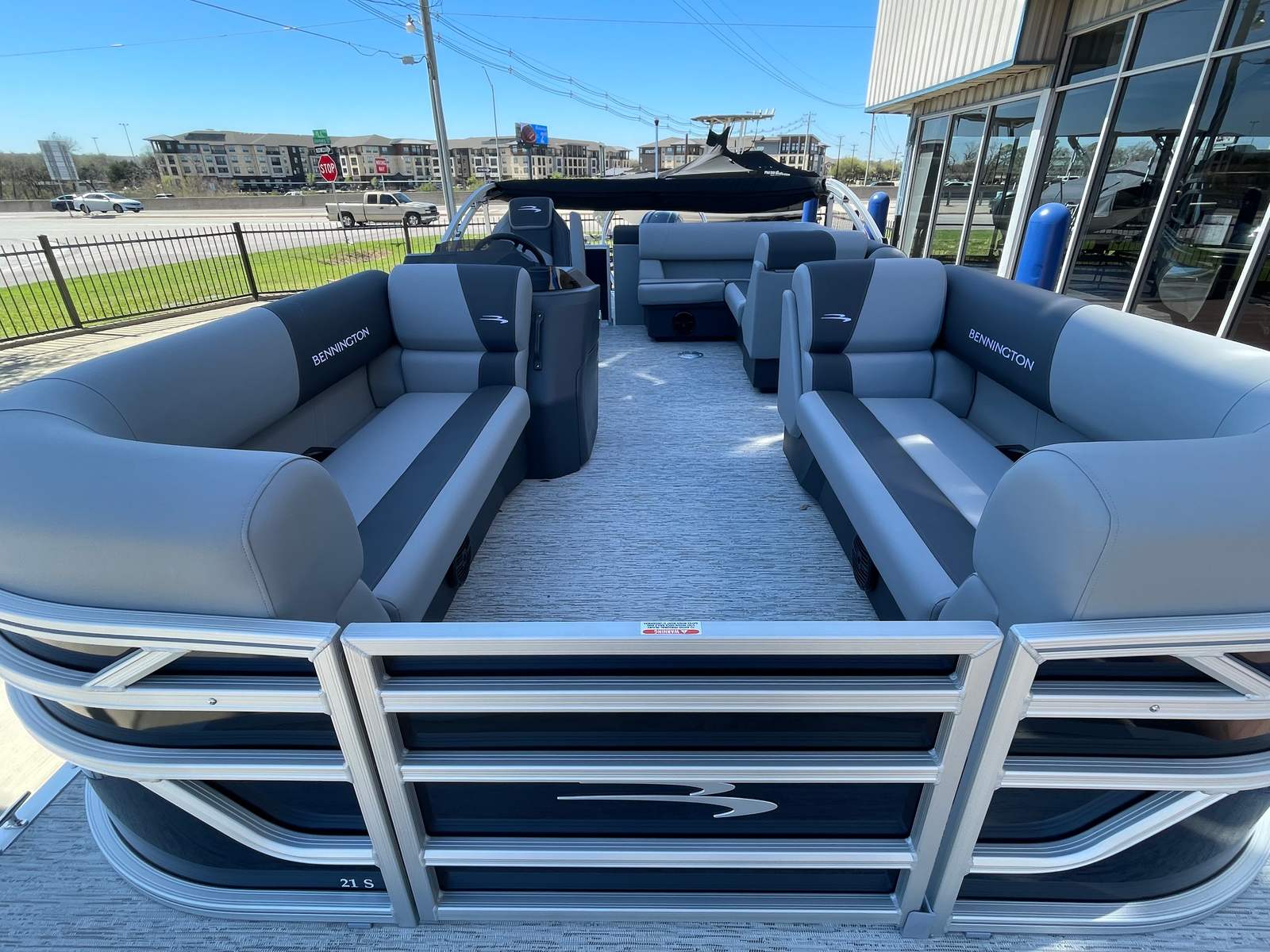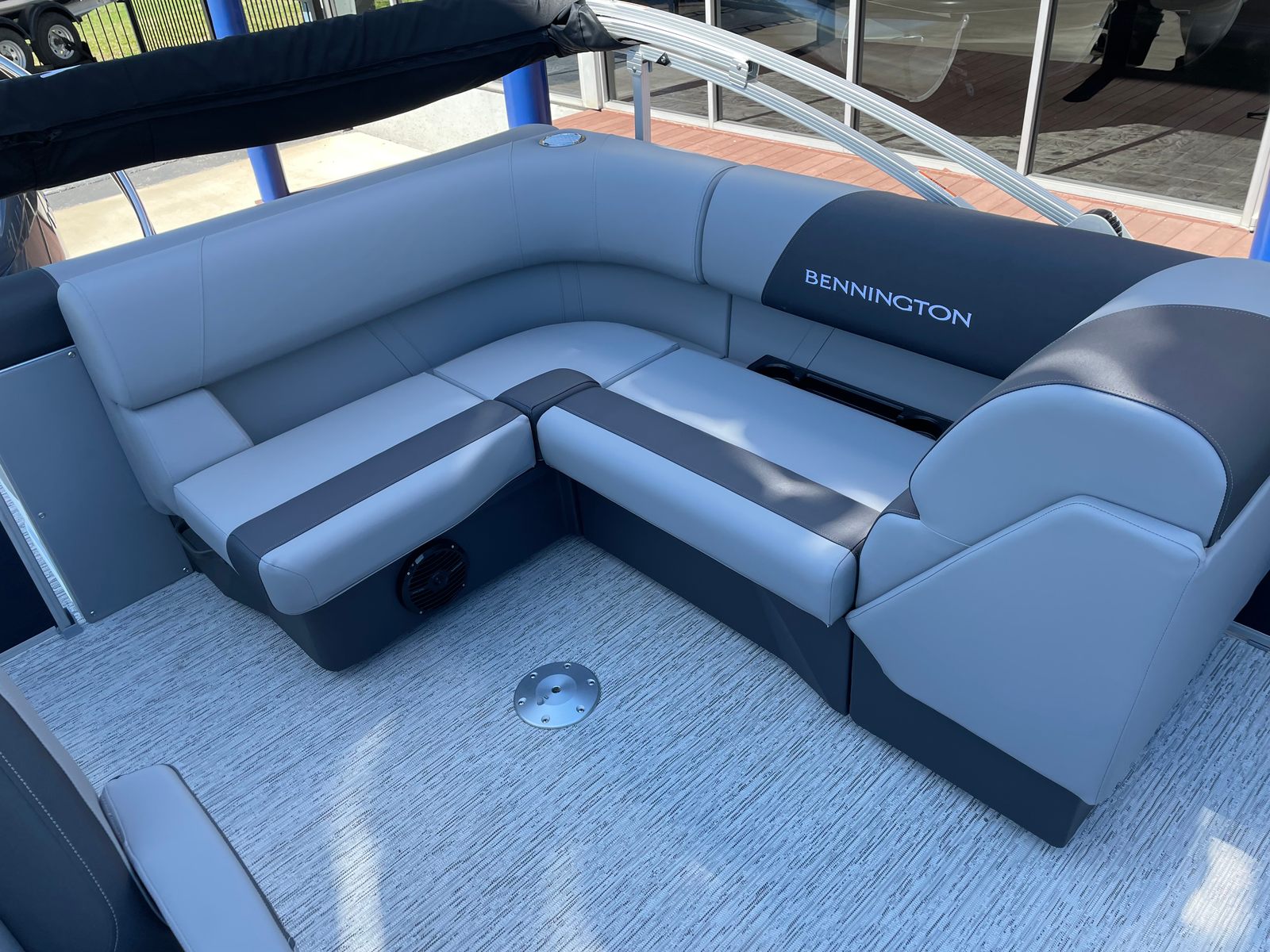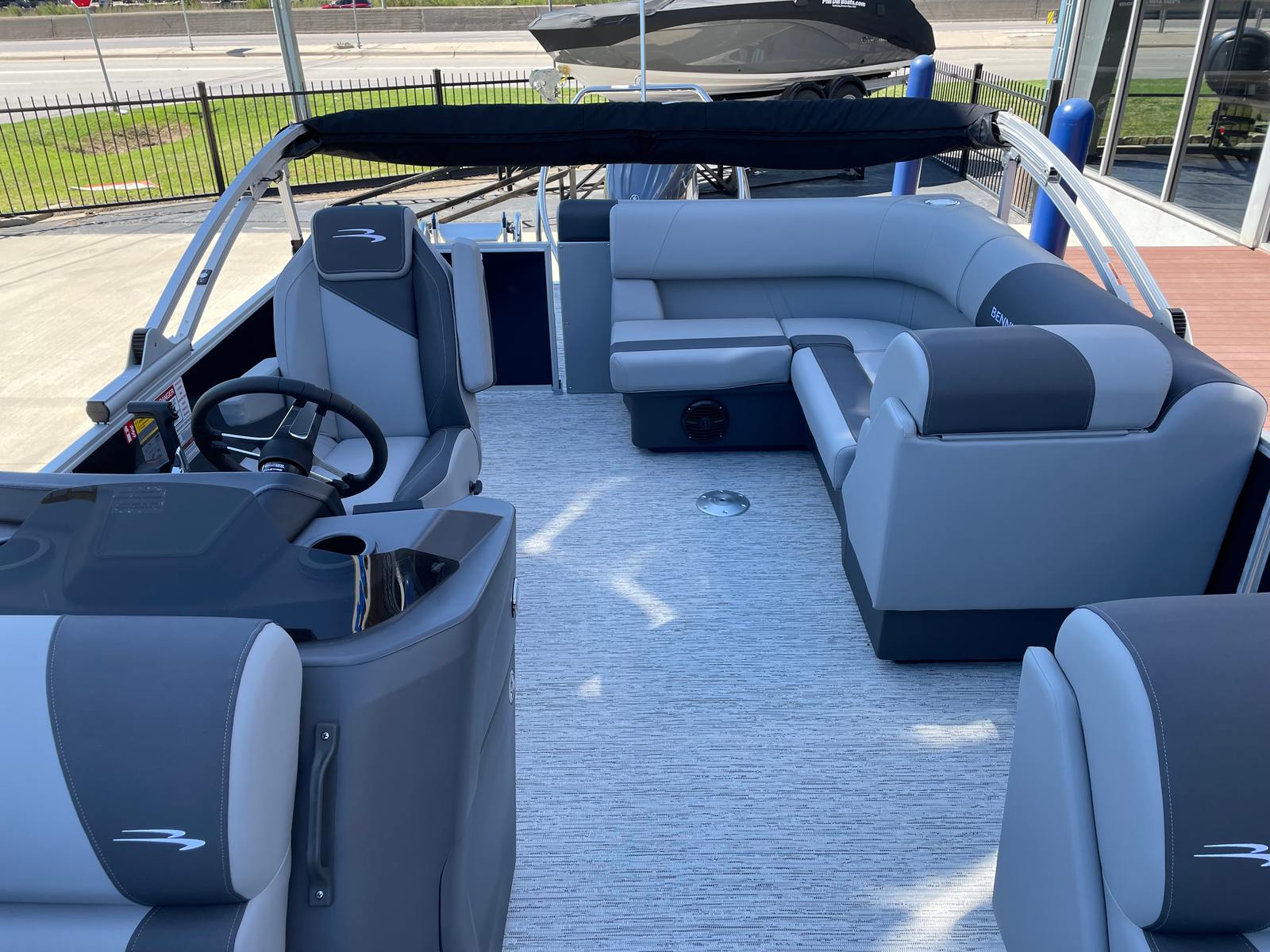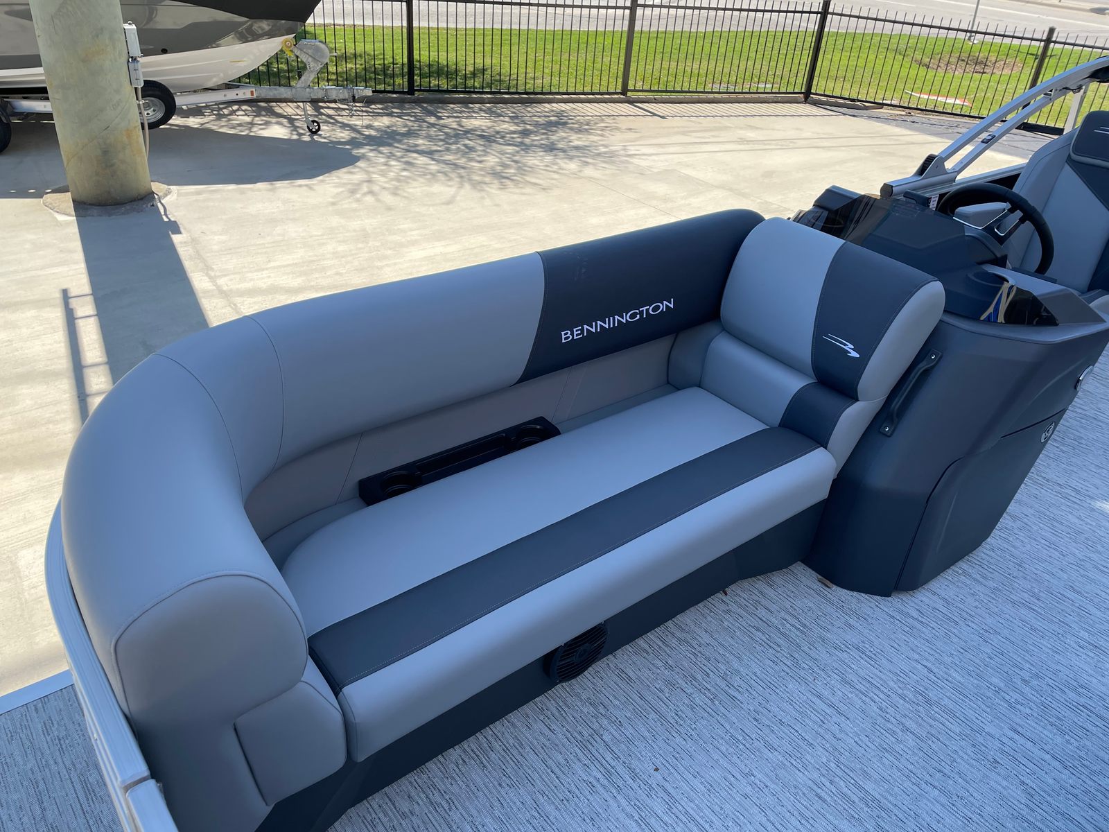 Step aboard the Bennington 21 SLJ SPS and discover a host of premium features designed to maximize your enjoyment and convenience. The single switch battery system provides reliable power management, while the electric power top curved Bimini offers effortless shade adjustment with a sleek, modern look. The midnight black canvas paired with shadow grey accents creates a sophisticated aesthetic, complemented by the ironwood dash accent for a touch of elegance at the helm. Stay connected and powered up with the integrated wireless charger, ensuring your devices are always ready for action. The Valencia grey upholstery adds a refined touch to the spacious seating areas, inviting you to relax in comfort as you cruise. The SPS Performance Package, featuring a 33-gallon transom direct fill, further enhances the boat’s stability and fuel capacity, supporting longer journeys and more time on the water.