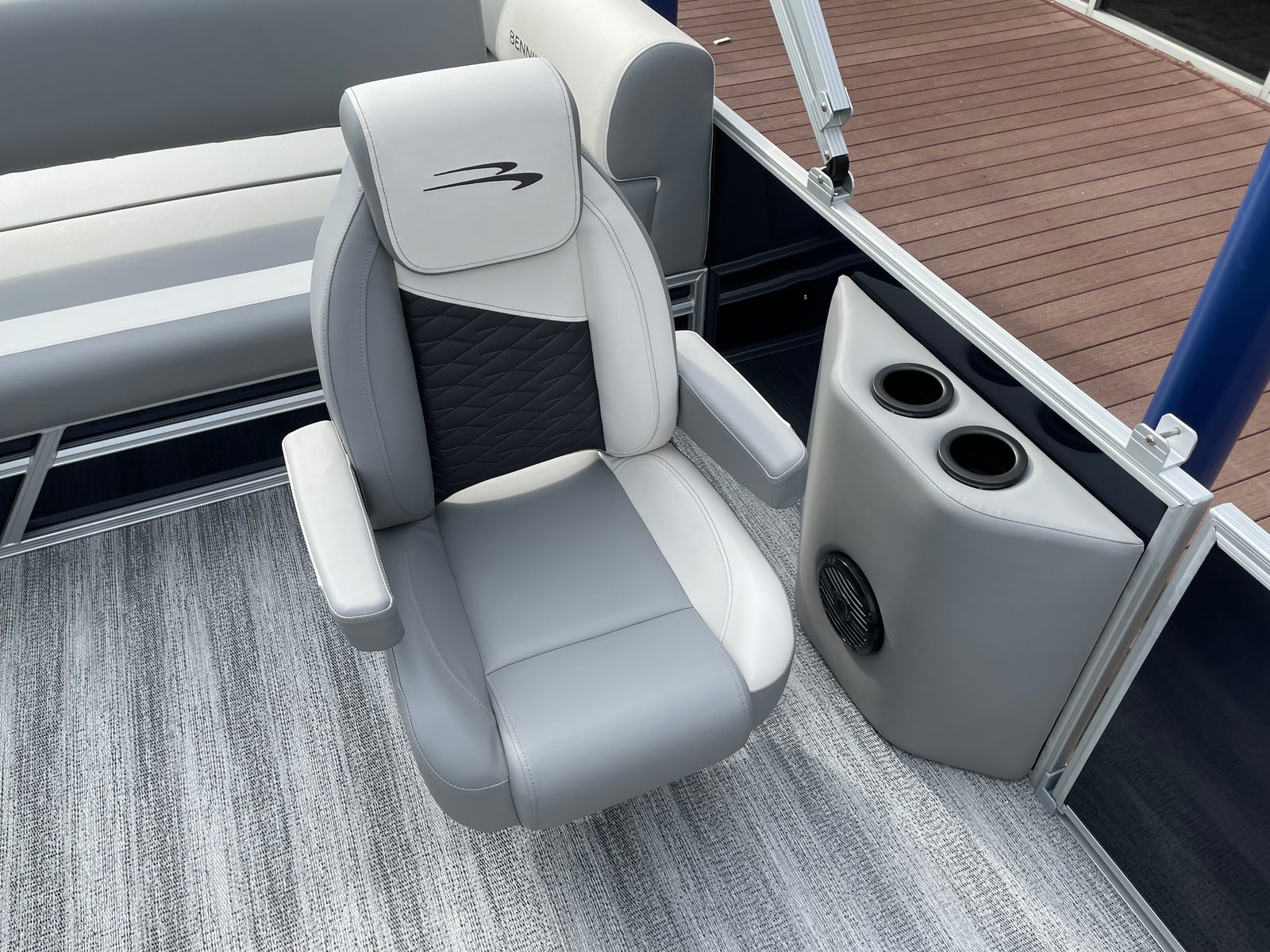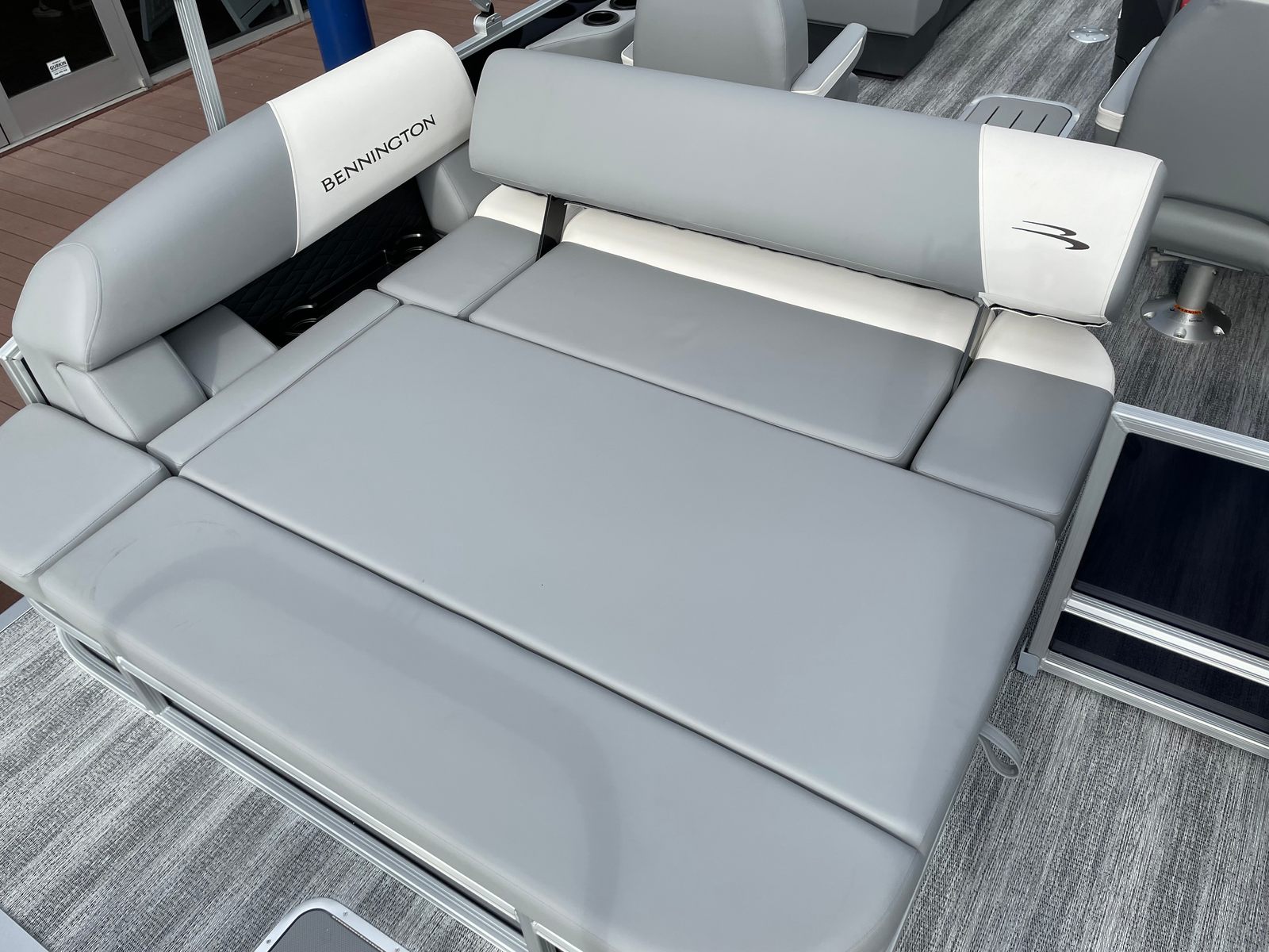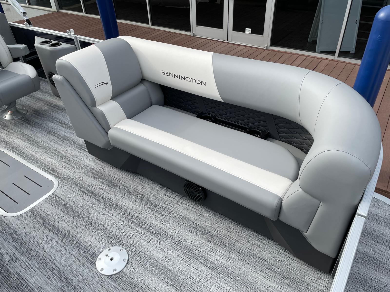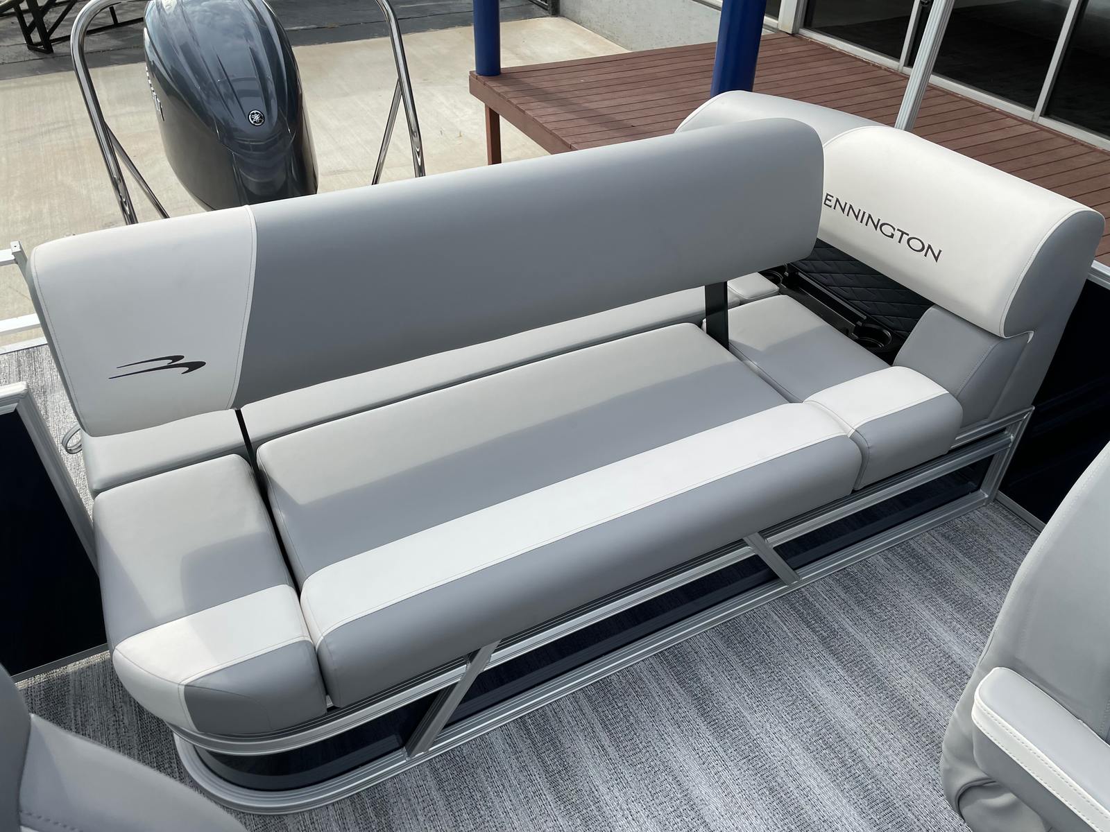 This Bennington pontoon boat is loaded with premium features designed to enhance your time on the water. The underdeck wave shield improves ride quality by reducing drag and providing a smoother, quieter experience, even at higher speeds. The ski tow bar—part of the SPS package—makes it easy to enjoy watersports, while the wireless charger ensures your devices stay powered throughout the day. A windscreen offers protection from the elements, adding to your comfort during breezy or sunny conditions.Inside, the Serene Soft Touch Vinyl with Simtex accents and diamond-pressed lumbar support creates a plush, inviting atmosphere for you and your guests. The battery single switch simplifies power management, while the thoughtfully designed layout maximizes both seating and storage. Every detail, from the accent colors to the ergonomic seating, reflects Bennington’s commitment to quality and style.