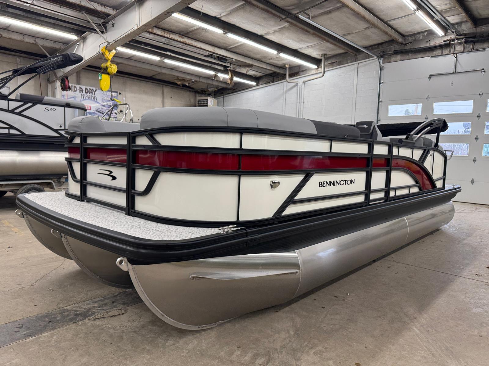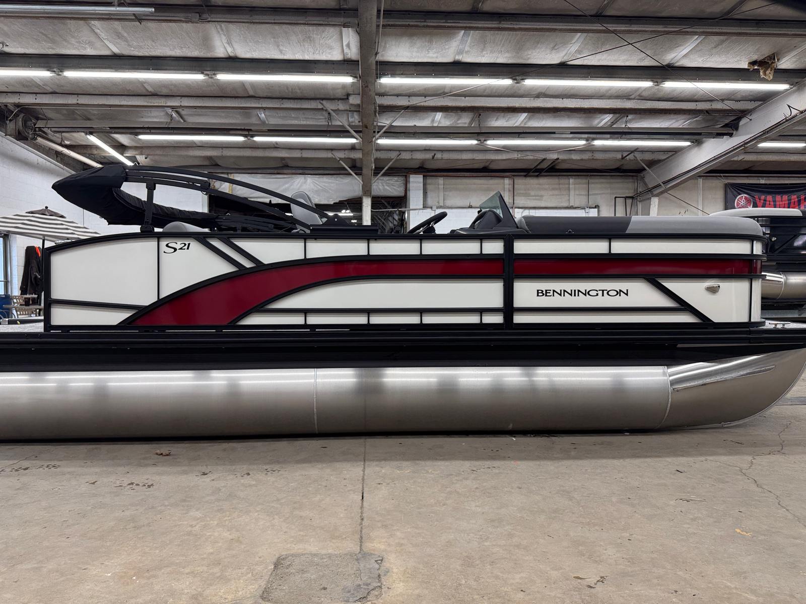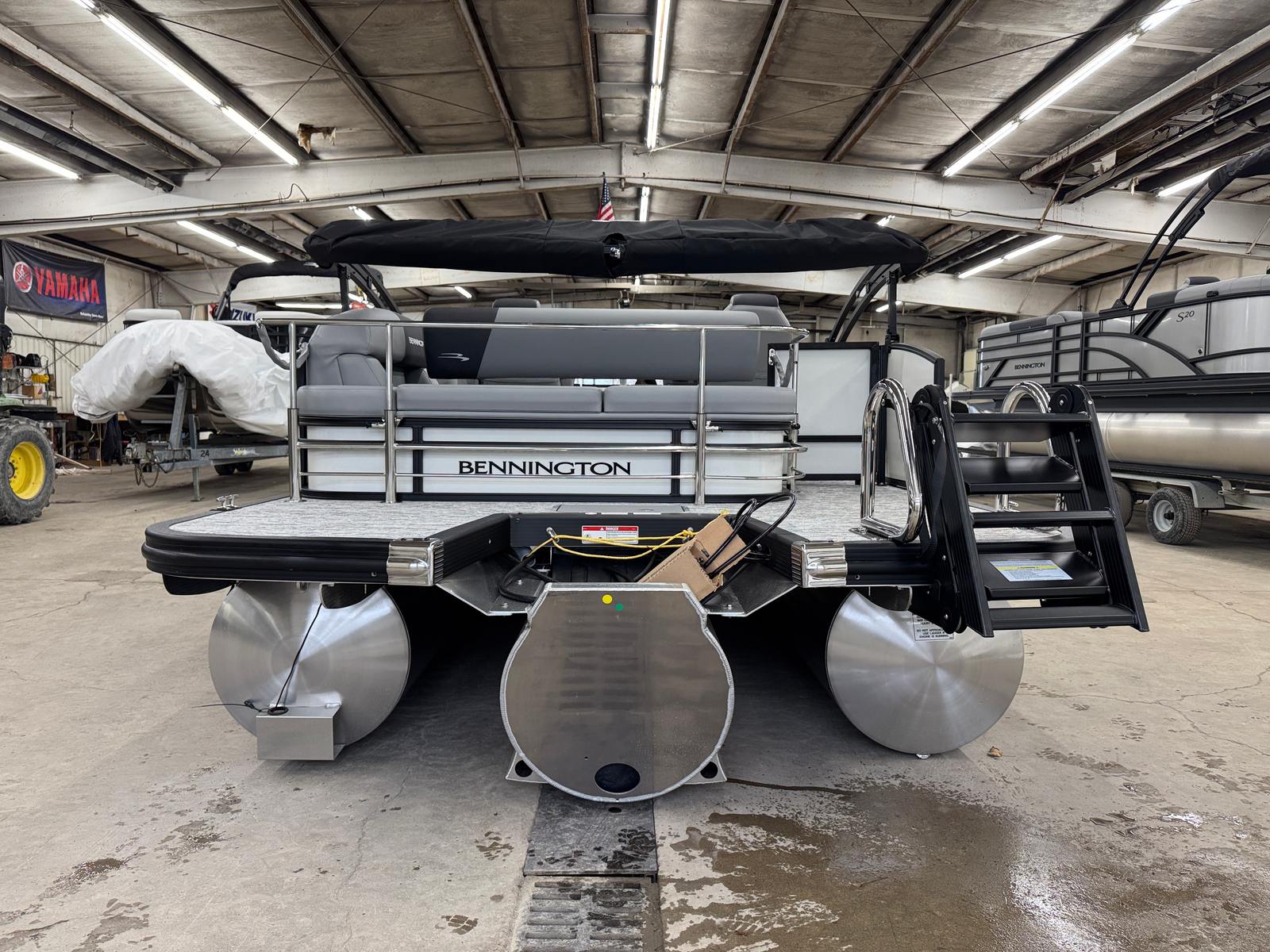 The 2026 Bennington 21 SSB SPS Pontoon stands out as a new model in the world of recreational boating. Measuring an impressive 21.92 feet in length, this pontoon offers ample space for relaxation, entertainment, and fun. Its modern silhouette, highlighted by smooth metallic white panels and blackout logos, gives it a sophisticated look that’s sure to turn heads at any marina or lake. The combination of canvas in midnight black, shadow grey accents, and the ironwood dash accent creates a striking visual appeal, making this Bennington pontoon boat for sale a true showpiece on the water.