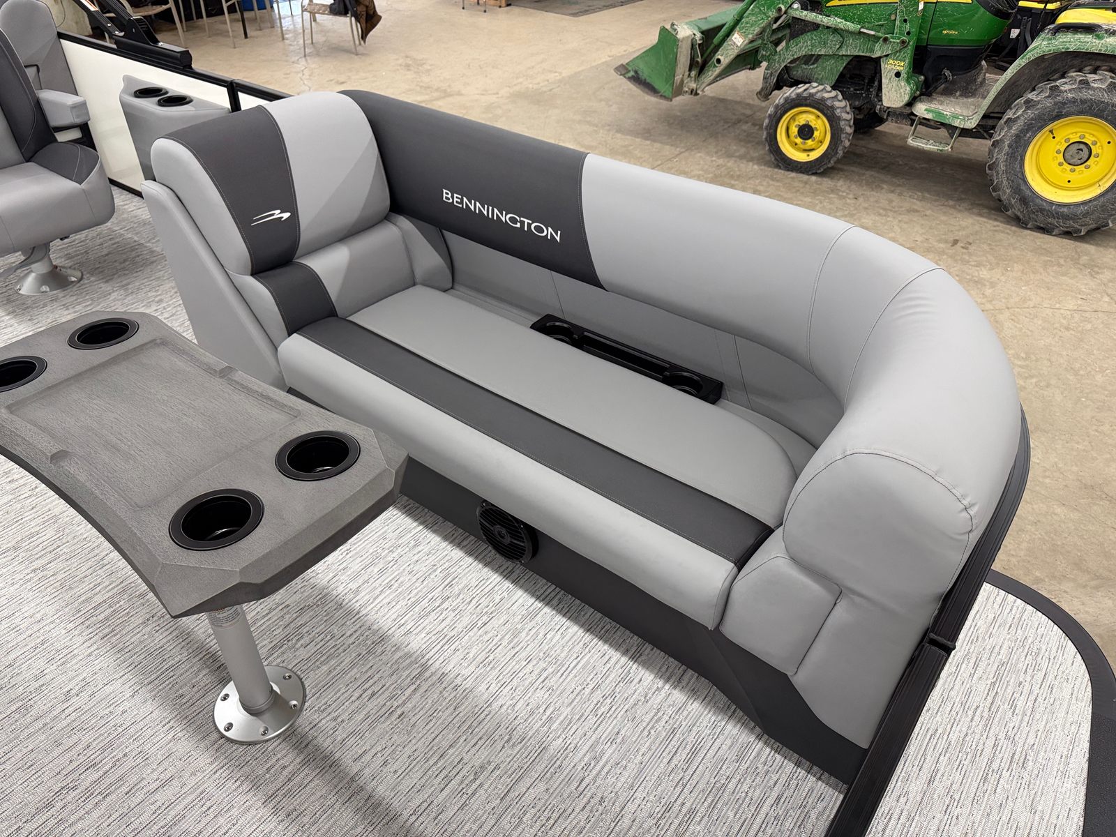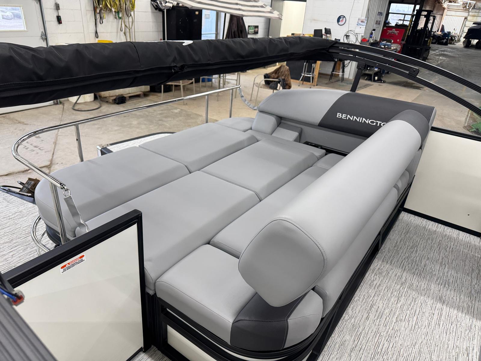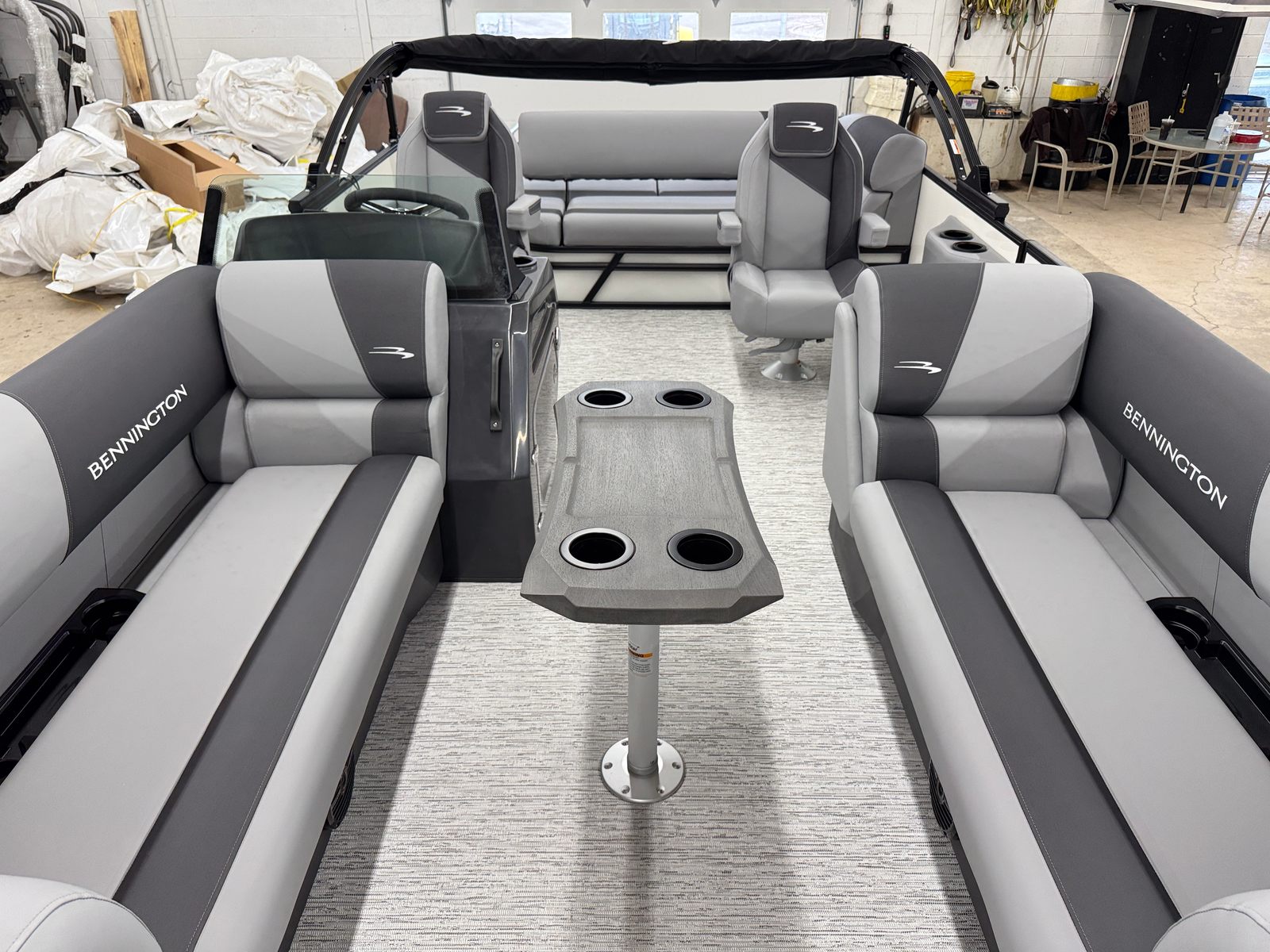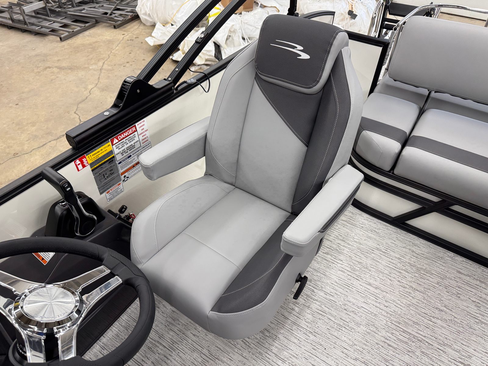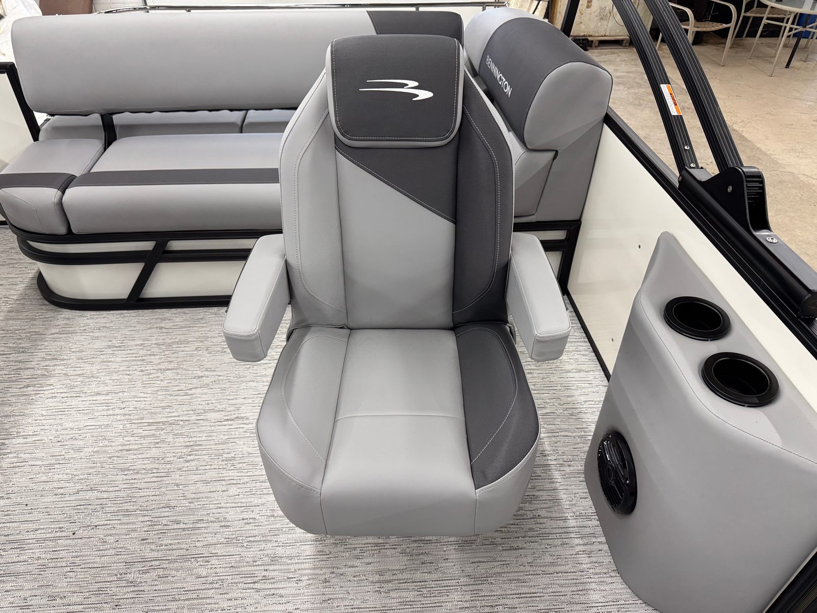 The Bennington 21 SSB SPS is packed with special features designed to maximize convenience, safety, and enjoyment. The Water Fuel Separator Large and Water Fuel Separator Box work together to keep your engine running clean and efficiently, reducing maintenance and ensuring longevity. The single switch battery system offers straightforward power management, making it easy to operate and maintain your boat’s electrical systems. The blackout logos and smooth metallic white panels not only enhance the boat’s aesthetics but also reflect Bennington’s commitment to quality and style. The canvas in midnight black and shadow grey provides durable protection from the elements, while the ironwood dash accent adds a touch of elegance to the helm.