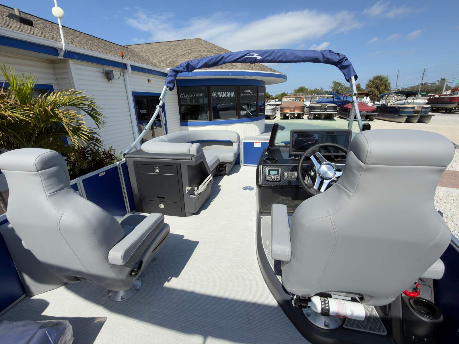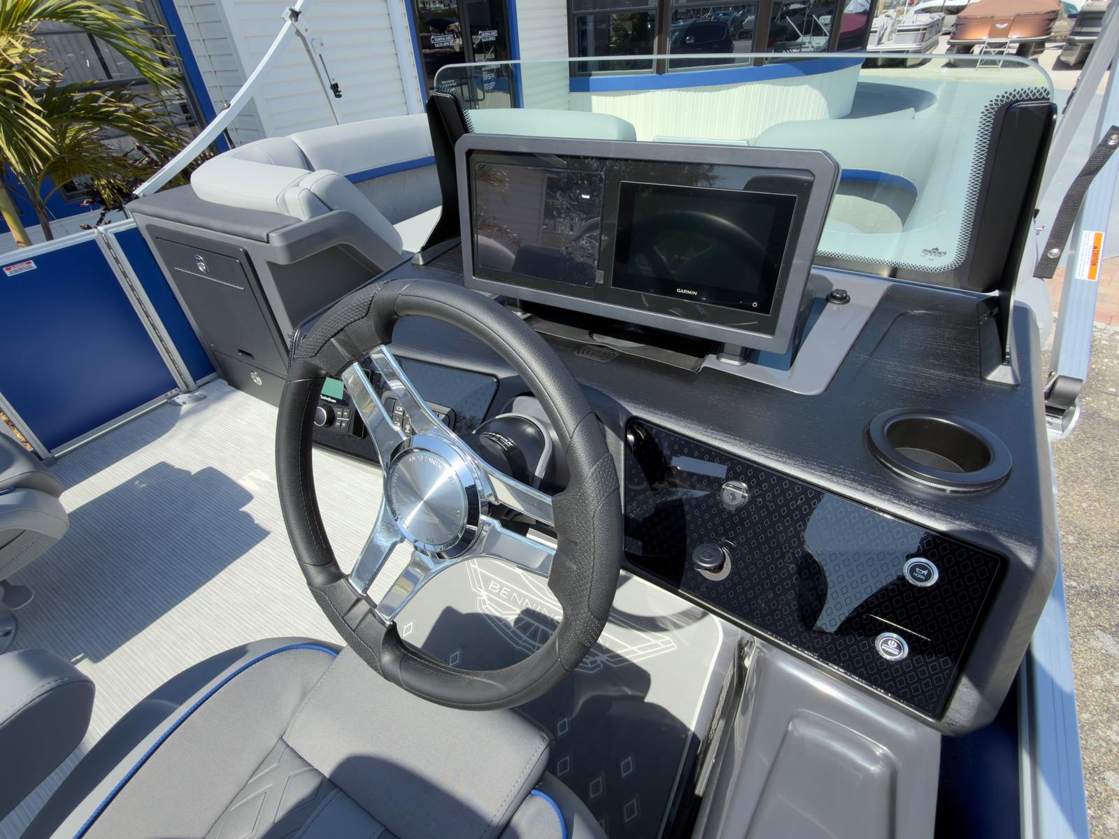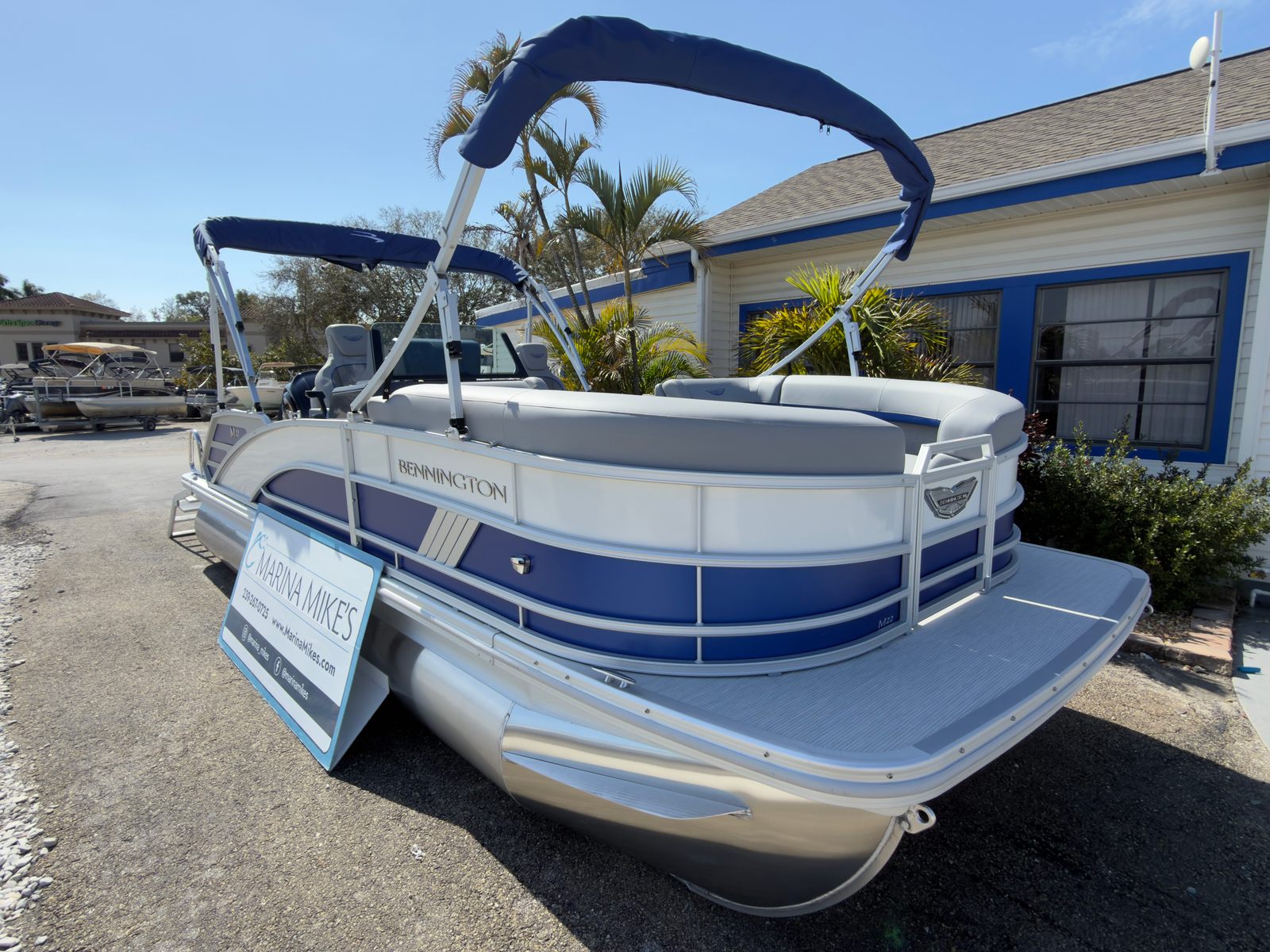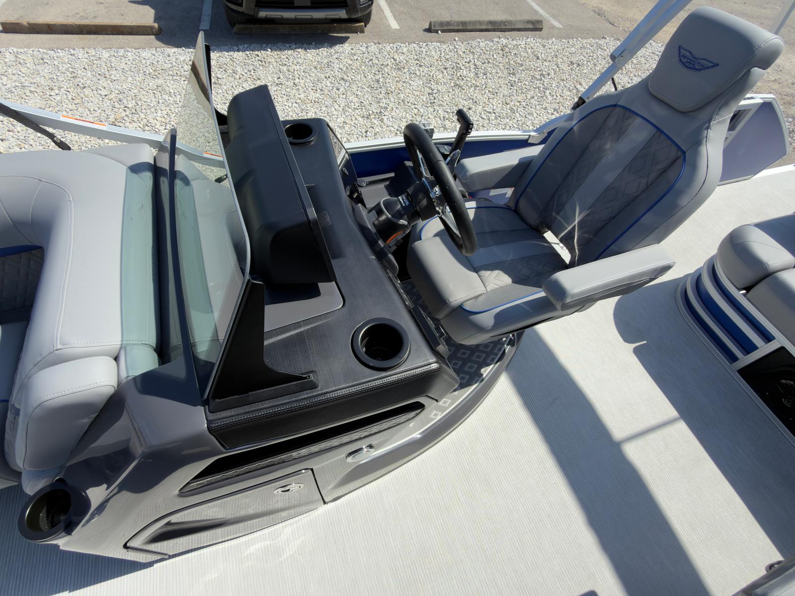 The Bennington 22 MSB SPS is loaded with special features that set it apart from other pontoon boats for sale. The Sunshine Package bathes the deck in natural light, creating a bright and inviting atmosphere for all your guests. The elevated console with Pocket Mythos provides a commanding view and intuitive control layout, ensuring you’re always in charge of your journey. The base furniture from the M Series offers plush comfort and sophisticated style, while the Zebrawood Matte Slate accents add a touch of modern elegance.A striking accent in Smooth Metallic White and Celeste Grey complements the overall aesthetic, making this Bennington boat for sale a true head-turner on the water. The double curved Bimini, stretching an impressive 15 feet, offers generous shade and protection from the sun, so you can enjoy long days on the lake or river in comfort. The panel in Smooth Matte Luminous Blue adds a final flourish of style, ensuring your pontoon stands out wherever you go.