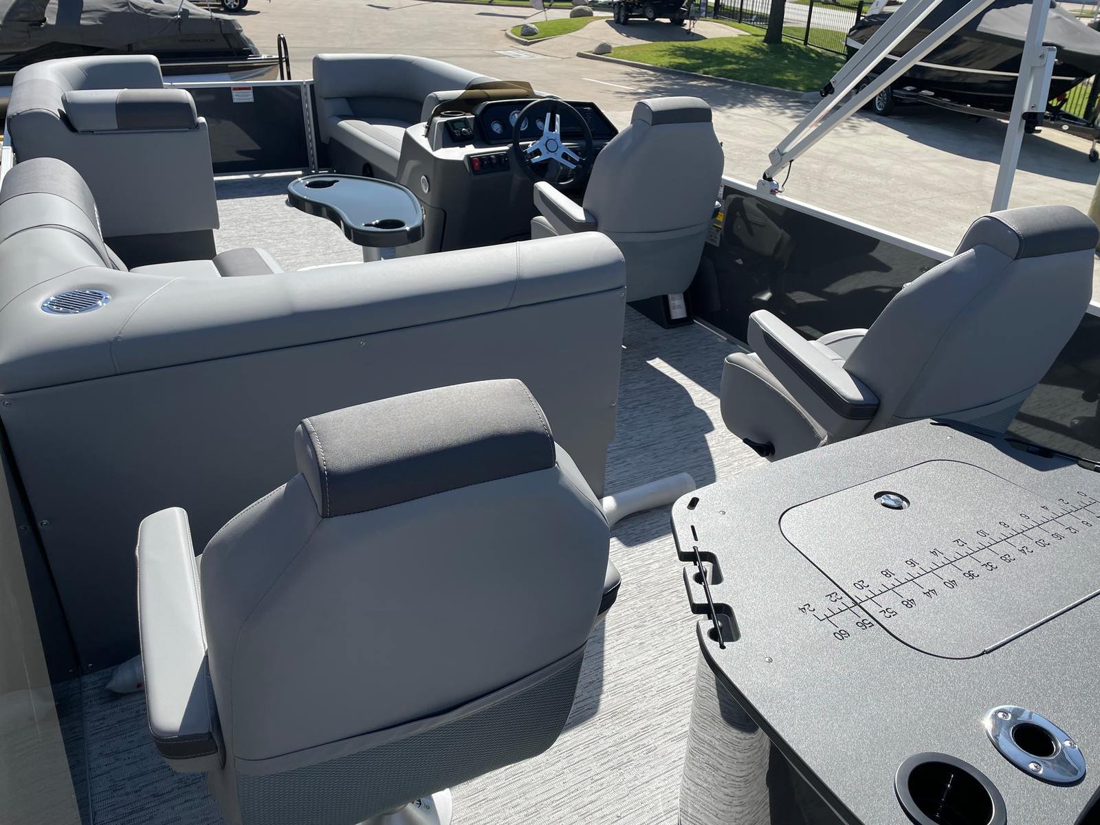 The 2026 Bennington 22 SS SPS stands out with its impressive length of nearly 23 feet, offering ample space for relaxation and recreation. As a new model, it showcases the latest advancements in pontoon design, ensuring you benefit from cutting-edge technology and modern aesthetics. The sleek Shadow Grey and Carbon color scheme, complemented by Ironwood dash accents, gives this Bennington boat for sale a sophisticated and contemporary look that will turn heads at any marina or lakeside dock.
