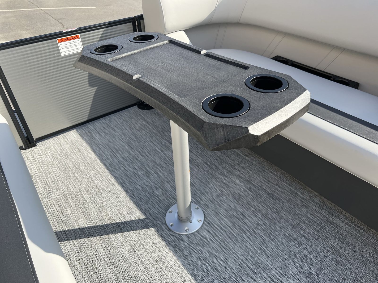 Step aboard and discover a host of special features designed to maximize comfort, convenience, and enjoyment. The analog rocker switching and Veethree gauges provide intuitive control and easy monitoring of your boat’s systems. Navigation is a breeze with the Garmin Echomap 52CV Chartplotter, ensuring you always know your location and can plan your route with confidence. The panel and canvas in Metallic Silver, paired with Leon Light Silver accents, create a sophisticated and modern aesthetic. Blackout logos and the Blackout Luxe Package add a touch of elegance and exclusivity, making this pontoon truly stand out on the water.