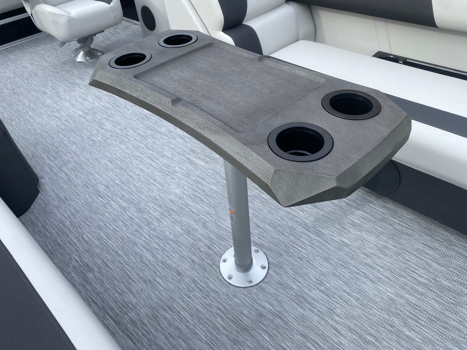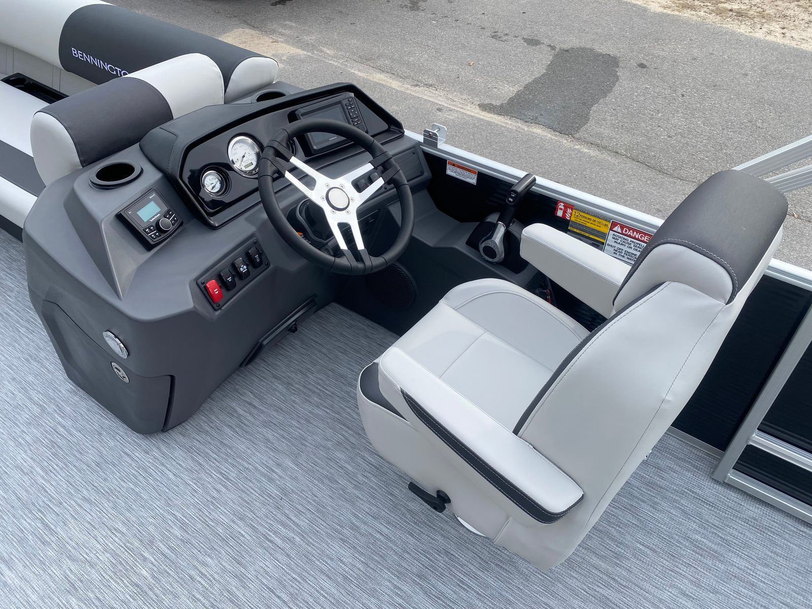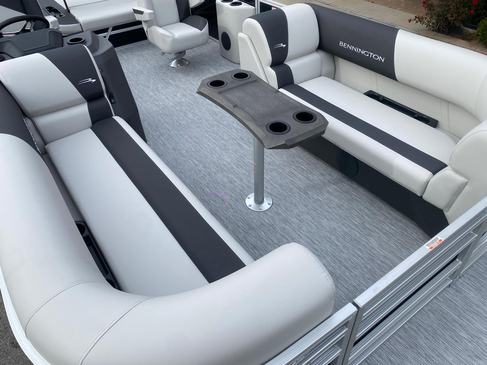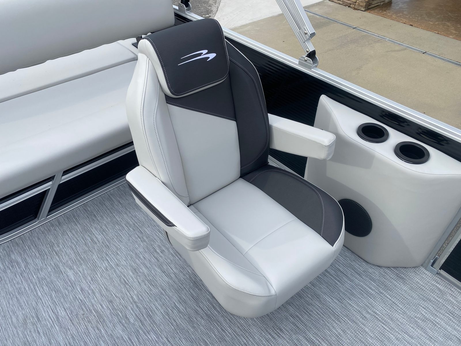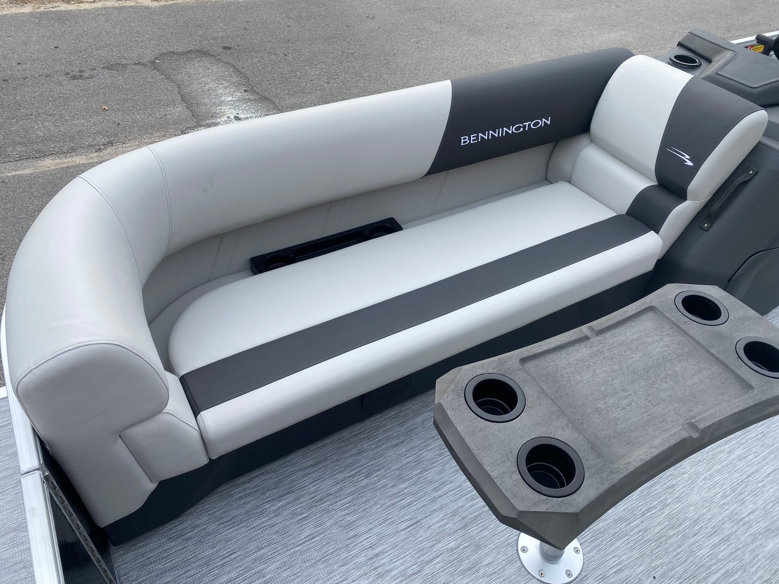 The Bennington 22 SSB SPS is loaded with special features that elevate both comfort and convenience. The Gemini Black paneling and Midnight Black canvas give the boat a bold, contemporary look that turns heads at every dock. Inside, the Leon Light Silver and Slate Simtex accents create a refined and relaxing environment, while the Ironwood dash accent adds a touch of elegance to the helm. The wireless charger ensures your devices stay powered throughout your adventures, keeping you connected and entertained on the water. The ski tow bar, specifically designed for the SPS package, makes it easy to enjoy watersports with family and friends.
