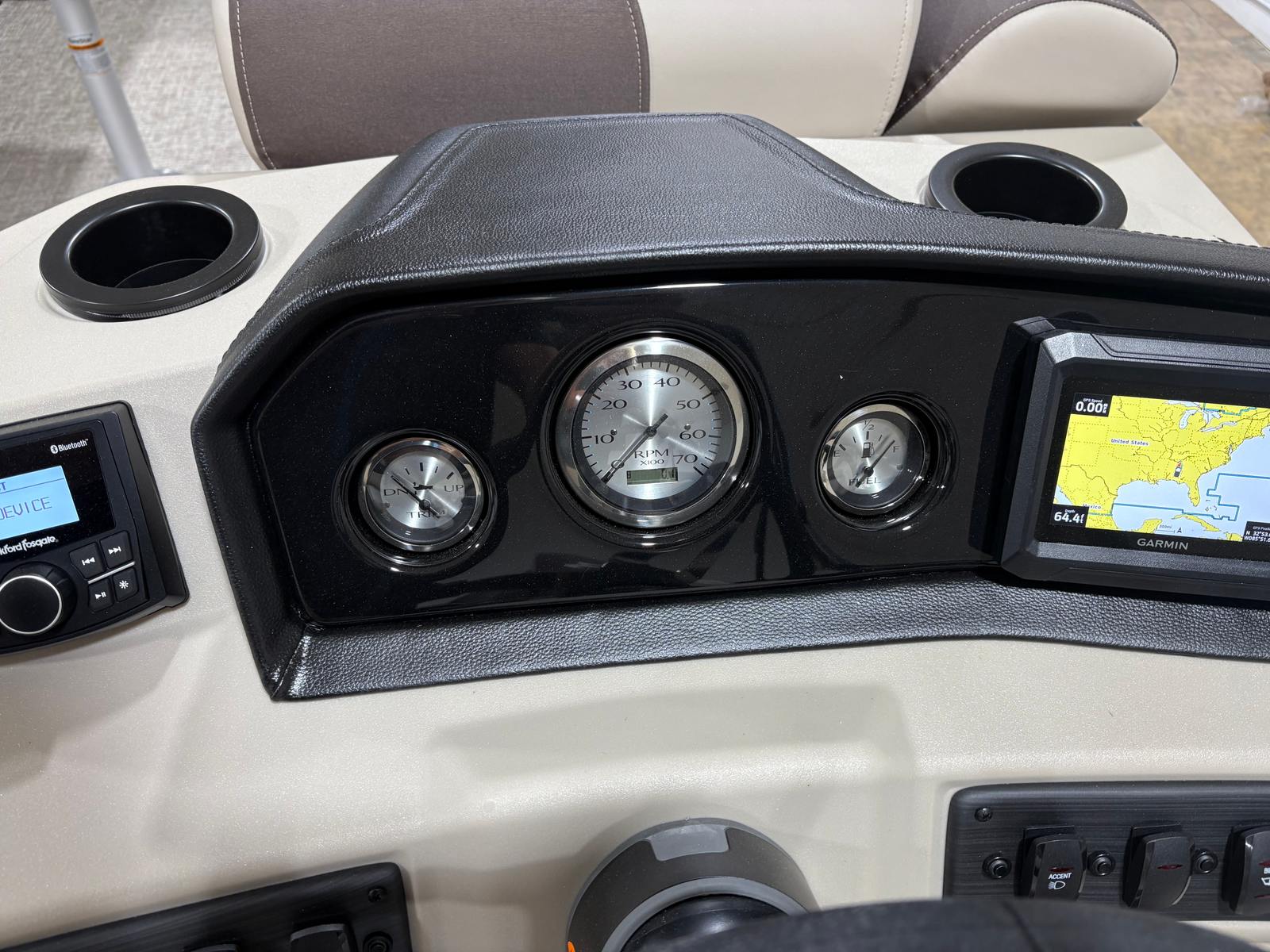 This pontoon boat for sale is as practical as it is stylish. The generous in-floor storage makes it easy to stow away life jackets, water toys, and personal items, keeping the deck clear for relaxation and activities. Docking is a breeze thanks to the responsive handling and manageable length, making it ideal for both seasoned boaters and newcomers. The SPS Performance Package enhances fuel efficiency, so you can spend more time exploring and less time worrying about refueling.The durable midnight black canvas and blackout logos not only add visual appeal but also provide protection from the elements, ensuring your investment stays looking sharp season after season. The analog gauges and Garmin chartplotter simplify navigation, giving you confidence whether you’re exploring new waters or returning to your favorite spot. Every feature is designed to make ownership easy, enjoyable, and worry-free.