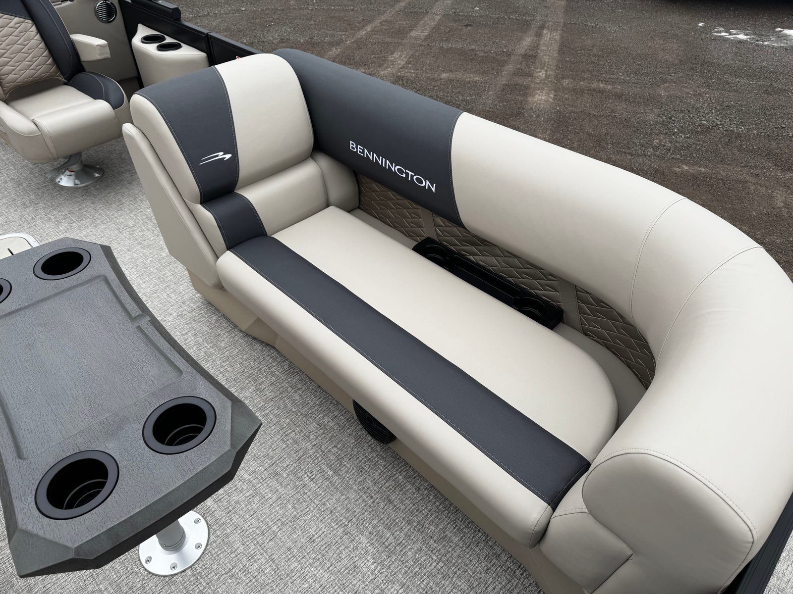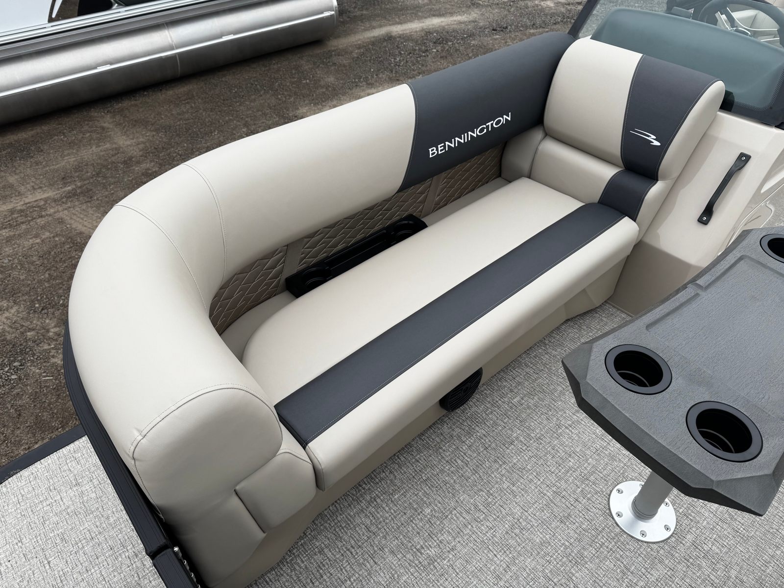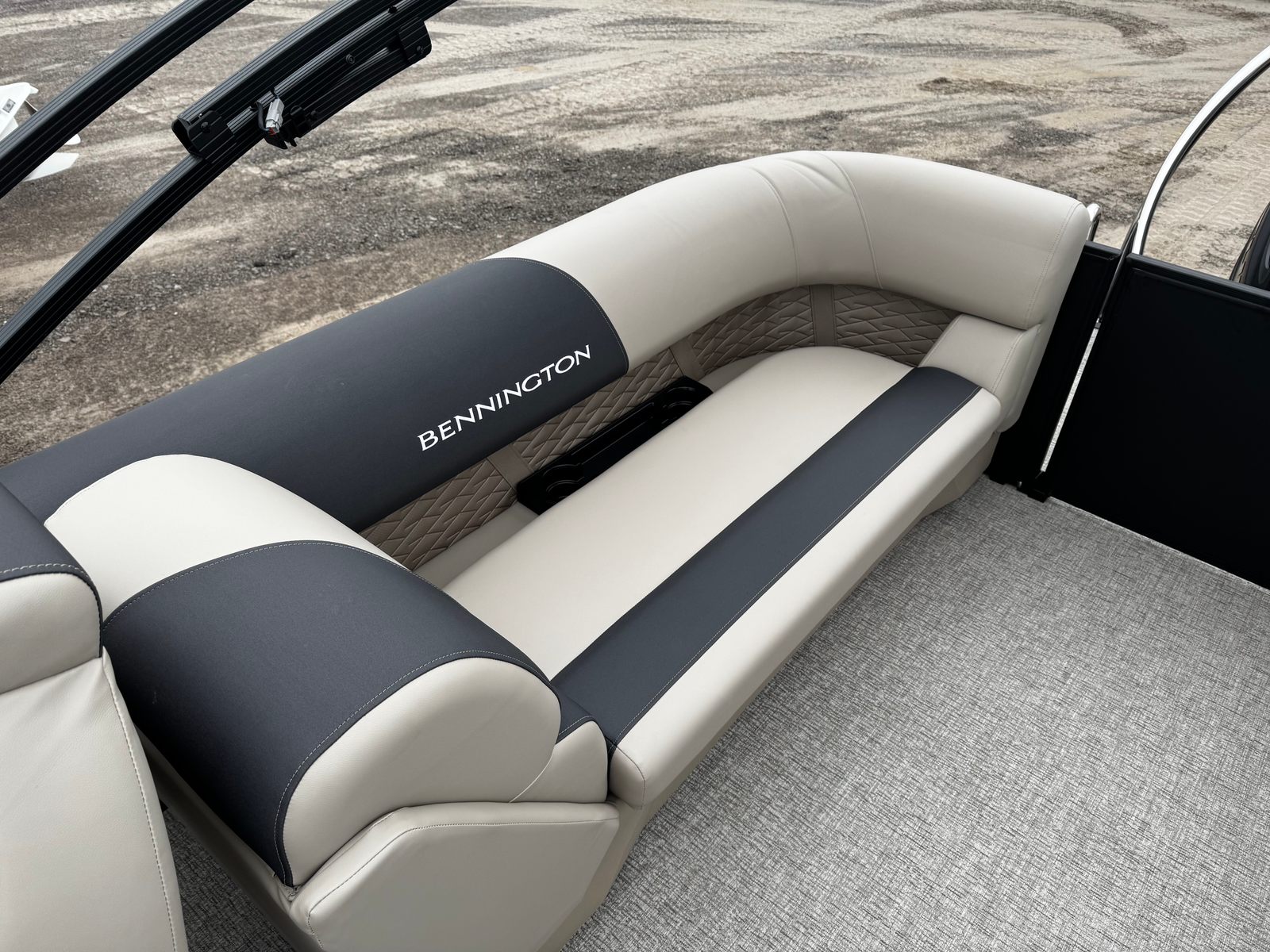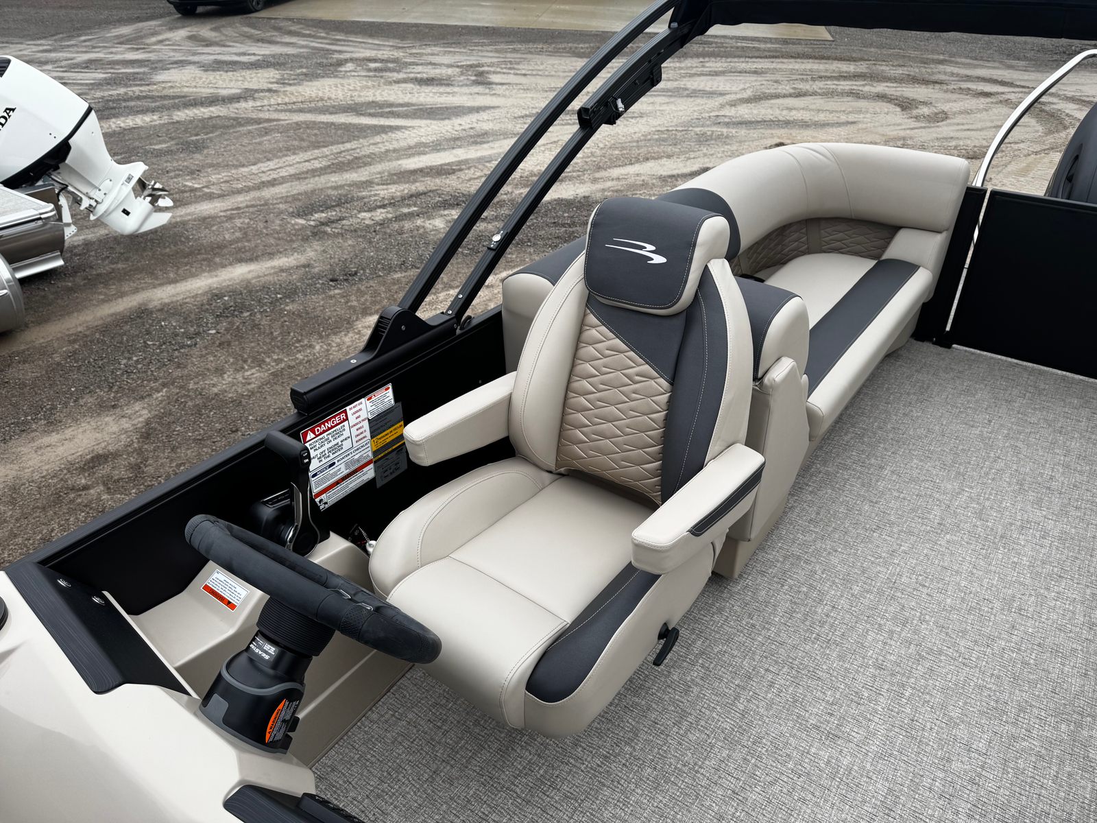 The Bennington 22 SSR SPS is loaded with premium features designed to elevate your time on the water. The removable flag pole with an American flag adds a patriotic touch, perfect for holiday weekends and special occasions. The single-switch battery system offers convenience and peace of mind, ensuring your boat is always ready for adventure.Aesthetically, the Blackout Logos and Blackout Luxe Package give this pontoon a sophisticated, modern look that turns heads wherever you go. The Accent in Smooth Metallic Sorrel and the Canvas in Midnight Black create a striking visual contrast, while the Dolce upholstery and Ironwood Dash Accent add a touch of elegance and comfort to the interior. Every detail is thoughtfully crafted to enhance both the visual appeal and the onboard experience.