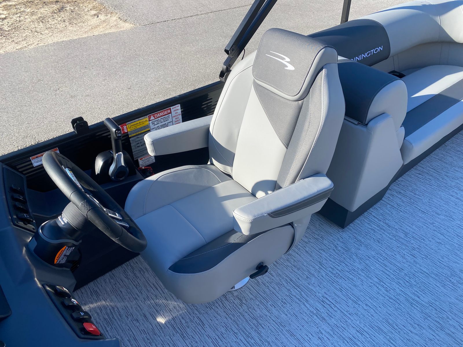 The Bennington 22 SSR SPS is packed with special features that elevate your boating experience. The Gemini Black panel and Smooth Metallic Silver accent create a striking exterior, while the Shadow Grey and Mythos Grey base and accent colors add depth and sophistication. Blackout logos contribute to the boat’s modern aesthetic, ensuring it stands out in any marina.Inside, the Serene Soft Touch Vinyl with Simtex Accents offers plush seating that’s both comfortable and durable. This premium upholstery is designed to withstand the elements while providing a luxurious feel for all passengers. The Midnight Black canvas adds a touch of elegance and provides shade when needed, enhancing your comfort during sunny days.A single battery switch ensures easy operation and reliable power management, making your boating experience hassle-free. Every detail, from the mechanical pre-rig to the blackout logos, has been thoughtfully designed to maximize both style and functionality.