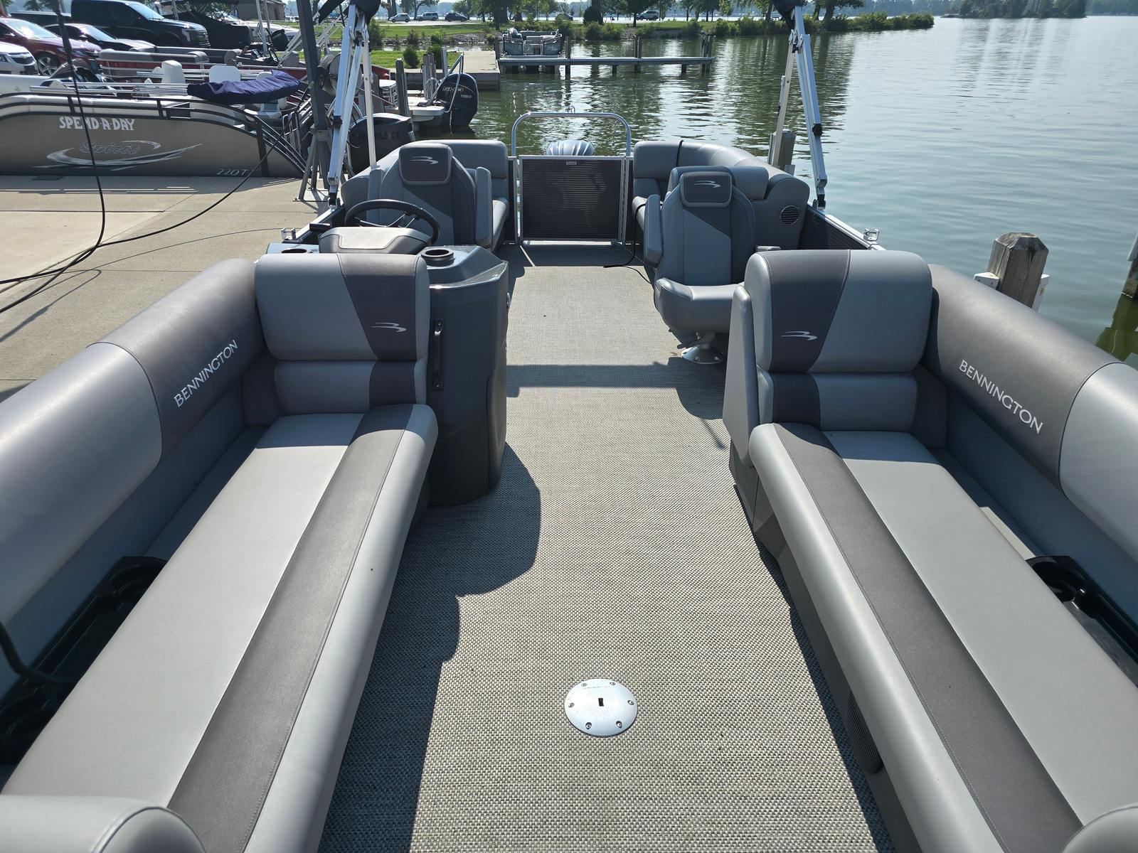 This Bennington boat for sale is loaded with features designed to enhance comfort, style, and functionality. The base furniture is upholstered in premium Simtex material, offering a soft yet durable seating surface that stands up to the elements. Both the captain's chair and co-captain's recliner are finished in Shadow Grey and Carbon, providing ergonomic support and a touch of luxury for those long days on the water. The captain's chair recliner ensures that the driver enjoys maximum comfort and control, while the co-captain's recliner invites passengers to relax and take in the scenery.The dimensional brushed logo and Anthracite paneling add a refined touch to the boat's exterior, while the Seagrass Silver full flooring provides a stylish, slip-resistant surface that is easy to clean and maintain. The thoughtful combination of base and accent colors in Shadow Grey and Carbon creates a cohesive and contemporary look throughout the vessel. Every detail, from the textured panels to the high-quality upholstery, reflects Bennington's commitment to excellence and innovation.