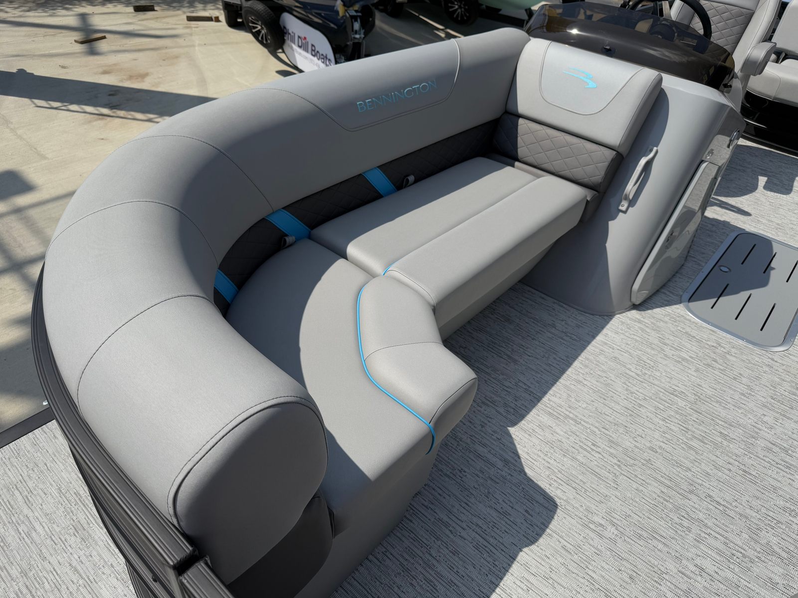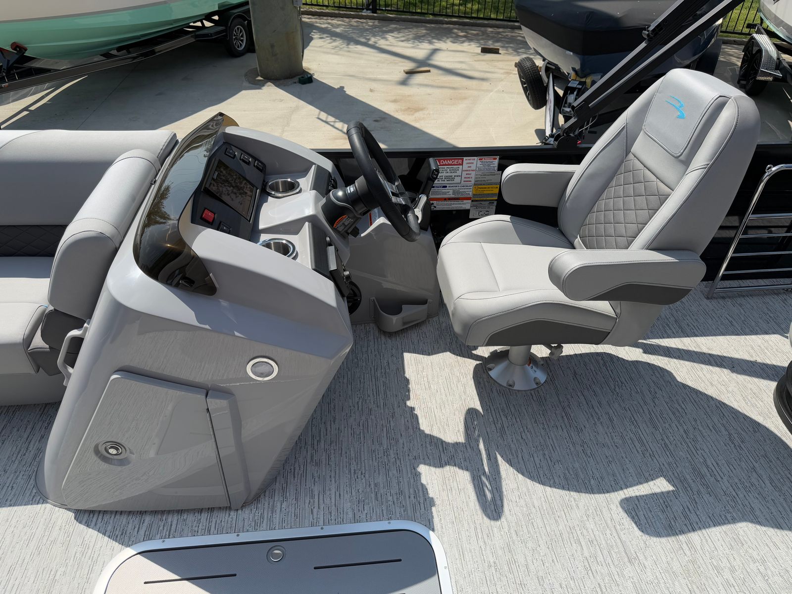 The Bennington 22 Sxsb SPS is loaded with premium features that elevate your boating experience. The portable armrest with stainless steel cup holders adds a touch of convenience and luxury, ensuring that your favorite beverages are always within reach. Rub rail protectors safeguard your pontoon’s exterior, maintaining its pristine appearance even after frequent docking. The RGB toe kick lighting and RGB controller SX allow you to customize the ambiance on board, creating a vibrant and inviting atmosphere for evening cruises or celebrations.For music lovers, the Rockford Fosgate M1 lighted speakers deliver crystal-clear sound and dynamic lighting effects, transforming your pontoon into a floating entertainment hub. The zebrawood matte slate accents and canvas in midnight black provide a sophisticated and modern aesthetic, while the blackout logos add a bold finishing touch. Every detail of the Bennington 22 Sxsb SPS is thoughtfully designed to enhance both style and functionality, making it a top choice among pontoon boats for sale.