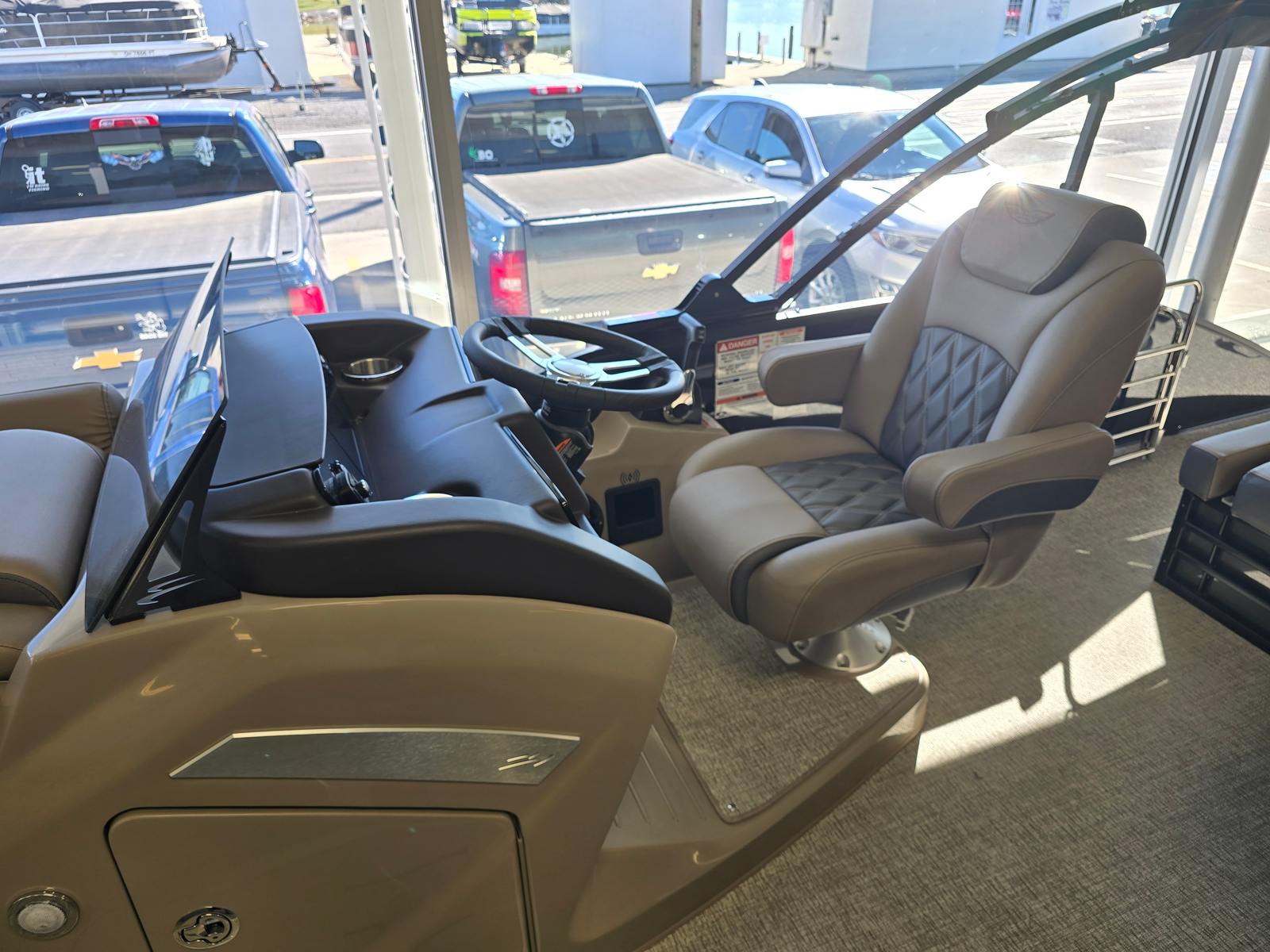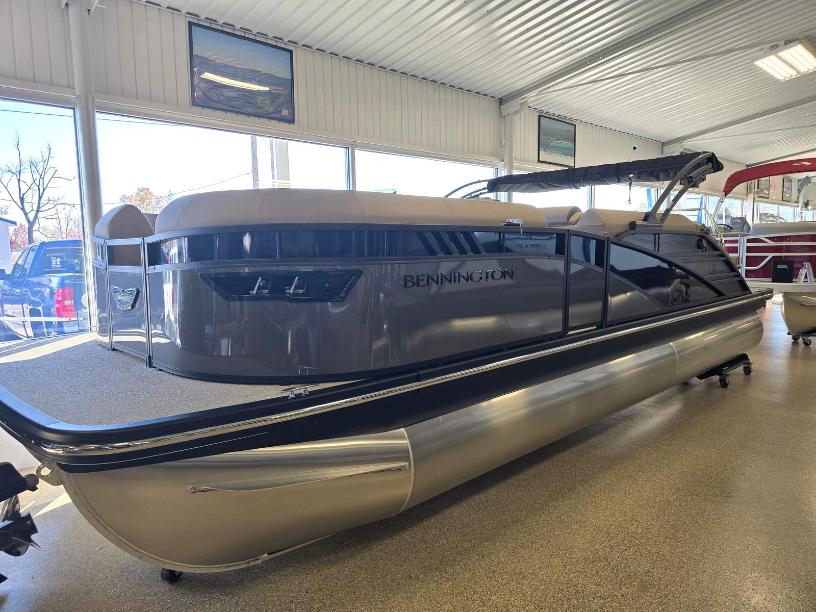 This Bennington boat for sale is loaded with premium features that elevate your boating experience. The removable flag pole with an American flag adds a patriotic touch, perfect for holiday outings and special occasions. The power hydraulic assist steering enhances control and reduces fatigue, allowing you to focus on fun and relaxation. For music lovers, the aft stereo control unit lets you manage your playlist from the rear of the boat, ensuring the perfect soundtrack for every adventure.Accent lighting creates a warm and inviting ambiance as the sun sets, while the blackout logos and midnight black canvas give the boat a sleek, modern appearance. The electric power top curved LXS bimini provides shade at the touch of a button, offering protection from the sun without interrupting your day on the water. The platinum Simtex upholstery, paired with the pillowtop diamond-stitched upgrade, delivers unmatched comfort and sophistication, making every seat the best in the house. The stainless steel rub rail not only adds a touch of elegance but also protects your investment from everyday bumps and scrapes.