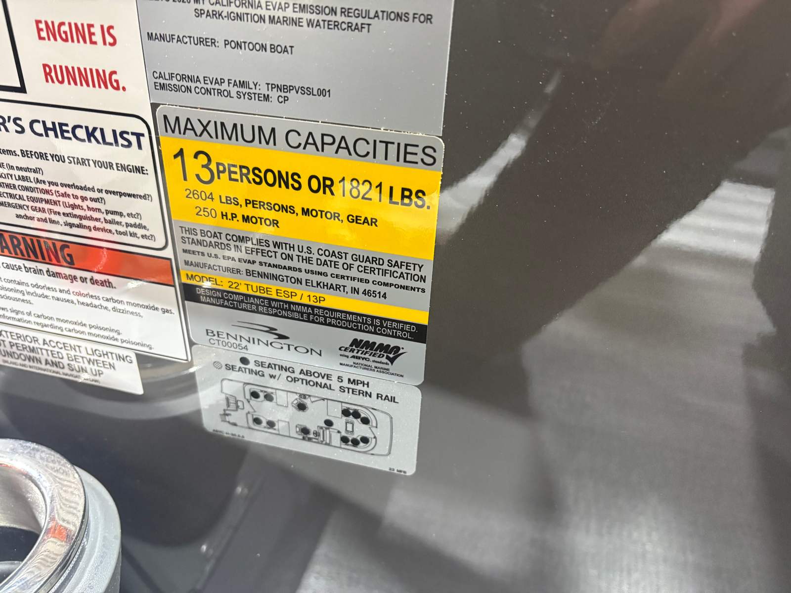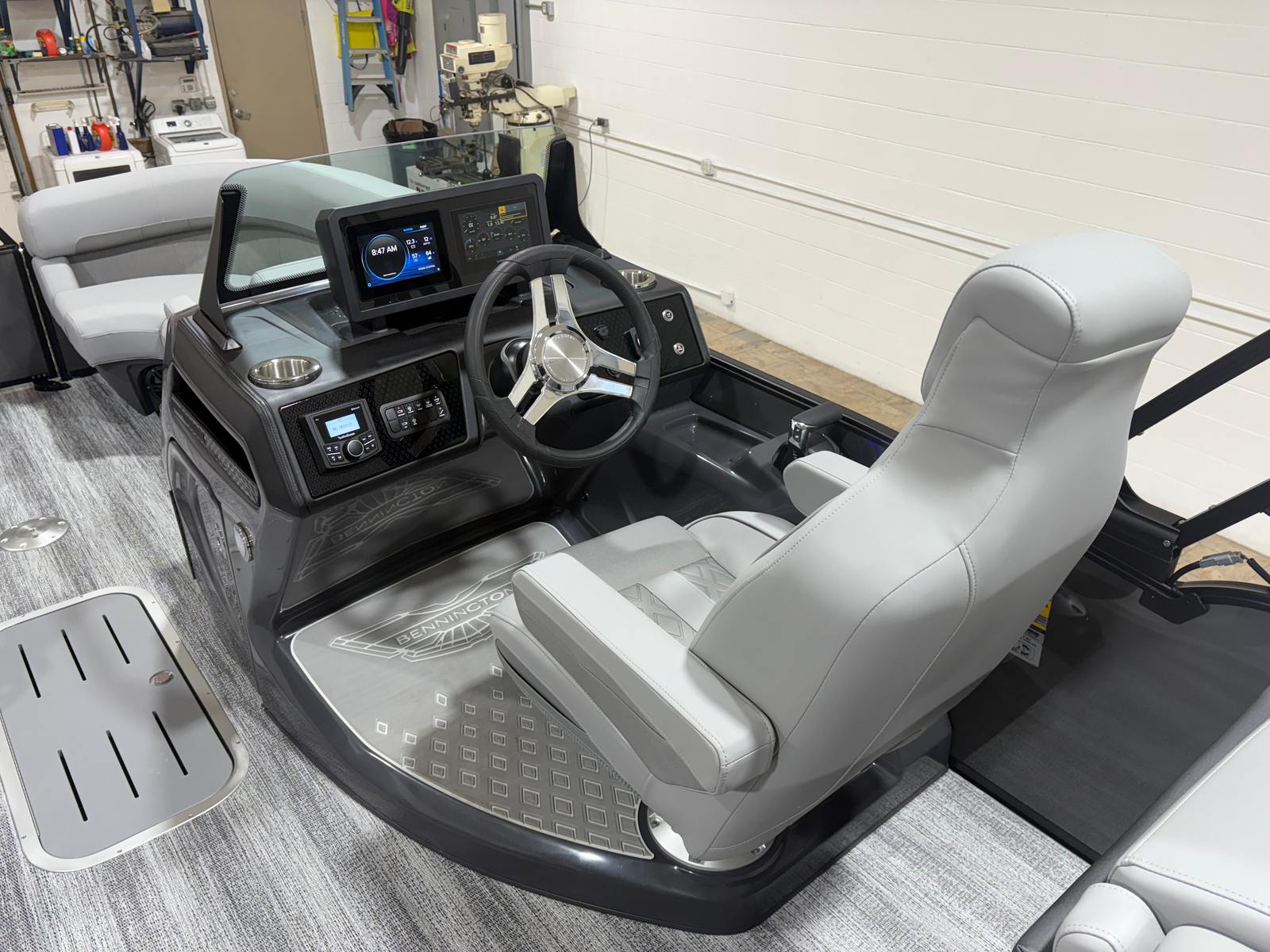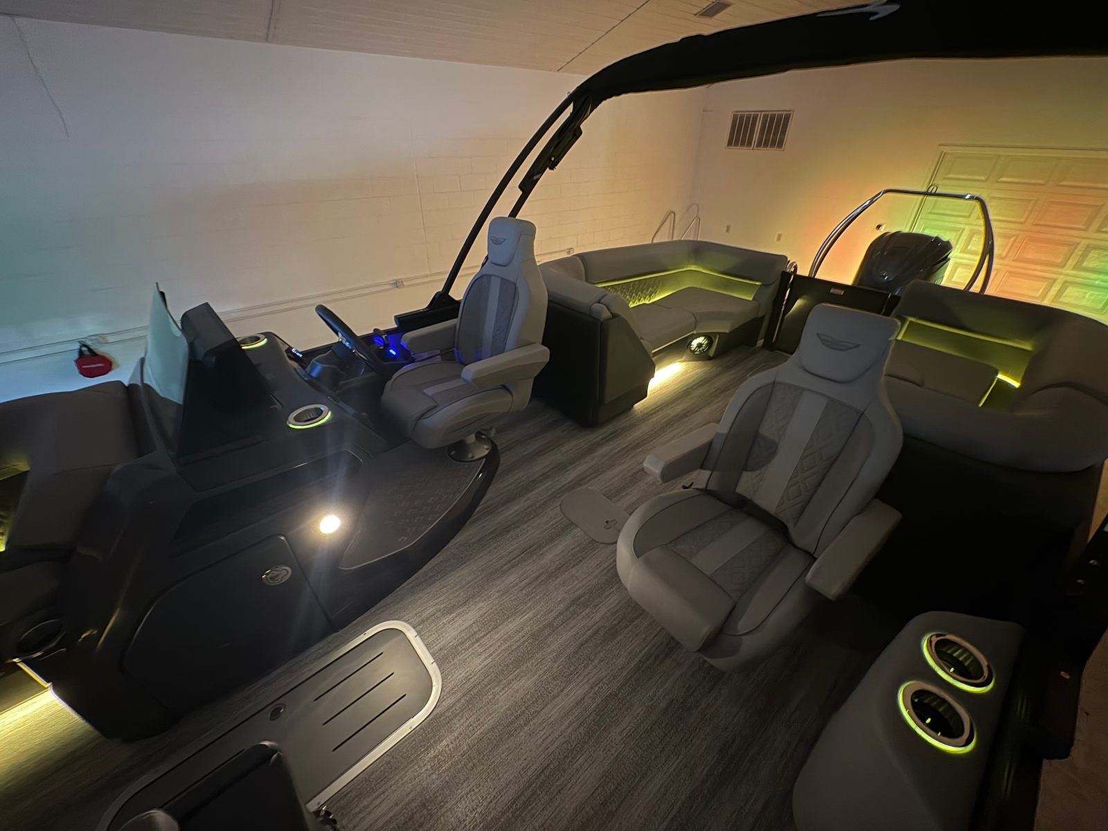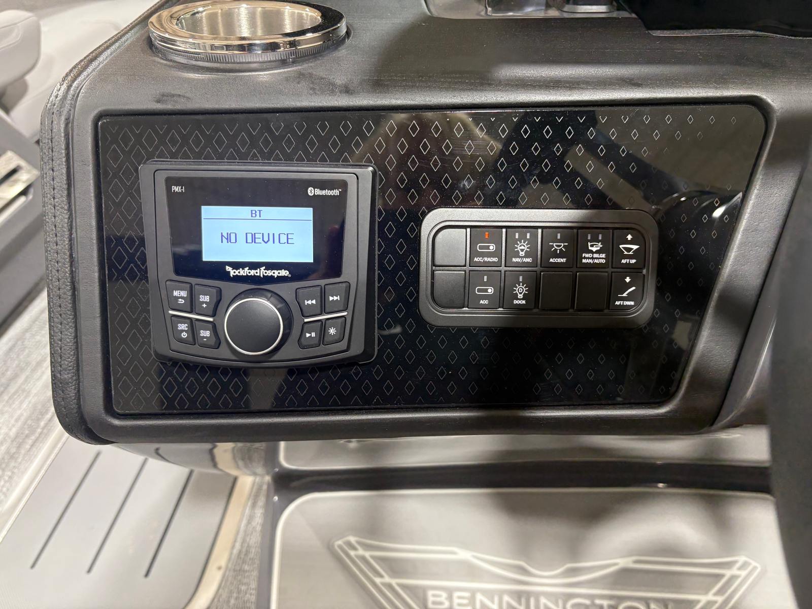 The Bennington 23 MFB ESP is loaded with premium features designed to enhance every aspect of your time on the water. The RBG Control M Series allows you to customize the ambiance with vibrant lighting options, while exterior side lighting and underwater lighting create a stunning visual effect during evening cruises. Toekick lights, including three 41-inch and one 72-inch fixtures, add a sophisticated glow to the deck, ensuring safety and style after sunset.For those who love music, the Rockford Fosgate M1 lighted speakers (six in total) deliver crystal-clear sound, turning your pontoon into a floating entertainment hub. With twelve illuminated cupholders, your favorite beverages are always within reach, and the elevated console Mythos provides a commanding view and intuitive control of all onboard systems.The Bimini - Electric Power Top Curved 12B S/M in sleek black offers effortless shade and protection from the sun, allowing you to relax in comfort no matter the weather. Every detail of this Bennington pontoon boat is designed to maximize enjoyment, convenience, and luxury.