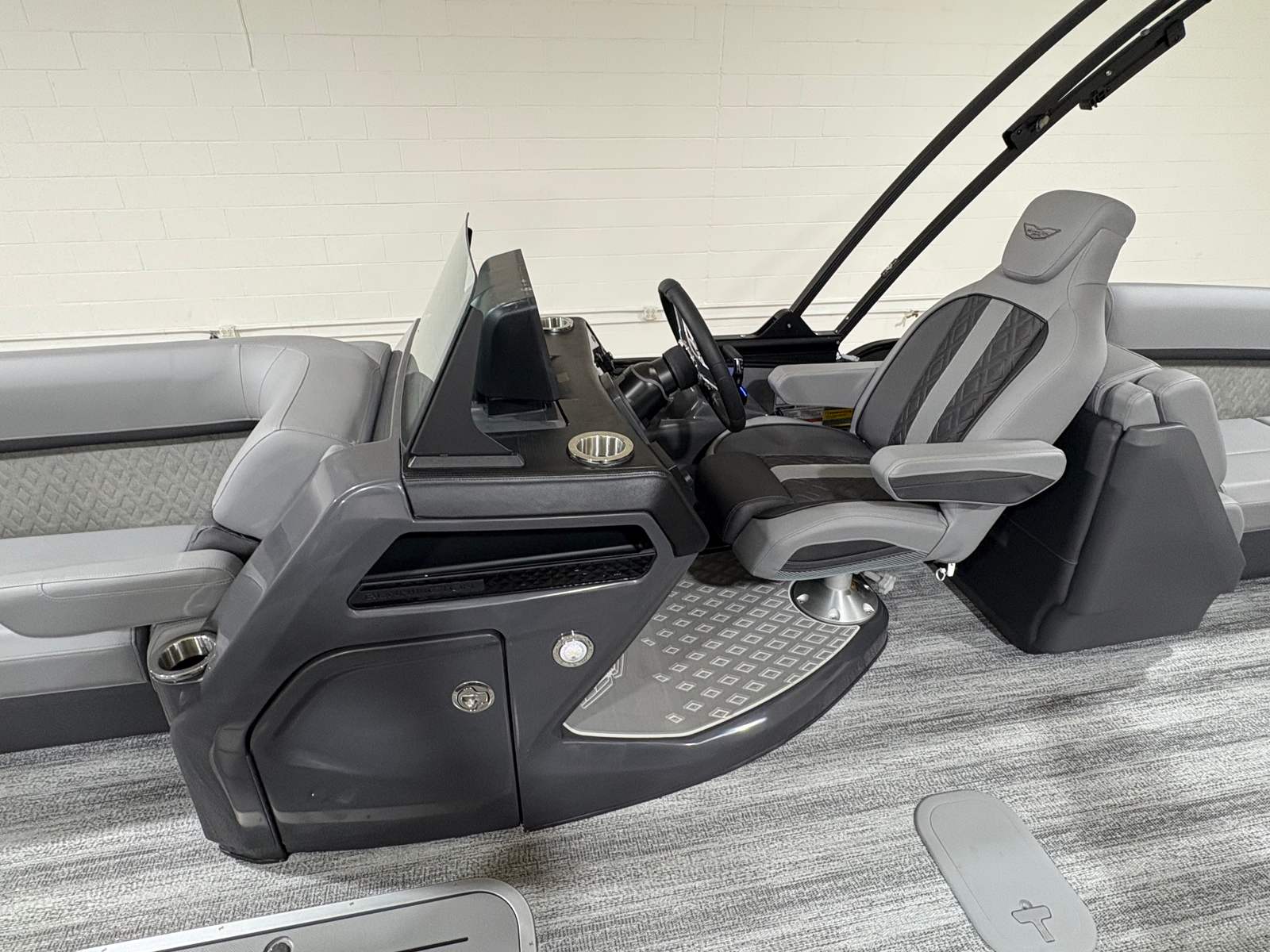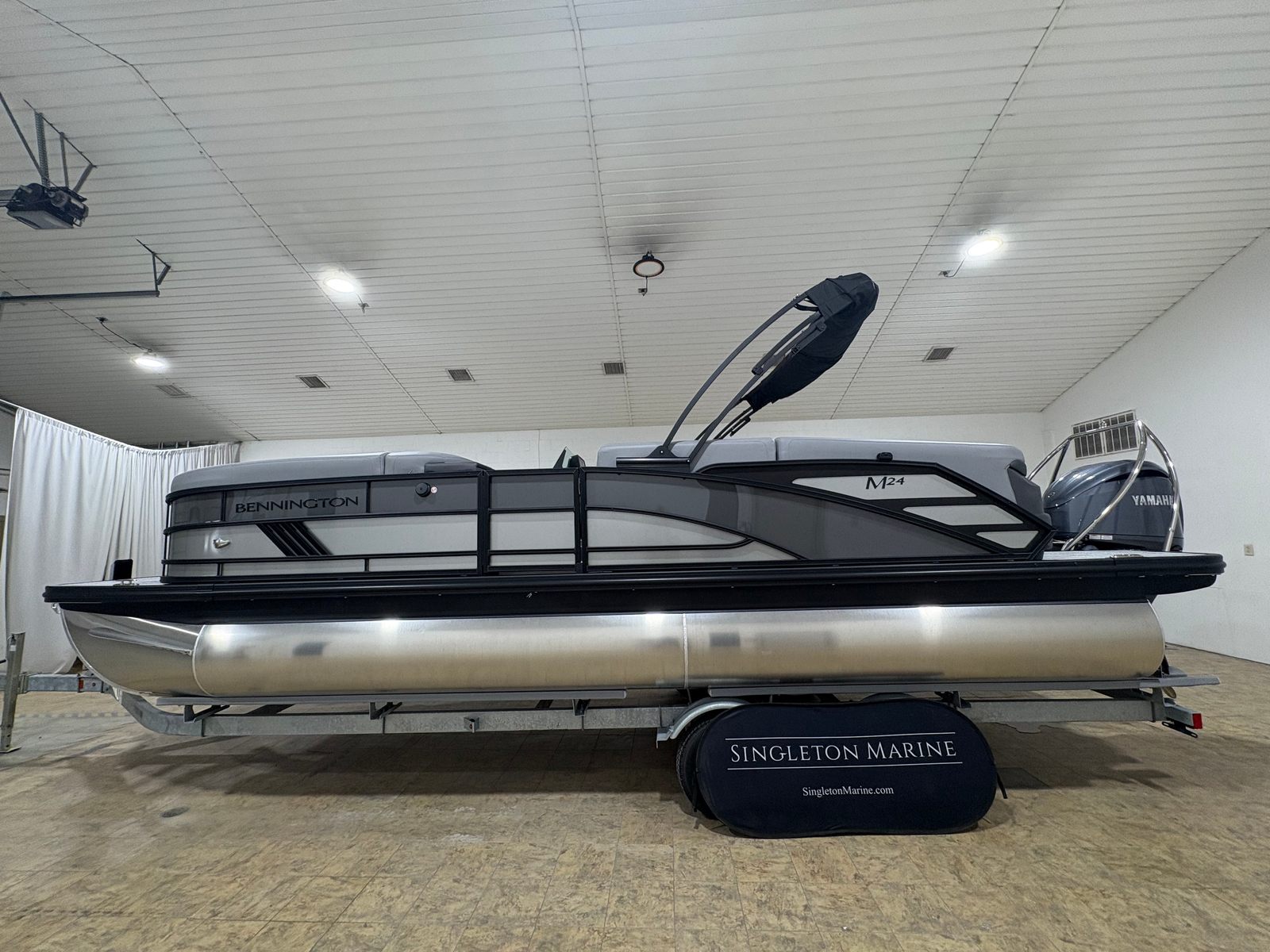 The Bennington 24 MFB ESP is packed with premium features designed to elevate your boating experience. The Elevated Console Mythos offers enhanced visibility and a commanding view of your surroundings, making navigation both intuitive and enjoyable. The Bimini - Electric Power Top Curved 12B S/M Blk provides effortless shade at the touch of a button, allowing you to adapt to changing weather conditions with ease.Exterior Side Lighting and the Blackout Luxe Package add a touch of modern elegance, ensuring your pontoon stands out both day and night. The Chaise Convenience Table creates a perfect spot for snacks and drinks, while the Canvas - Midnight Black and Interior Accent - Mythos Grey Simtex deliver a sleek, contemporary aesthetic. Black Logos and Toekick Lights (2-41" and 2-62") enhance the boat’s visual appeal, especially during evening cruises. The Port Bench Exchange maximizes seating flexibility, ensuring everyone on board enjoys comfort and convenience.
