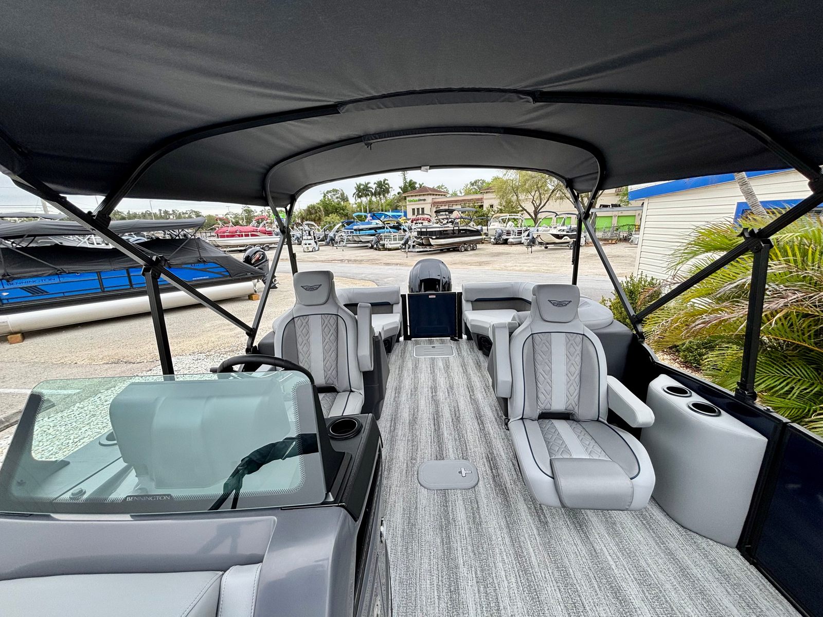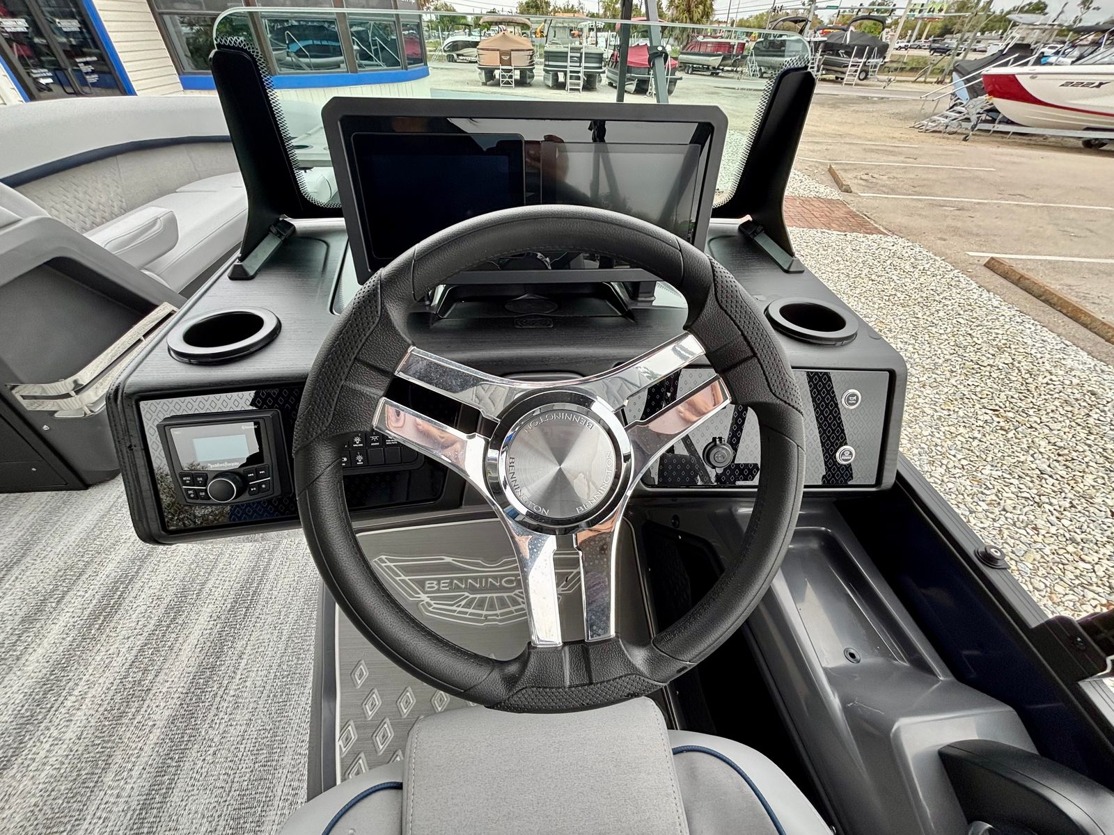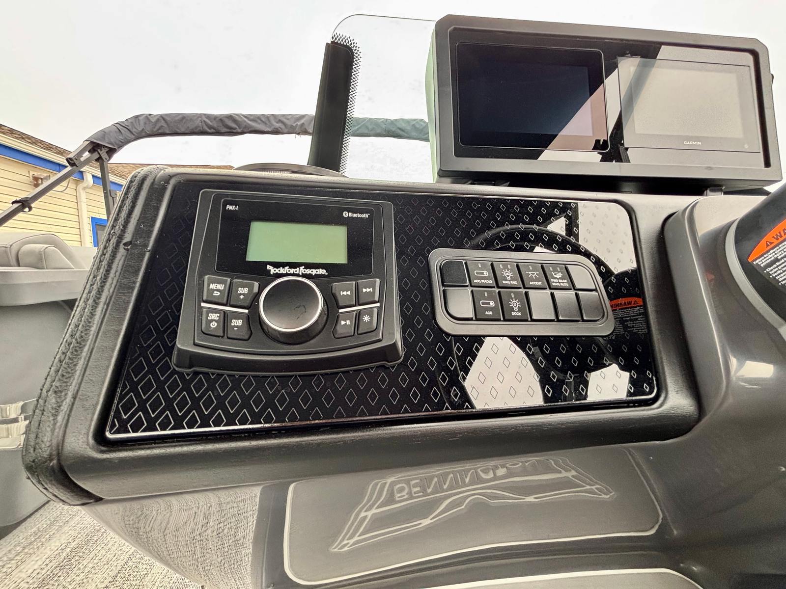 This Bennington boat for sale is loaded with premium features that set it apart from the competition. The Blackout Luxe Package enhances the boat’s visual appeal with sleek, modern accents, while the Sunshine Package ensures you and your guests can soak up the sun in style. The Bimini - Double 16.5' Blk provides generous shade on hot days, allowing you to relax comfortably no matter the weather. The Elevated Console with Pocket Mythos offers superior visibility and ergonomic control, making navigation effortless and enjoyable.Entertainment is at your fingertips with the Rockford Fosgate PMX-1R Head Unit Remote, complete with Sirius Satellite Radio. Whether you’re hosting a lively gathering or enjoying a quiet cruise, you’ll have access to your favorite music and entertainment options. The combination of Shoreline Grey flooring and Interior Accent - Midnight Blue Simtex upholstery creates a luxurious environment, while the Black Logos and Smooth Midnight Blue panels give the pontoon a bold, contemporary look.