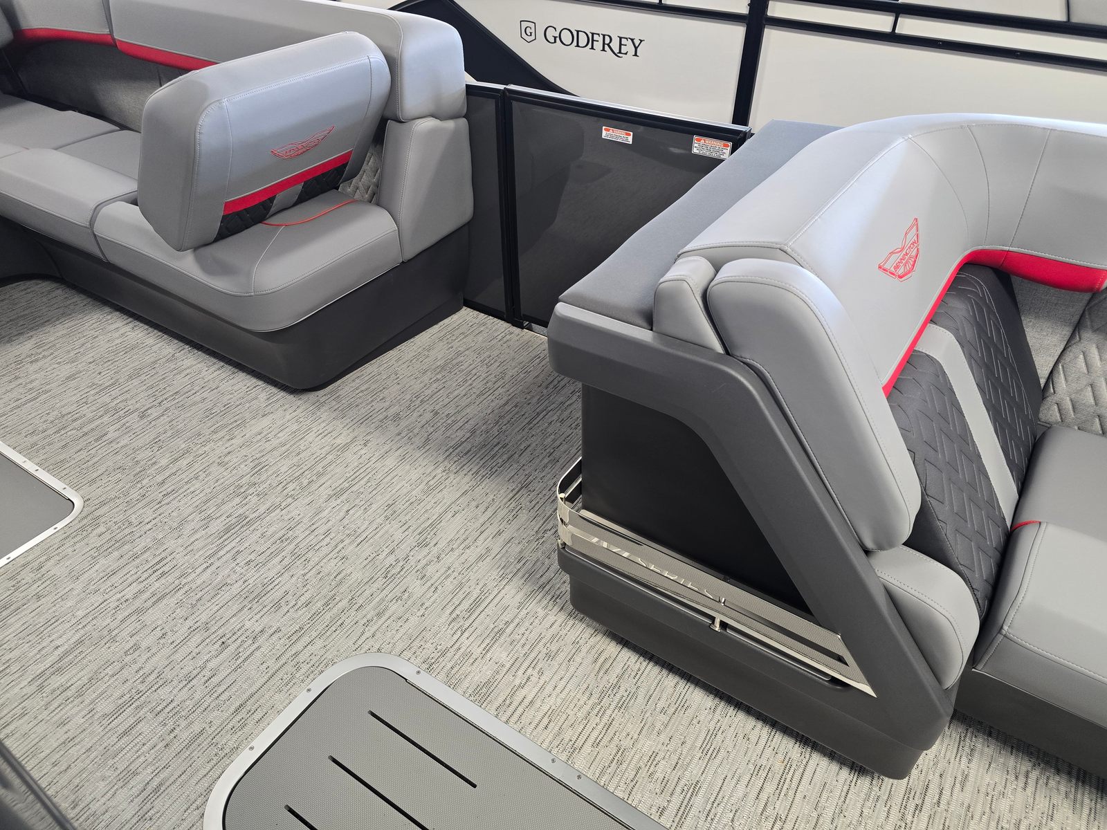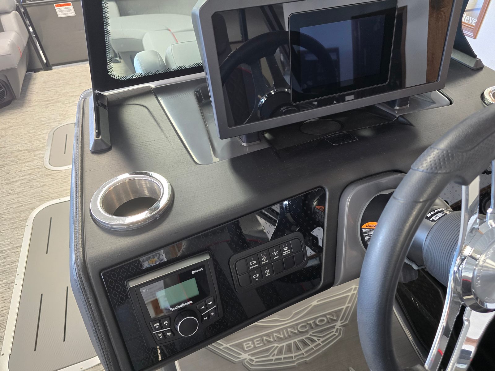 The Bennington 24 MSB SPS Plus is loaded with special features designed to maximize enjoyment and convenience on the water. The removable flag pole with American flag adds a patriotic touch, perfect for holiday outings and celebrations. The dual switch battery system with fuse ensures reliable power management, keeping your electronics and accessories running smoothly throughout your adventures. The elevated console with Pocket Mythos offers enhanced visibility and easy access to controls, while the Base Furniture M Series provides plush seating and ample storage for all your gear. The Zebrawood Matte Slate finish adds a touch of elegance, and the ski tow bar opens up endless possibilities for water sports fun.