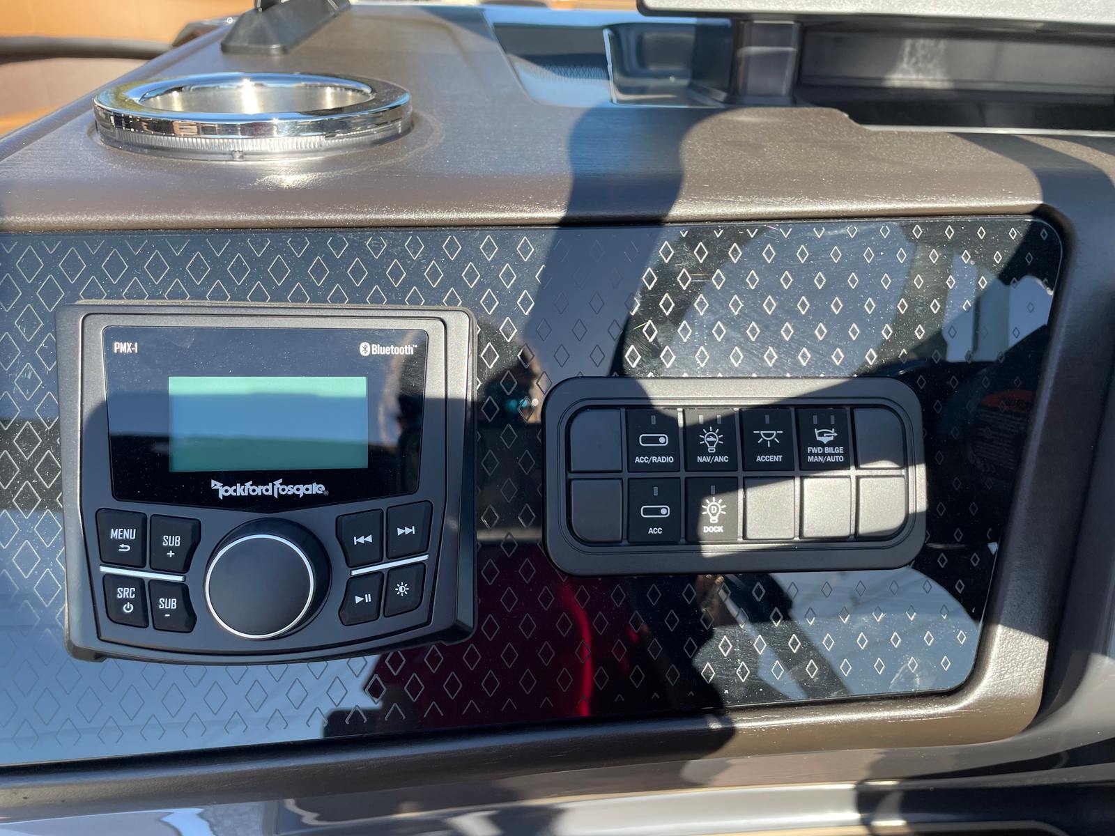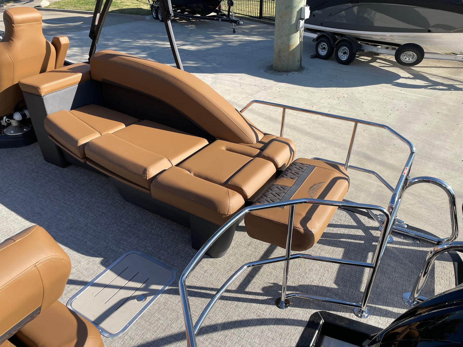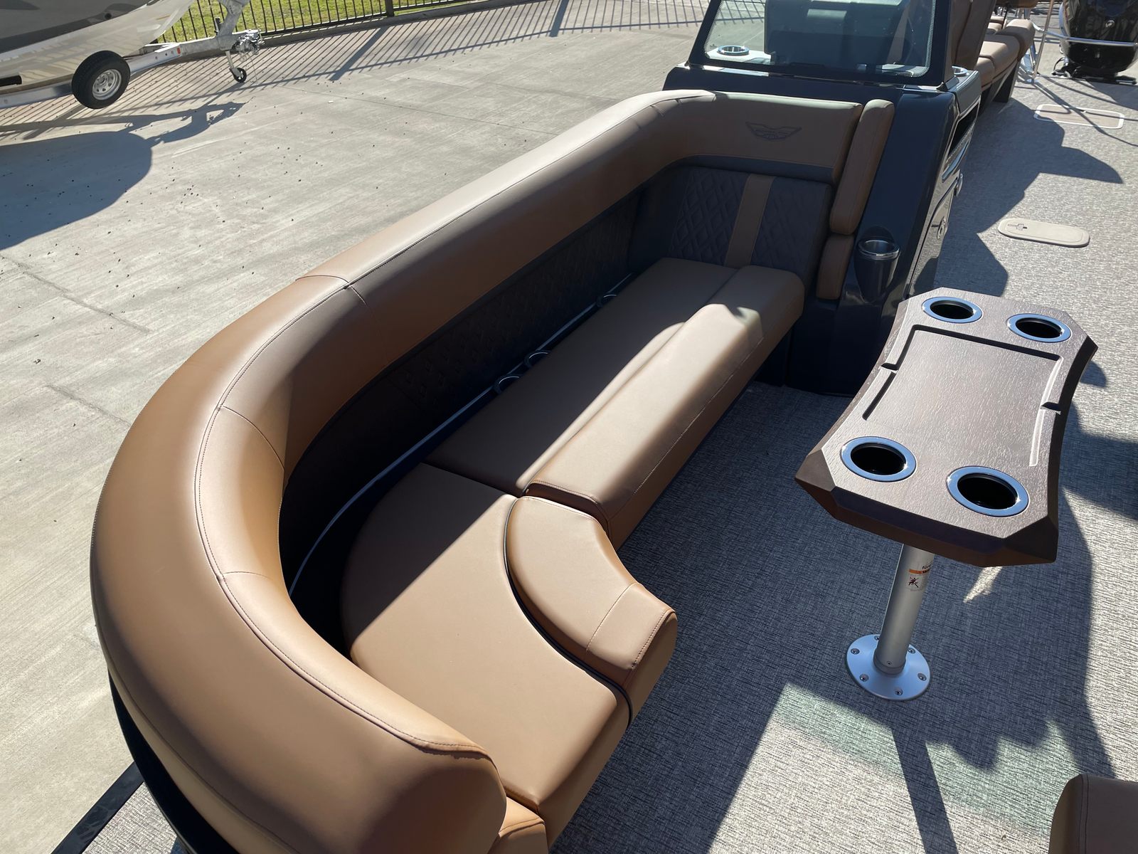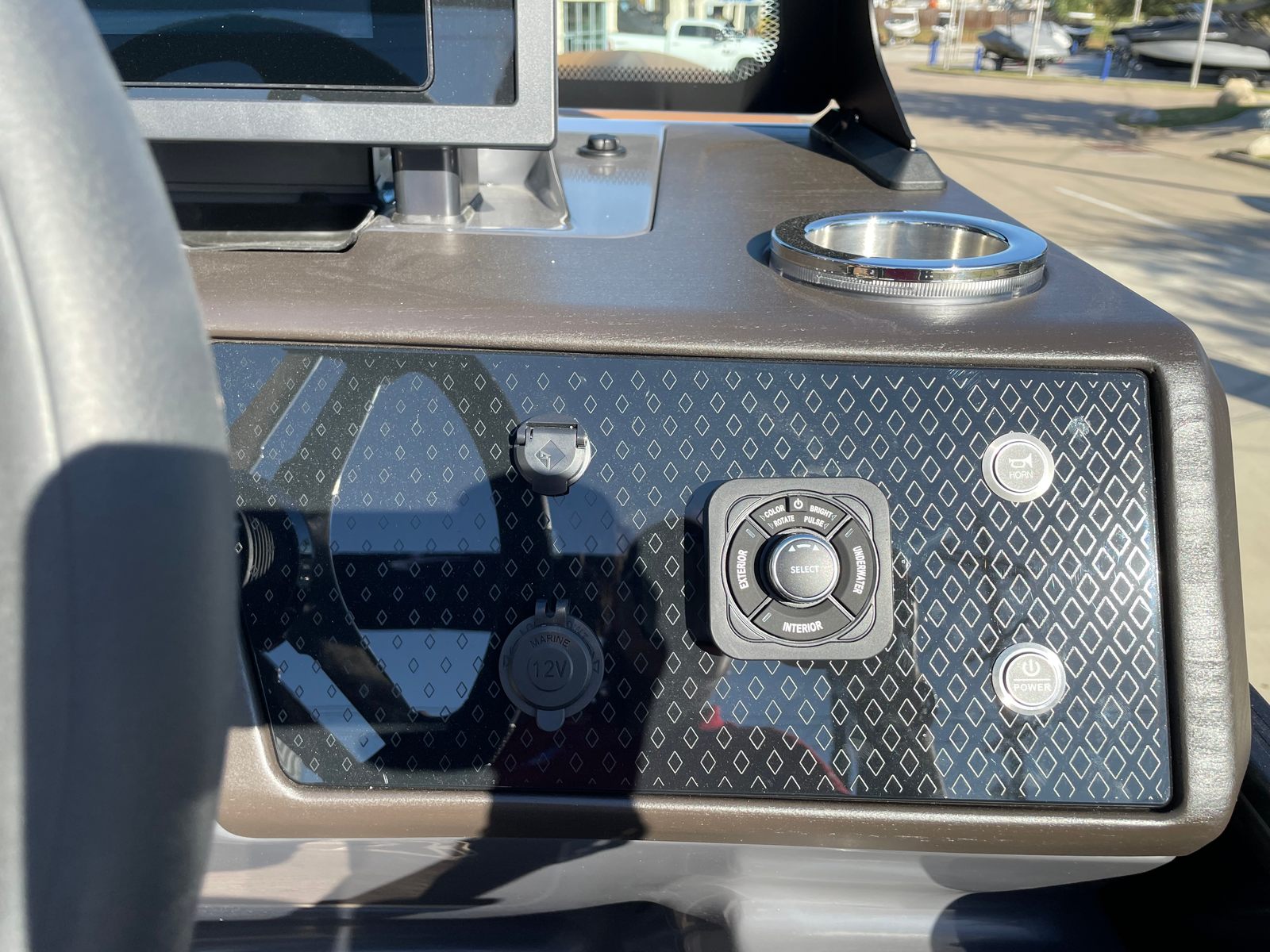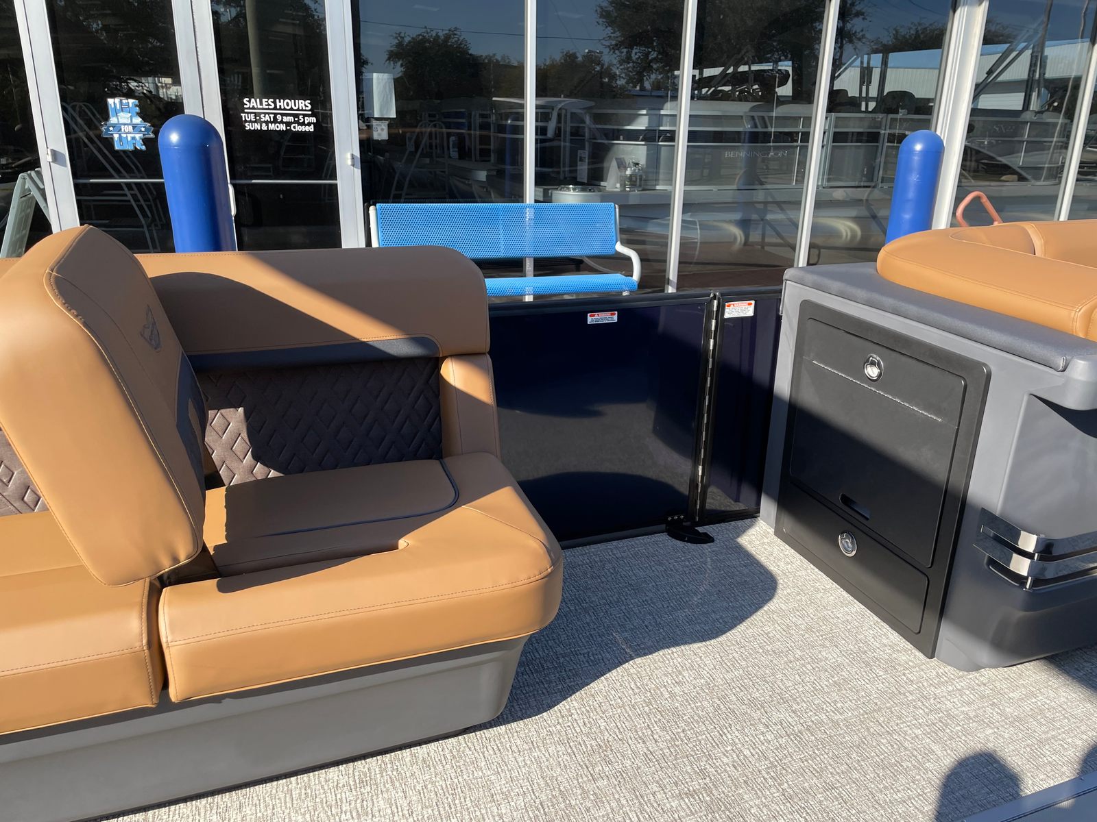 Step aboard the Bennington 24 MSL SPS Plus and discover a world of premium features designed to enhance every moment. The RGB Control M Series allows you to customize the ambiance with vibrant lighting, setting the mood for evening cruises or festive gatherings. Toekick lights add a touch of elegance and safety, illuminating pathways for easy movement around the deck. The Rockford Fosgate M1 Lighted Speakers deliver crystal-clear sound, transforming your pontoon into a floating entertainment hub, while illuminated cupholders keep your refreshments visible and accessible, even after sunset.The elevated console with Pocket Mythos offers ergonomic controls and convenient storage, ensuring everything you need is within reach. Canvas in Midnight Black provides stylish protection from the elements, while lumbar lighting adds a subtle glow for nighttime comfort. Every feature is thoughtfully integrated to maximize enjoyment and functionality, making this Bennington boat for sale a standout in its class.