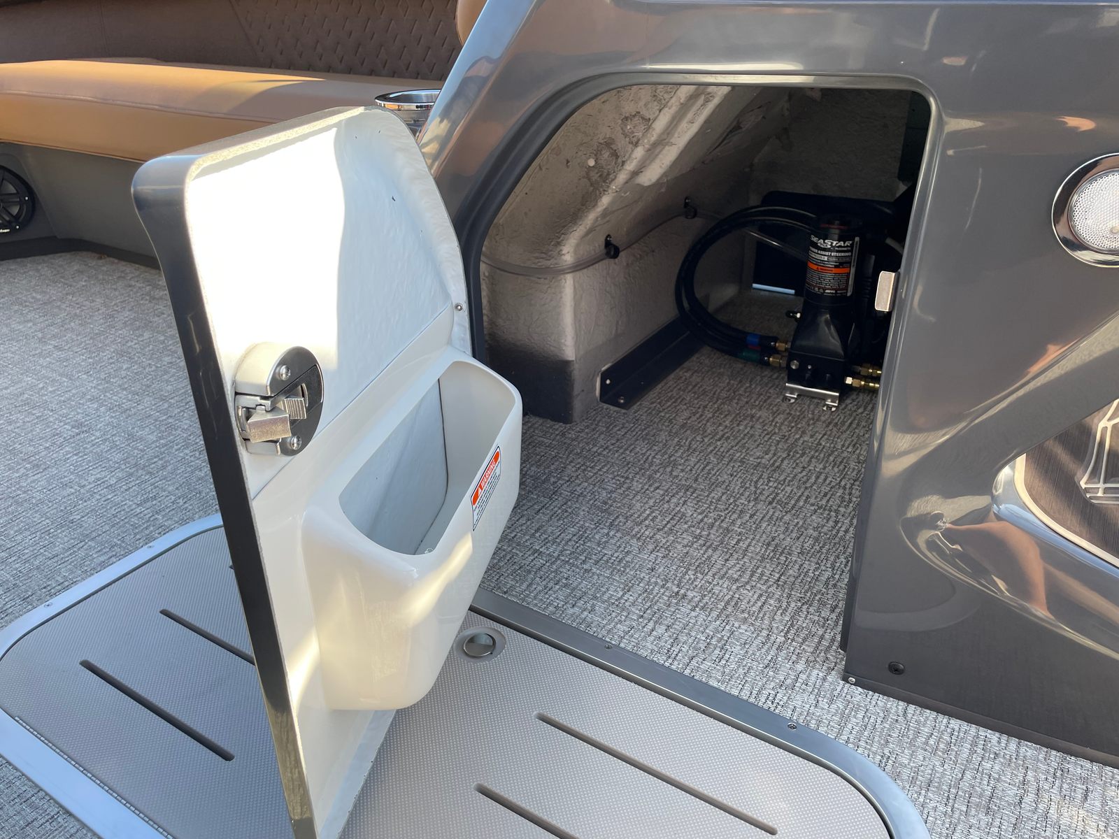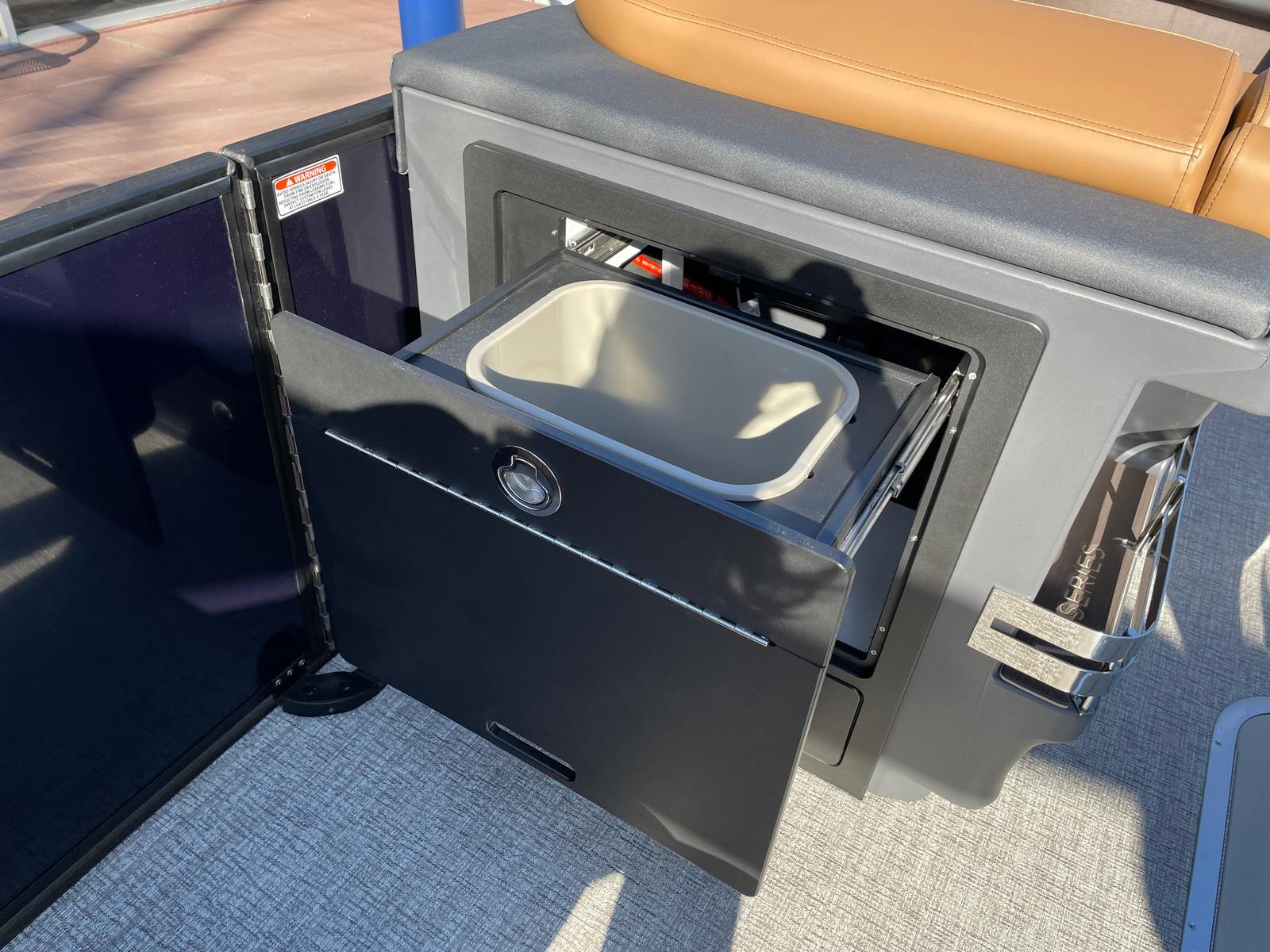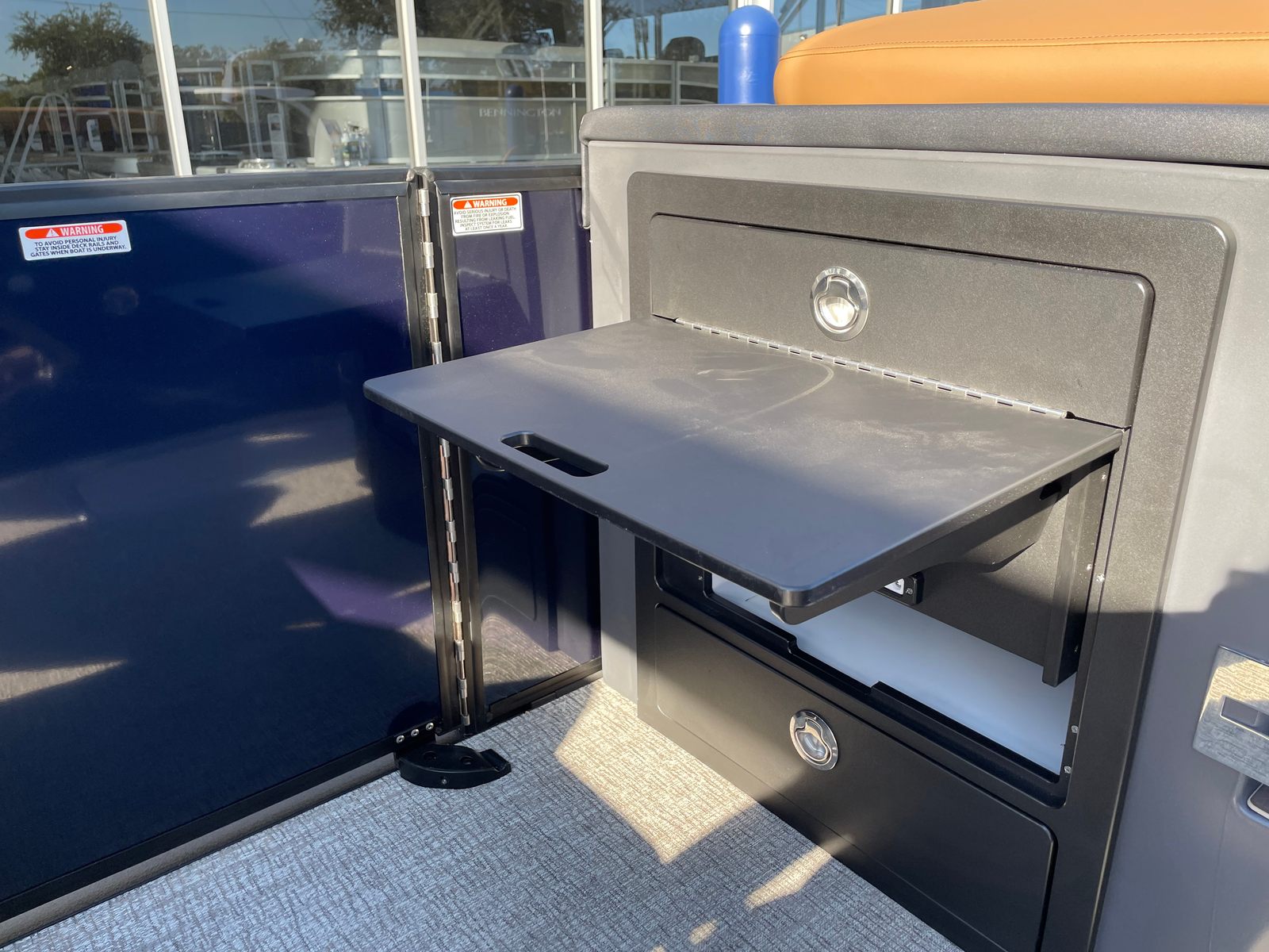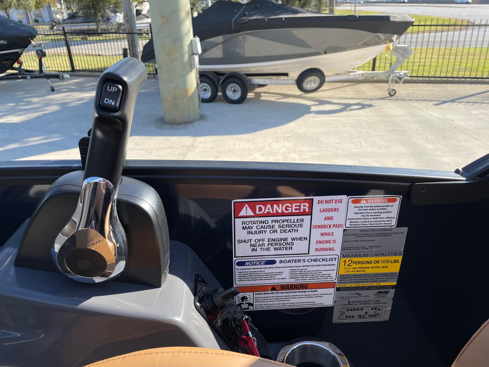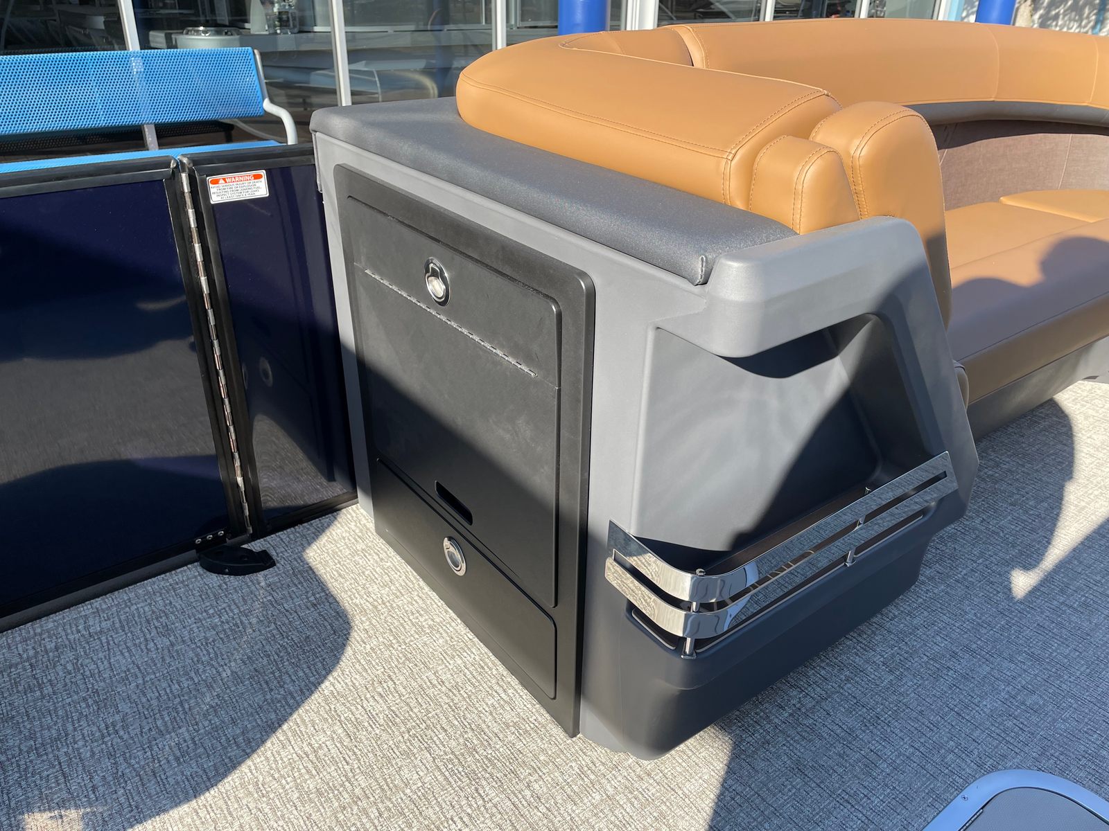 Step aboard the Bennington 24 MSL SPS Plus and discover a world of premium features designed to enhance every moment. The RGB Control M Series allows you to customize the ambiance with vibrant lighting, setting the mood for evening cruises or festive gatherings. Toekick lights add a touch of elegance and safety, illuminating pathways for easy movement around the deck. The Rockford Fosgate M1 Lighted Speakers deliver crystal-clear sound, transforming your pontoon into a floating entertainment hub, while illuminated cupholders keep your refreshments visible and accessible, even after sunset.The elevated console with Pocket Mythos offers ergonomic controls and convenient storage, ensuring everything you need is within reach. Canvas in Midnight Black provides stylish protection from the elements, while lumbar lighting adds a subtle glow for nighttime comfort. Every feature is thoughtfully integrated to maximize enjoyment and functionality, making this Bennington boat for sale a standout in its class.
