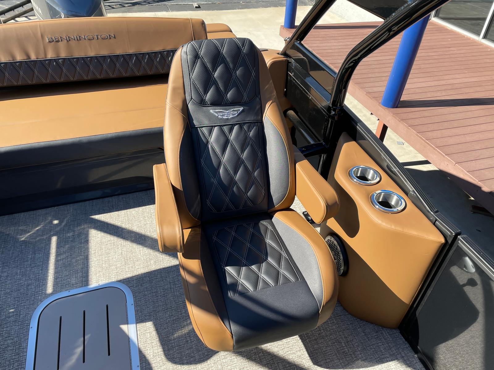 The Bennington 24 Rtsba V is loaded with special features designed to elevate your boating experience. Nine illuminated cupholders are strategically placed throughout the deck, ensuring your favorite beverages are always within reach, day or night. Exterior side lighting and toekick lights (2-72" 2-Bwrdr) create a captivating ambiance, perfect for evening cruises or dockside gatherings. The blackout logos add a touch of modern elegance, distinguishing this pontoon from the crowd.Music lovers will be thrilled with the premium Rockford Fosgate audio system, which includes two 8" M2 Arch Can Speakers, a powerful 10" M1 Subwoofer, and a dual M2 amplifier upgrade. The Rockford Fosgate PMX-1R Head Unit Remote, complete with Sirius Satellite Radio, ensures you have access to your favorite playlists and stations wherever your journey takes you. These features combine to create an immersive sound experience, transforming every trip into a floating concert.