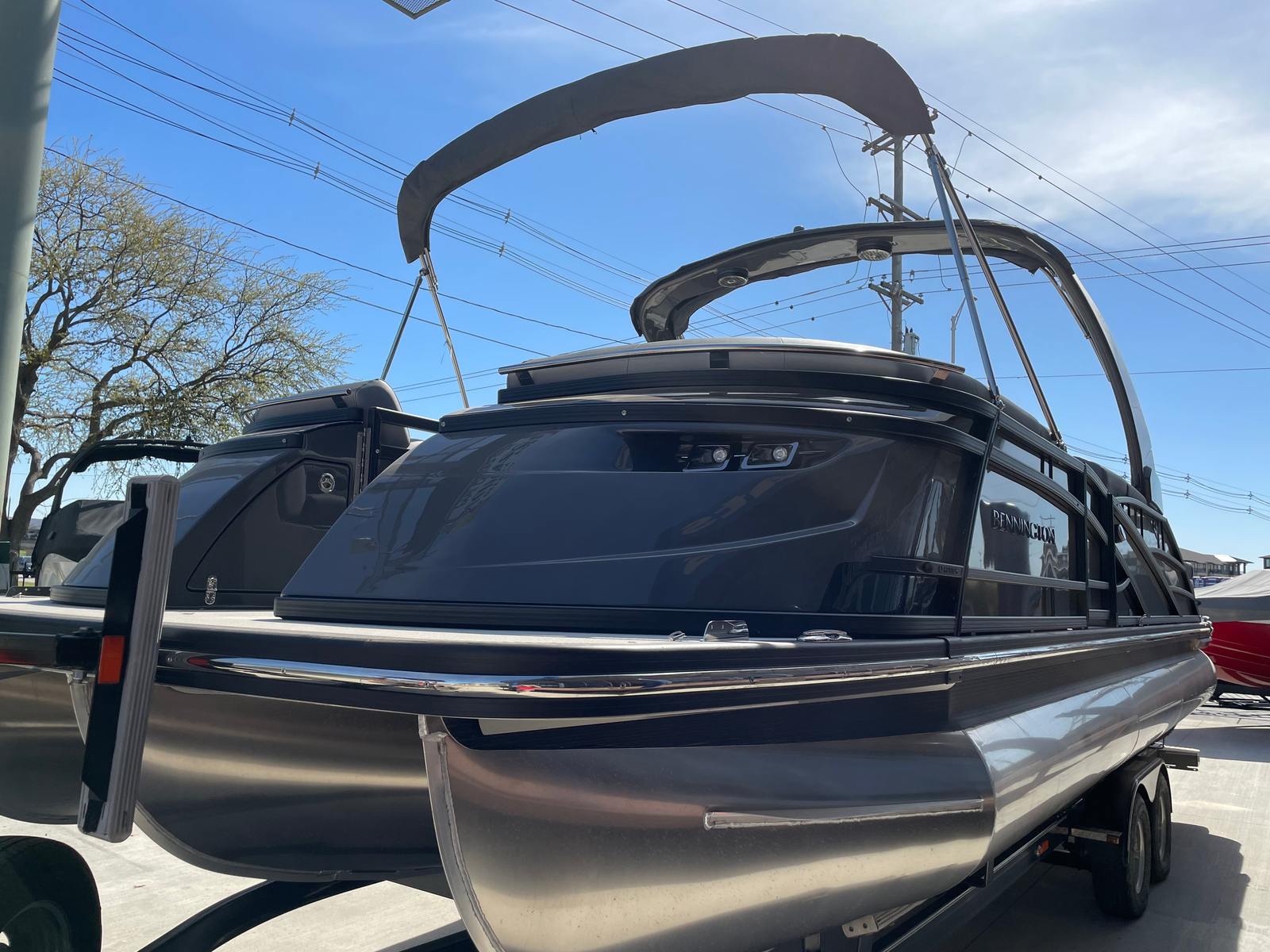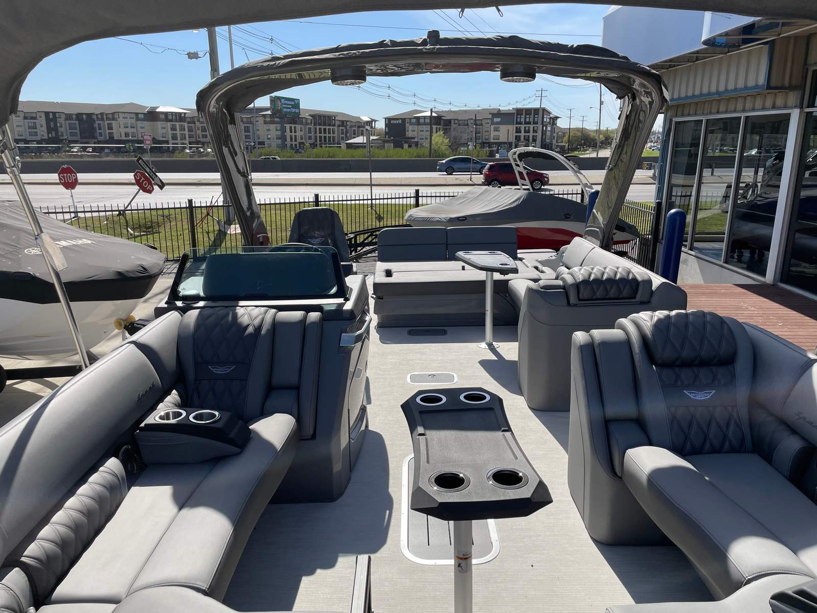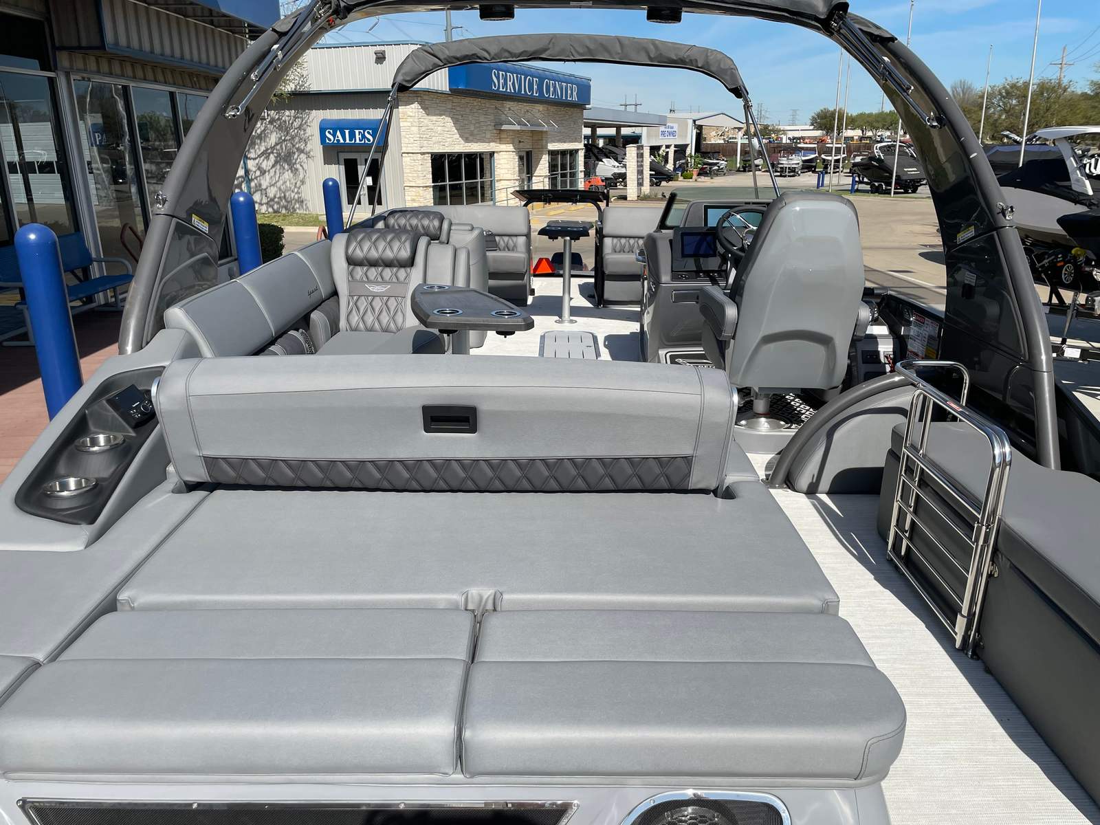 The 2025 Bennington 27 QSBAX2 ESP stands out as a premier pontoon boat, measuring an impressive 27.92 feet in length. This new Bennington boat for sale is meticulously designed to offer ample space for entertaining, relaxing, and enjoying every moment on the water. The sleek exterior, highlighted by blackout logos and sophisticated lighting, ensures that this pontoon commands attention at every dock and on every lake. With its modern design and spacious layout, the Bennington 27 QSBAX2 ESP is perfect for those who demand both style and substance from their watercraft.