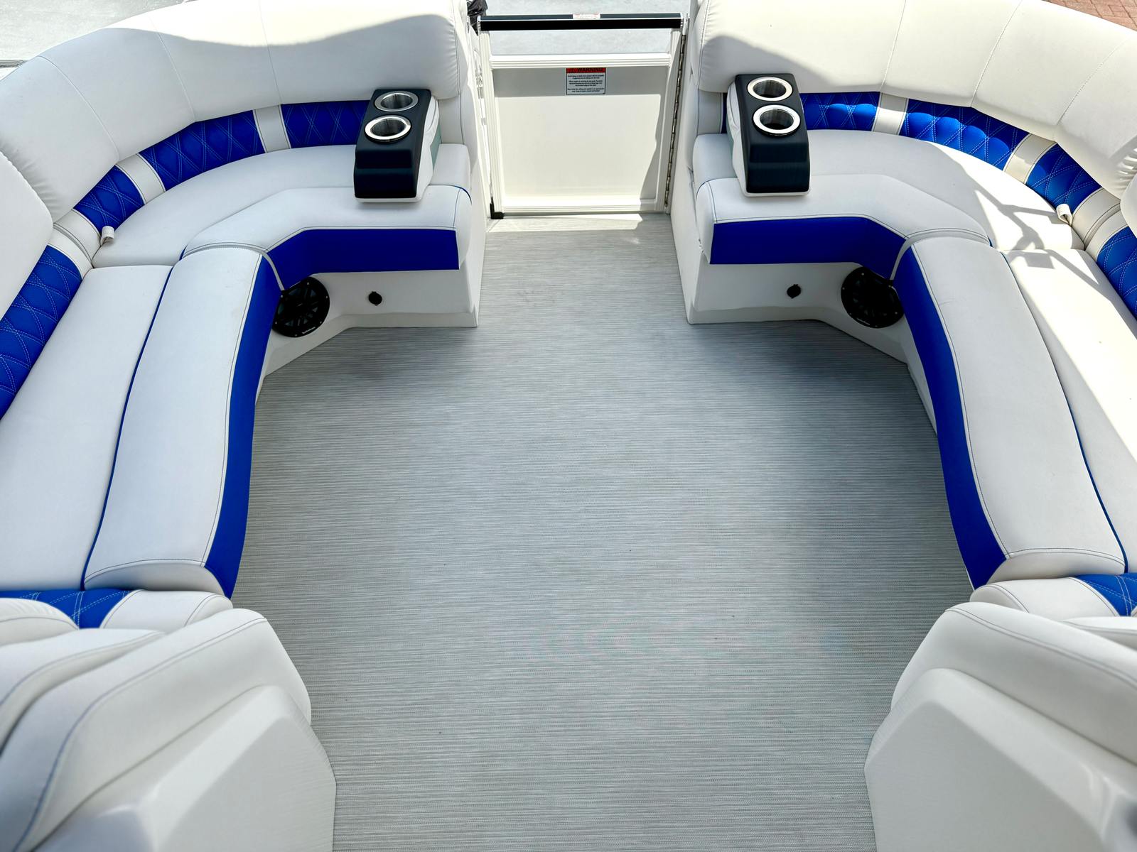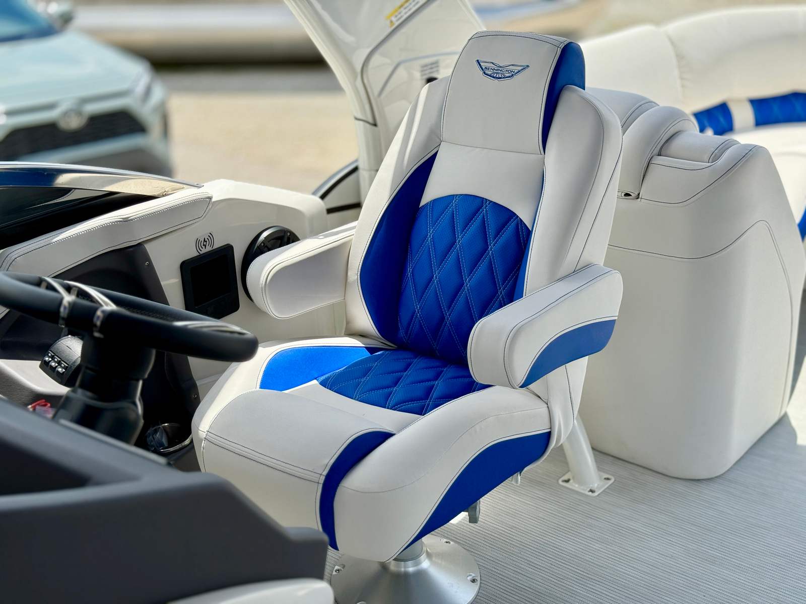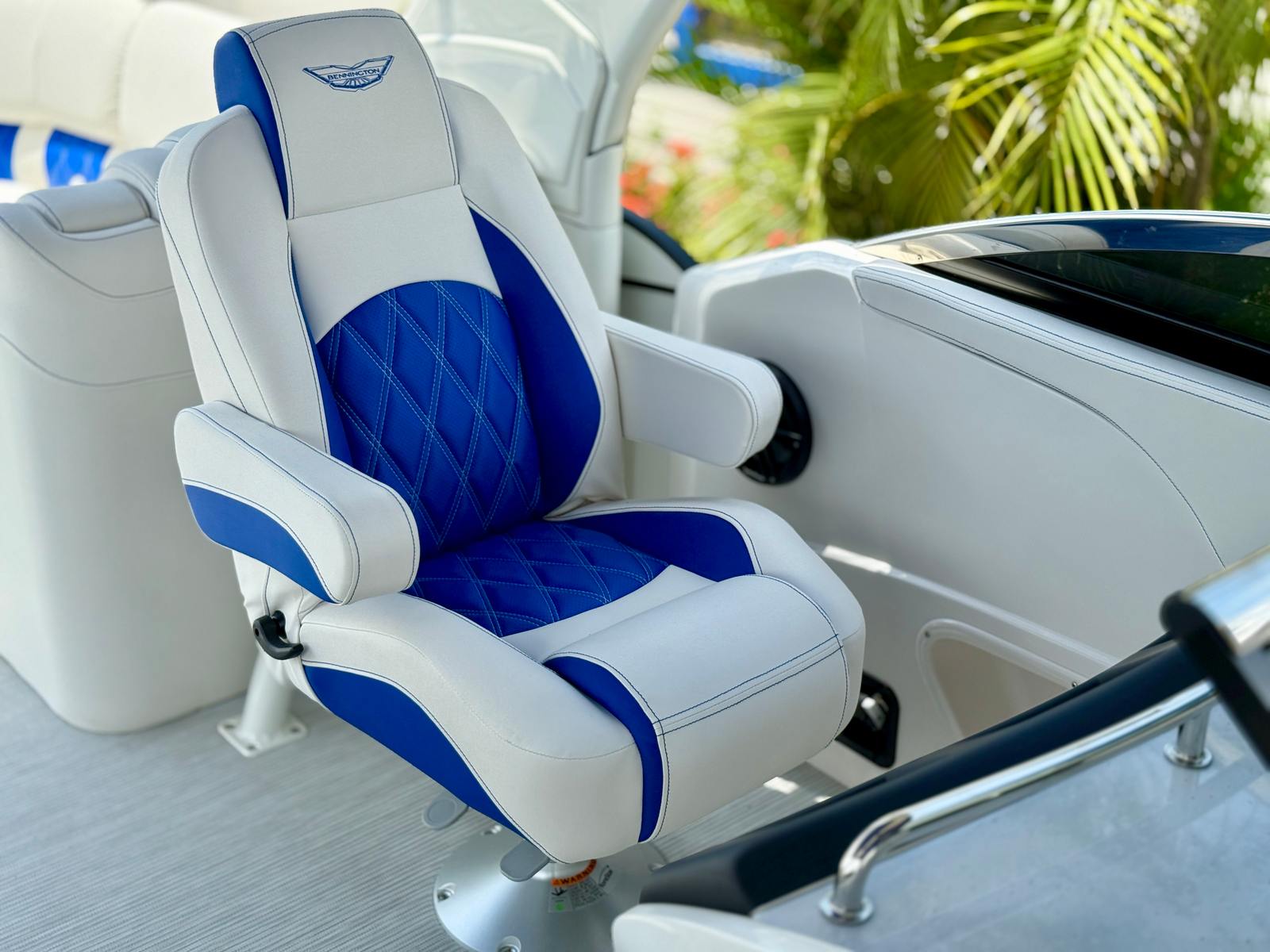 This Bennington pontoon boat is loaded with premium features designed to elevate your on-water experience. The twin Yamaha 300 HP 4 Stroke V6 engines with integrated steering provide both power and control, while the Arctic Ice White exterior and Blackout Logos create a striking visual impression. Step aboard and you’ll be greeted by the Base Pillowtop Diamond Stitched Upholstery, exclusive to the Q/QX series and 10-foot wide models, offering both comfort and sophistication.The interior is further enhanced by Zebrawood Matte Slate accents, adding a touch of elegance to the spacious deck. The Canvas in Midnight Black not only looks sleek but also offers protection from the elements. The Tower/Arch in Luminous Blue, along with the Metallic White panels and Aft Metallic White accents, give this pontoon a modern and distinctive appearance that will turn heads at any marina.