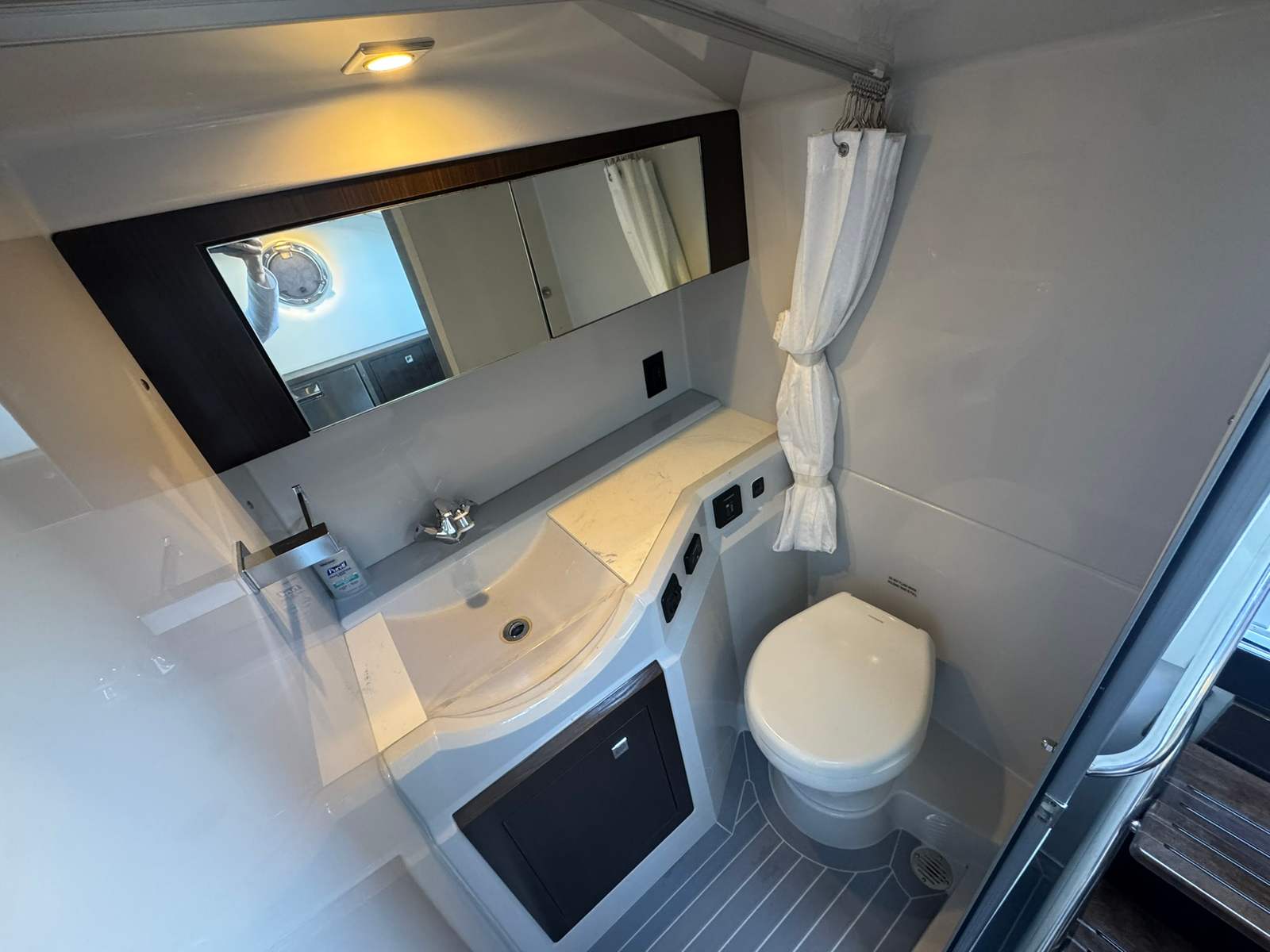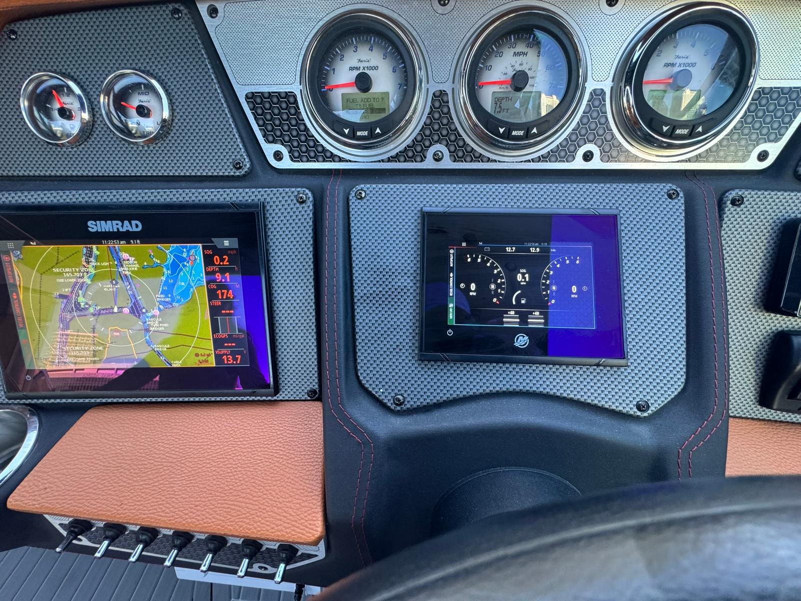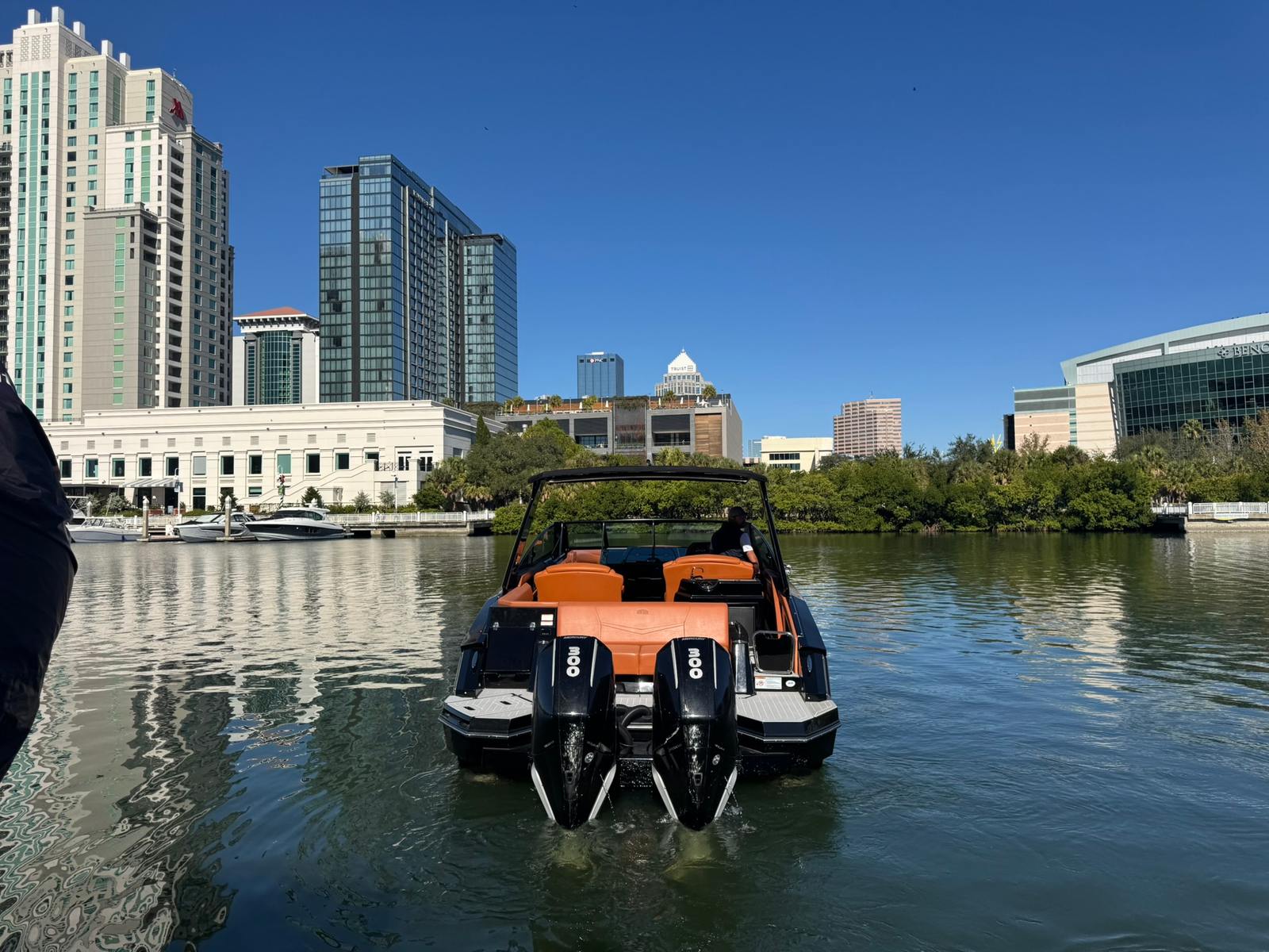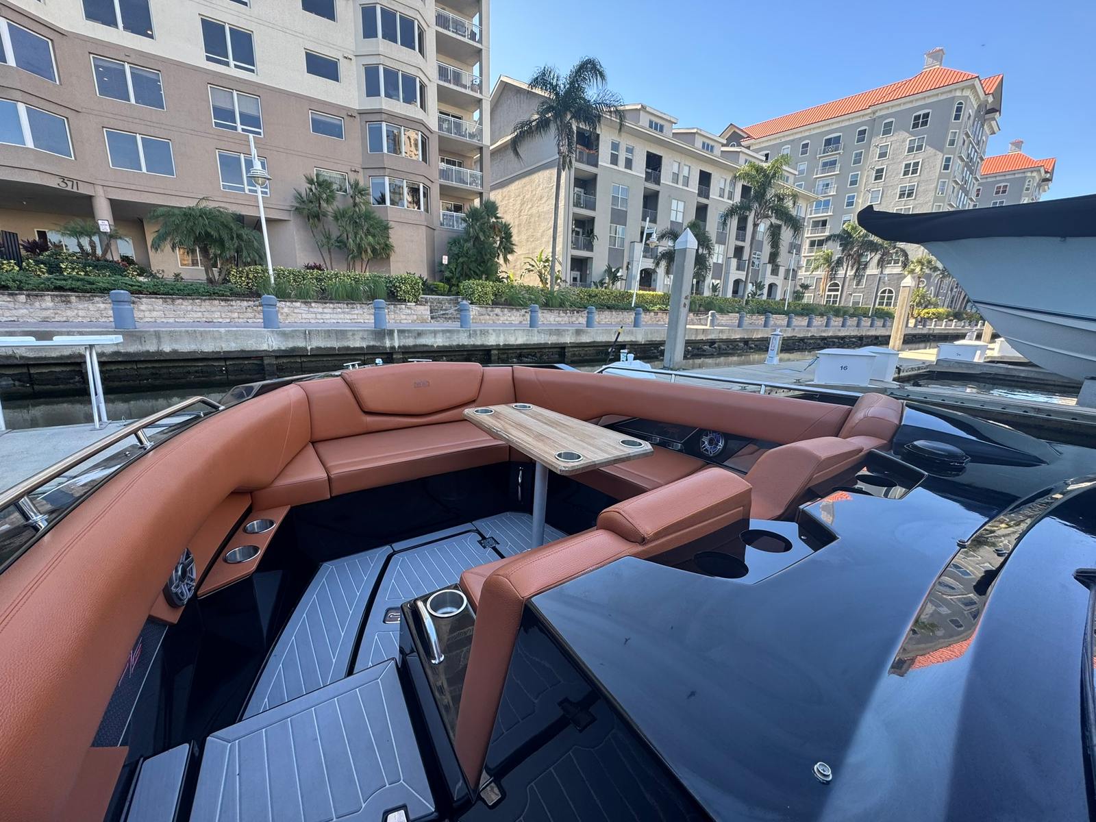 Inside, the boat features full SeaDek flooring and a beautifully finished cabin enhanced with a Lithium power bank that runs the cabin A/C system, making overnights and hot Florida days a breeze—even away from shore power.