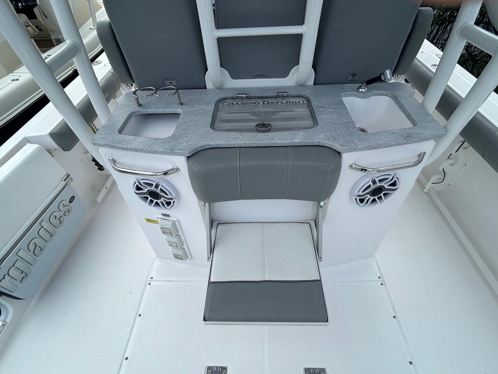This Everglades boat for sale is loaded with premium features that enhance both functionality and comfort. The triple 18" low profile bars mounted to the hardtop, along with a powerful light bar, ensure excellent visibility and safety during night excursions or early morning outings. The premium electronics package offers state-of-the-art navigation and communication tools, while the JL Speakers LED M6 upgrade delivers crystal-clear sound and vibrant LED lighting for an immersive audio experience.For those who appreciate convenience and style, the canvas package provides protection from the elements, and the Mediterranean bow shade offers a cool retreat on sunny days. The GXM 54 Sirius XM & Weather Receiver keeps you informed and entertained, no matter where your journey takes you. The auto engine freshwater flush system simplifies maintenance, helping to preserve engine longevity and performance.