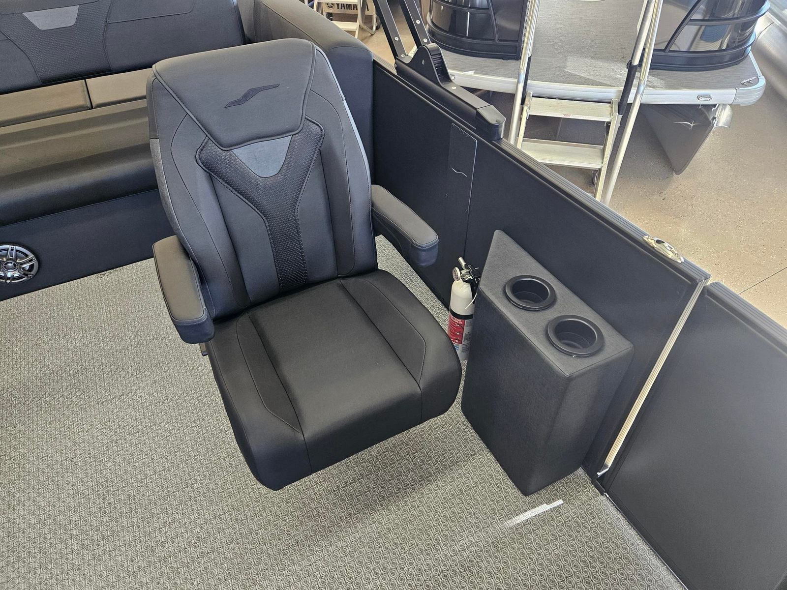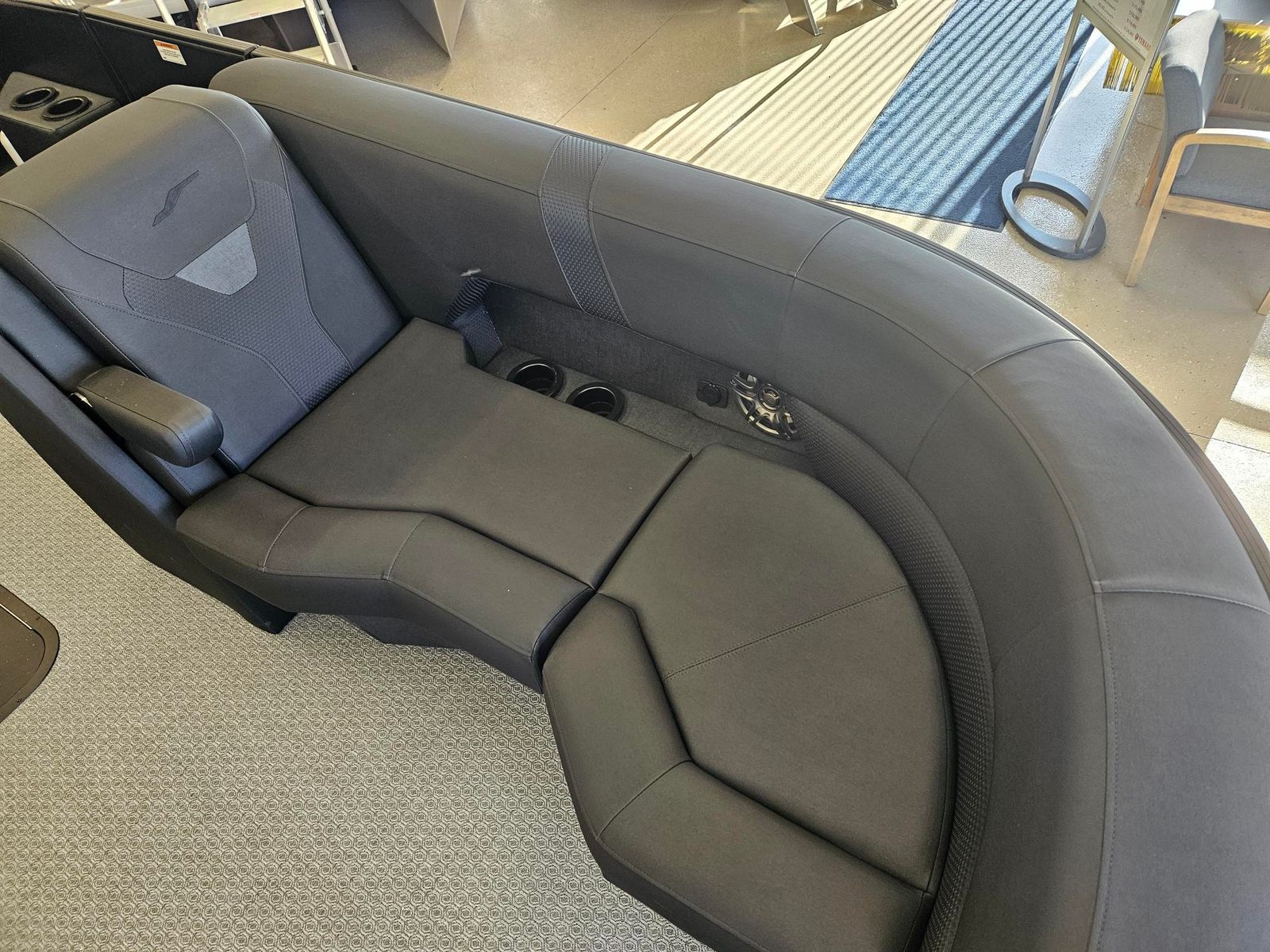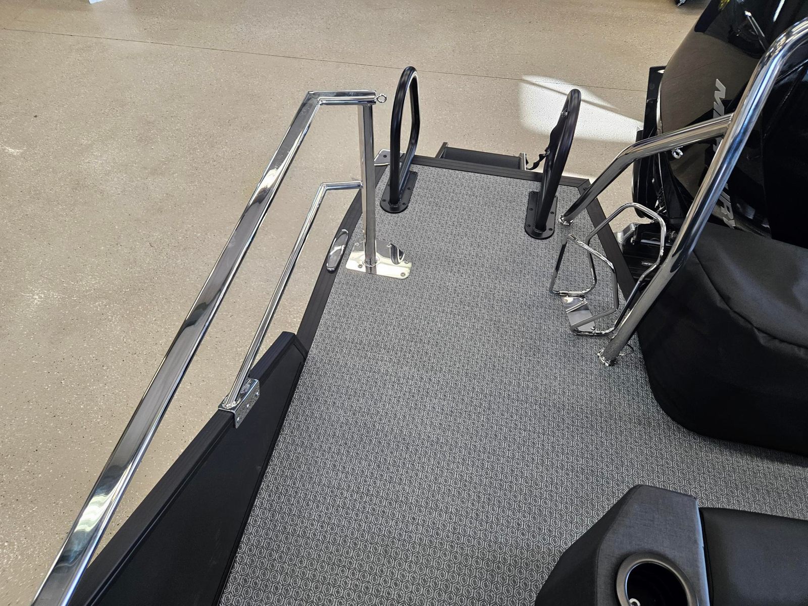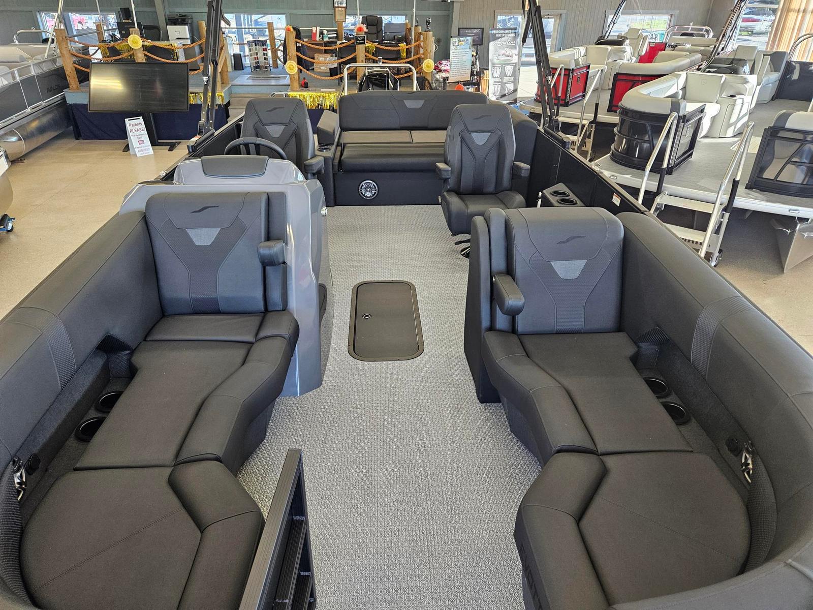 The Evotti 523 CS is packed with special features that set it apart from other pontoon boats for sale. The striking Panel Diamond Black Satin exterior, complemented by the Panel Accent Platinum Blue Satin, gives this boat a sophisticated and modern look that turns heads at every dock. The Canvas Black provides both style and protection, ensuring your pontoon remains in pristine condition. Step aboard and you’ll be greeted by the luxurious Base Vinyl Spectra Black seating, offering both comfort and durability for long days on the water. The Steel Gray Evolution Flooring not only adds a touch of elegance but also provides a slip-resistant surface for safety and peace of mind.The CS Stern Rail System enhances both safety and functionality at the rear of the boat, making it easy to access the water or manage gear. With a single battery setup, the Evotti 523 CS is designed for reliable power management, ensuring your electronics and accessories are always ready for use. Every detail, from the premium materials to the thoughtful layout, is crafted to enhance your boating experience.