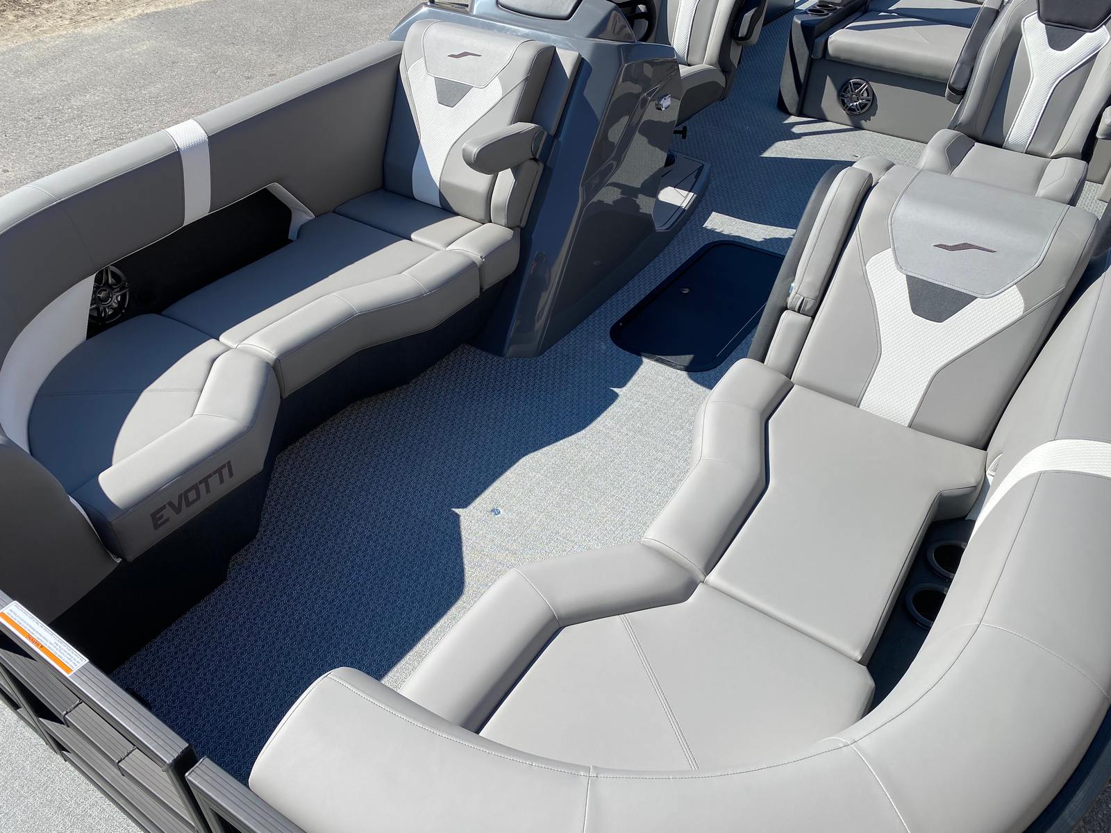 The Evotti 523 CS pontoon is loaded with premium features that set it apart from other pontoon boats for sale. The striking Panel Platinum Blue Satin finish, accented by the elegant Panel Accent Pearl White Gloss, creates a modern and eye-catching exterior. The Canvas Black adds a touch of sophistication and provides shade and protection when needed. Step aboard and you’ll be greeted by the luxurious Base Vinyl Steel Gray upholstery, which is both stylish and comfortable, while the Steel Gray Evolution Flooring offers durability and a contemporary look that’s easy to maintain.For the captain and tech enthusiasts, the Garmin 943 with 5" gauges delivers advanced navigation and system monitoring, putting all the information you need right at your fingertips. The single battery setup is efficient and reliable, supporting all your onboard electronics and ensuring worry-free outings. Every detail, from the prerig Yamaha mechanical system to the expertly designed rigging, is crafted to enhance your time on the water.
