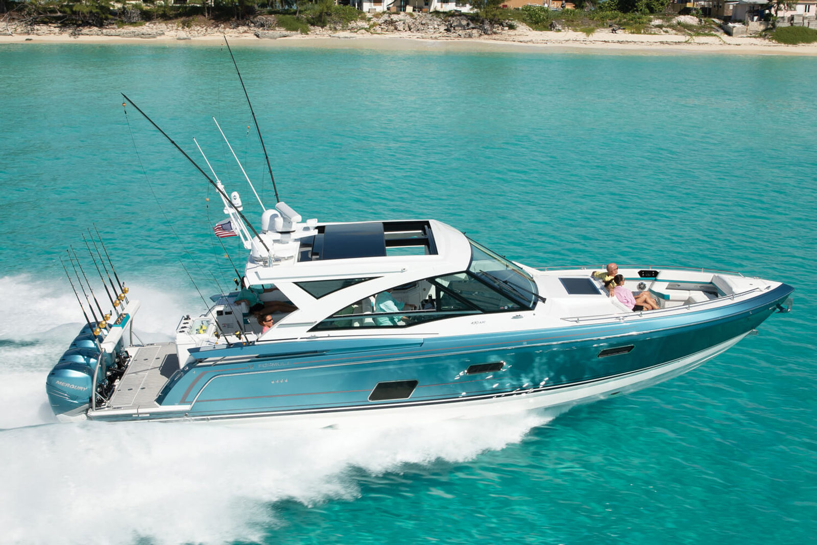 full height tinted windshield with wiper, port walk-thru door side wing glass vents and large, motorized opening coupe-top, glass sunroof with retractable sunshades and soft panels, blue LED accent lighting, dual flagstaff, flush mount LED spreader lights, flag staff and white dual air horn