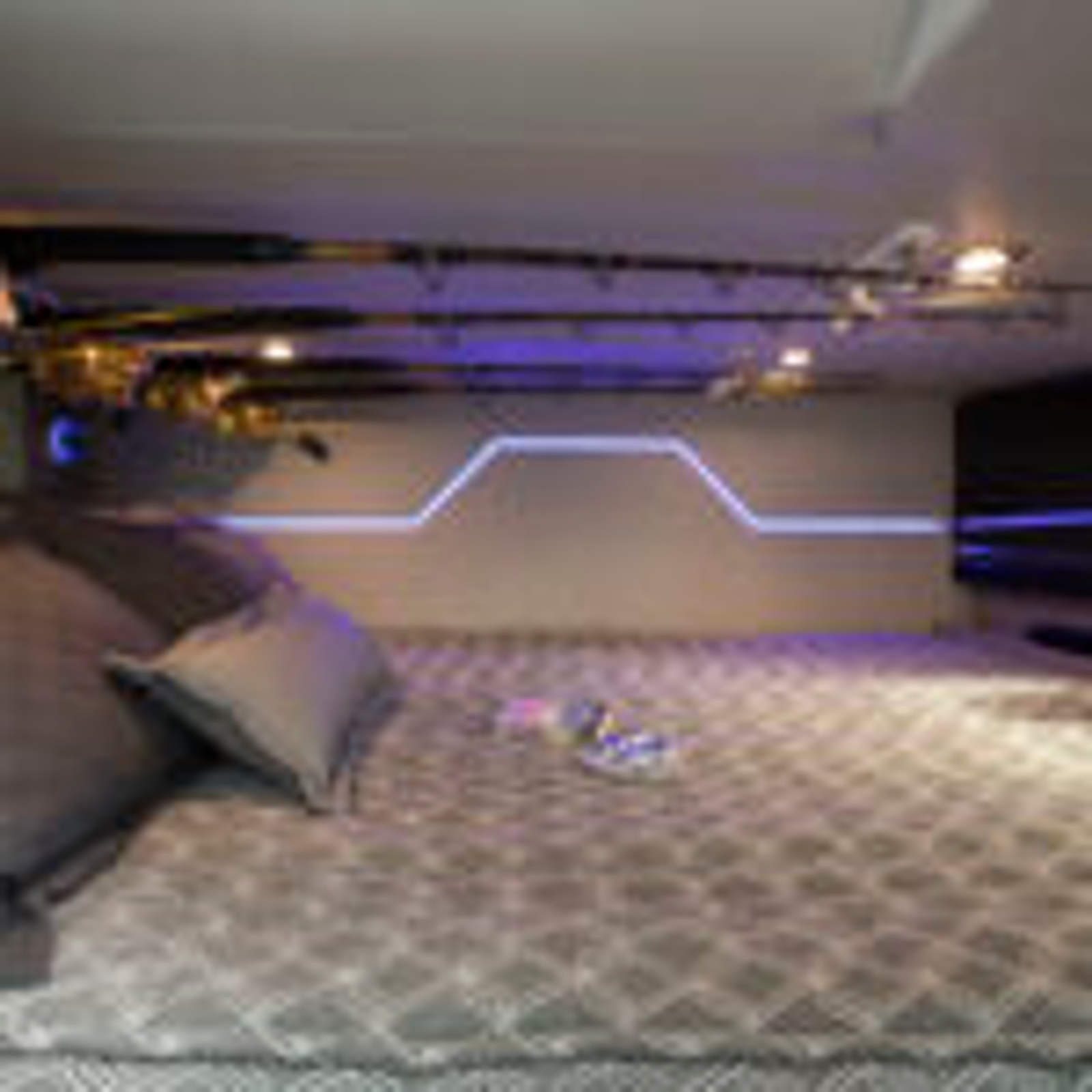 Two electric powered adjustable height bow tables with wood grain decking on top and filler cushions