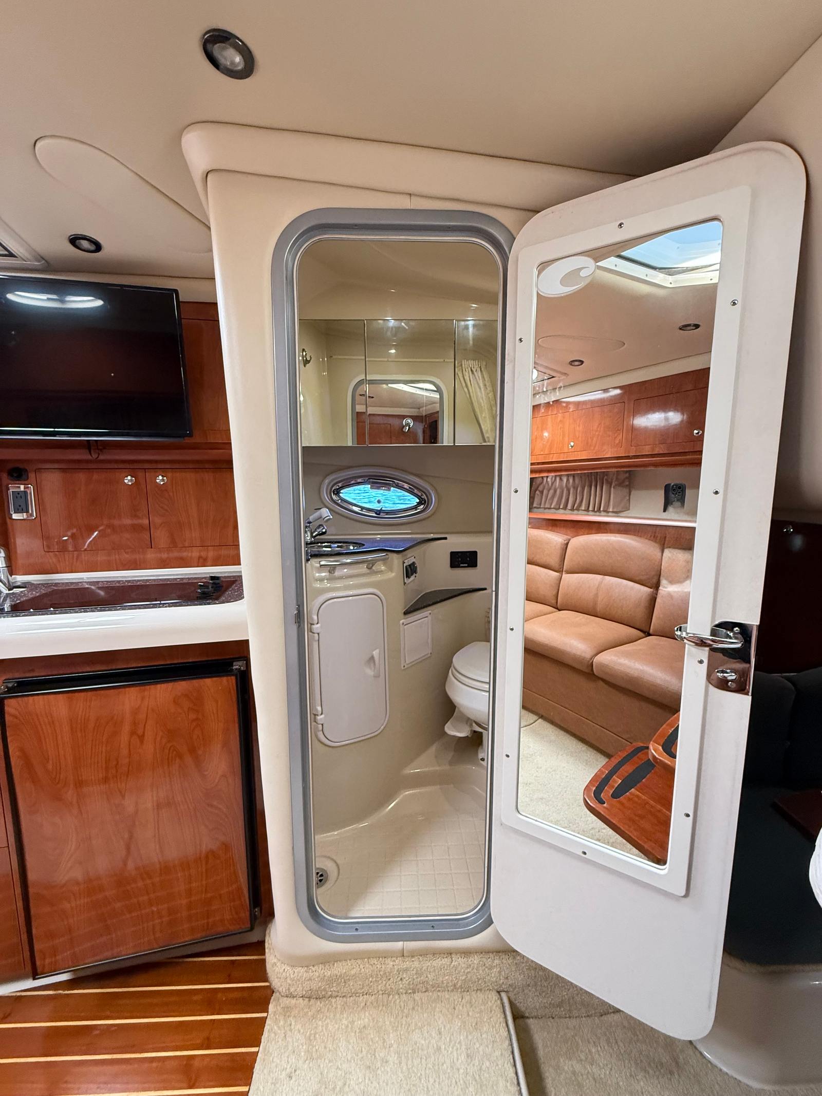 Designed for easy entertaining and comfortable cruising, the cockpit features a spacious U-shaped seating area, full SeaDeck flooring, and a center walk-through to the bow. A full camper canvas with isinglass enclosure and a cockpit cover provide flexibility and protection in any weather.