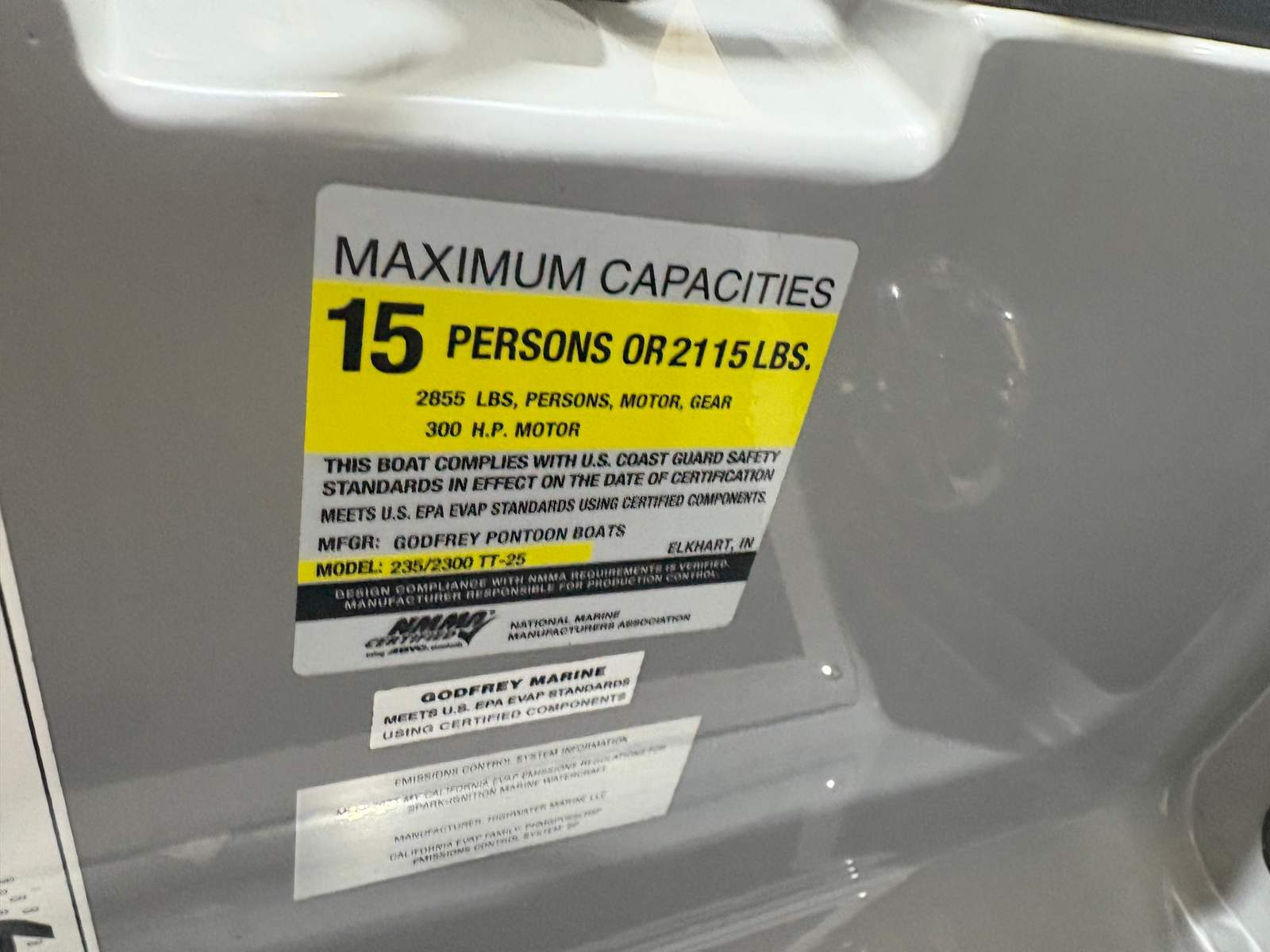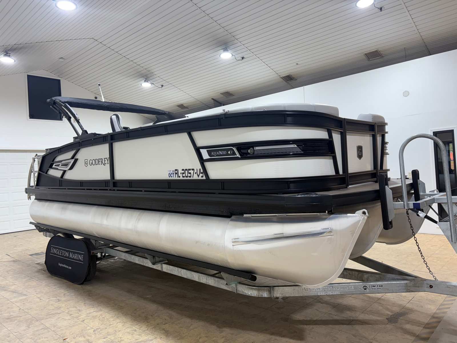 The 2024 Godfrey Aqua Patio 235 Sflc is a standout pontoon boat for sale that combines powerful performance, luxurious features, and practical design. With its 250 horsepower engine, low engine hours, and a suite of special features including a FULL MOORING COVER, POWER BIMINI TOP, TRANSOM RAIL SYSTEM, DOCKING LIGHTS, FOLDING SWIM LADDER, SKI TOW BAR, UNDERWATER LIGHTS, RGB UNDERDECK LIGHTS, RGB INTERIOR LIGHTING, and a stainless steel prop, this Godfrey boat for sale offers everything you need for unforgettable days on the water.If you’re ready to experience the best in pontoon boating, don’t miss the opportunity to make the Godfrey Aqua Patio 235 Sflc yours. Discover the joy, comfort, and excitement that this exceptional pontoon boat brings, and contact your dealer today to learn more about how you can start your next adventure.