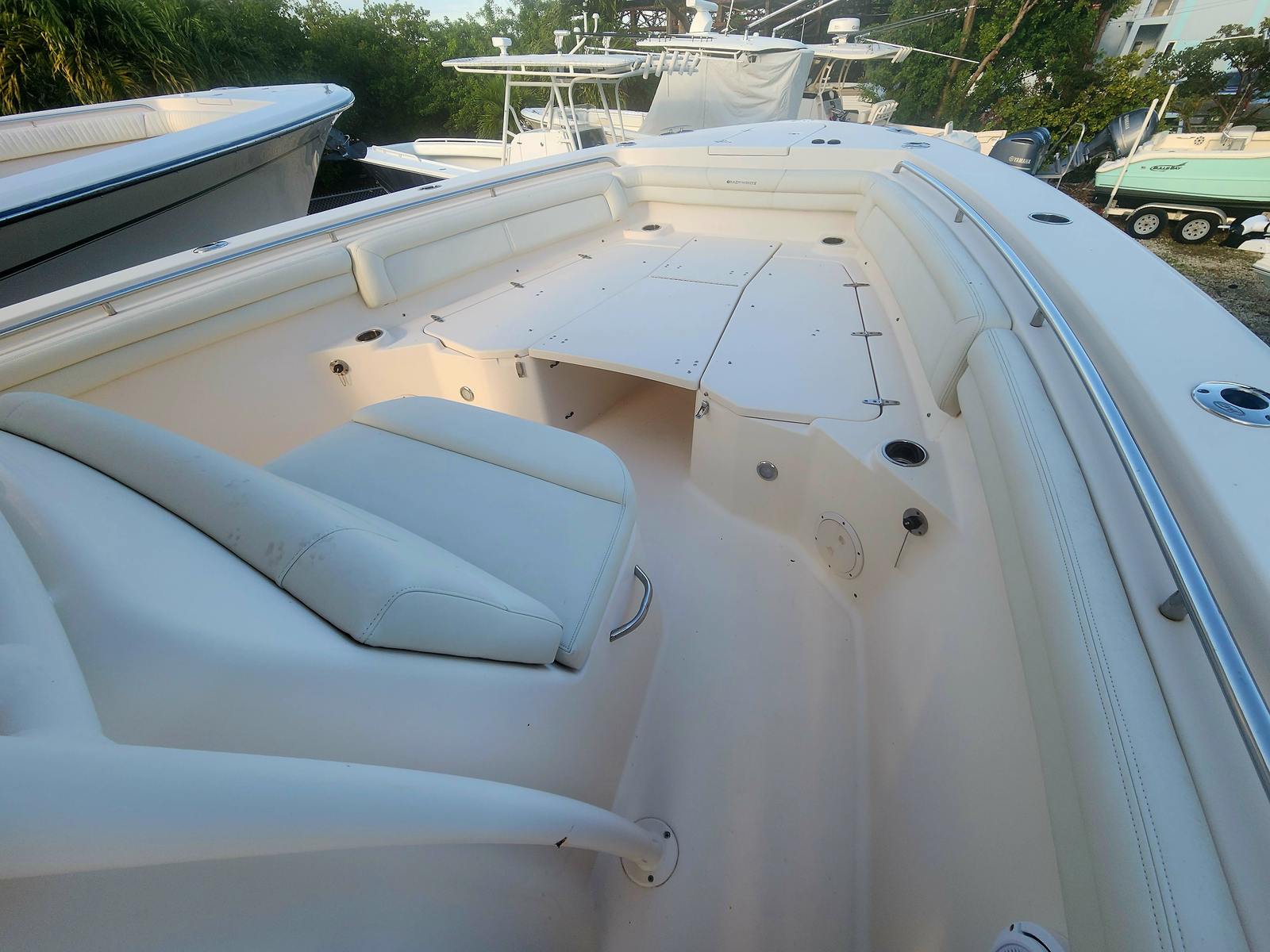 Powering the Grady-White Canyon 336 are three high-performance engines, delivering a combined 900 horsepower. With 970 engine hours, these engines have proven their reliability and are built to offer impressive speed, acceleration, and efficiency. The triple-engine setup ensures that you have the power to reach your favorite fishing spots quickly or cruise comfortably with family and friends. Whether you are chasing game fish offshore or enjoying a leisurely ride along the coast, the Canyon 336’s performance capabilities set it apart from other center console boats for sale.