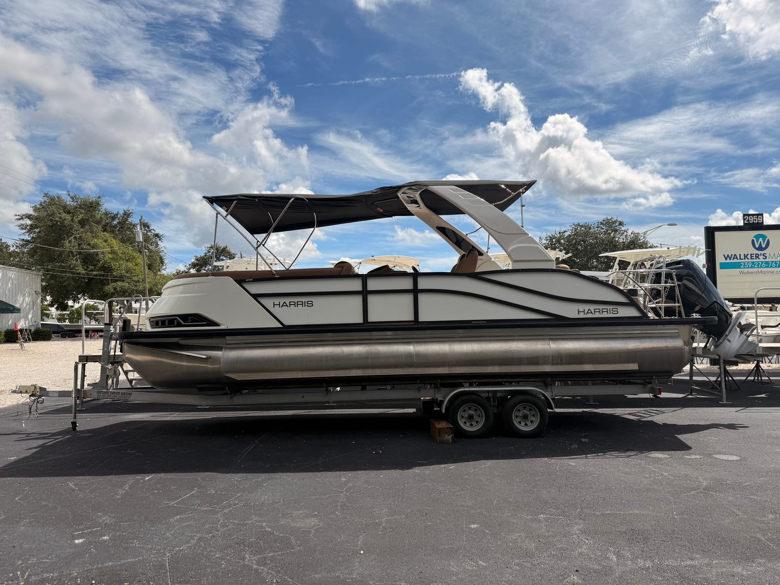New to the market (9/2025), this 2024 Harris Grand Mariner 250 does not disappoint!! She is powered by a Mercury 350L V10 Verado with only 38 HOURS. She has a Collapsible Tower with Power Lift...press of a button at the Helm. Her Chestnut Brown upholstery with ONYX accents is stunning. She has double Captains Chairs with U-Lux (Hiback) and elevated Helm. Operating this GEM is extremely smooth with her Mercury Power Assist Steering.