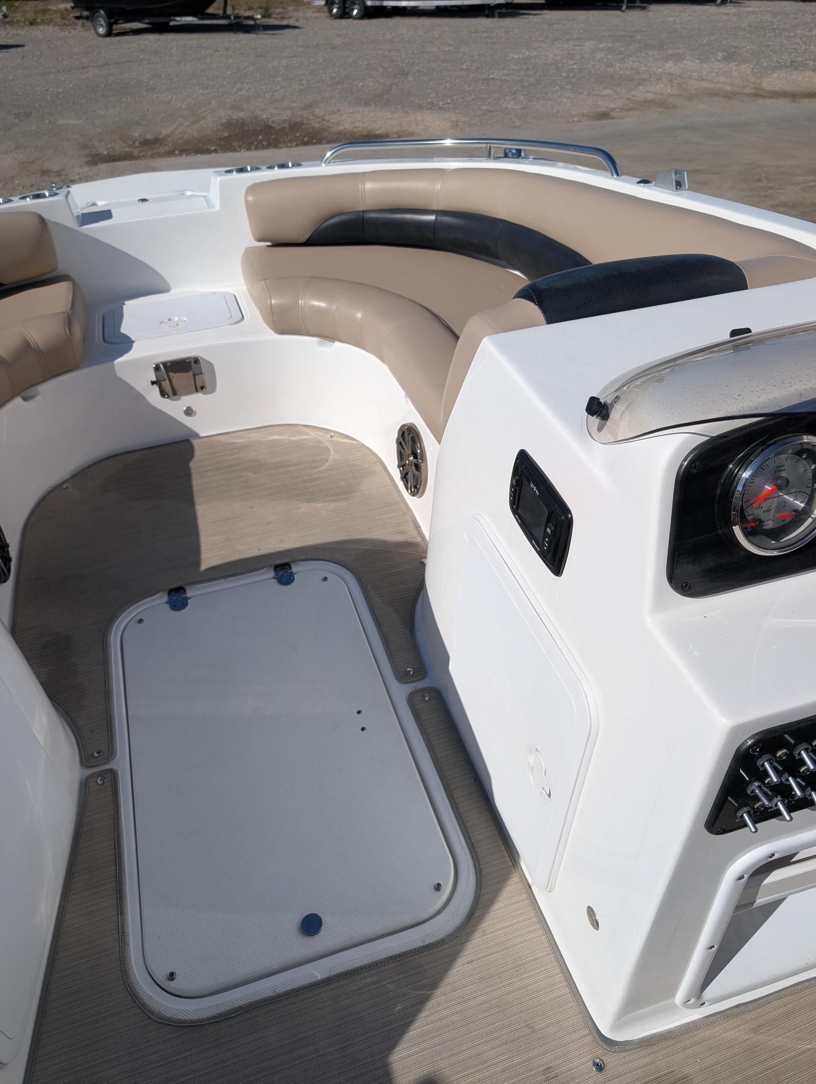 This Hurricane boat for sale is loaded with special features that enhance both its recreational and practical appeal. The wake tower is a standout addition, perfect for wakeboarding, waterskiing, or tubing. It provides a sturdy and elevated tow point, ensuring smooth rides and big air for thrill-seekers. The bimini top offers essential shade and protection from the sun, allowing you to stay cool and comfortable during long summer outings. For anglers, the fish finder is a valuable tool, helping you locate the best fishing spots with ease and precision. These features make the Hurricane 188 SS a true multi-purpose vessel, ready for whatever adventure you have in mind.