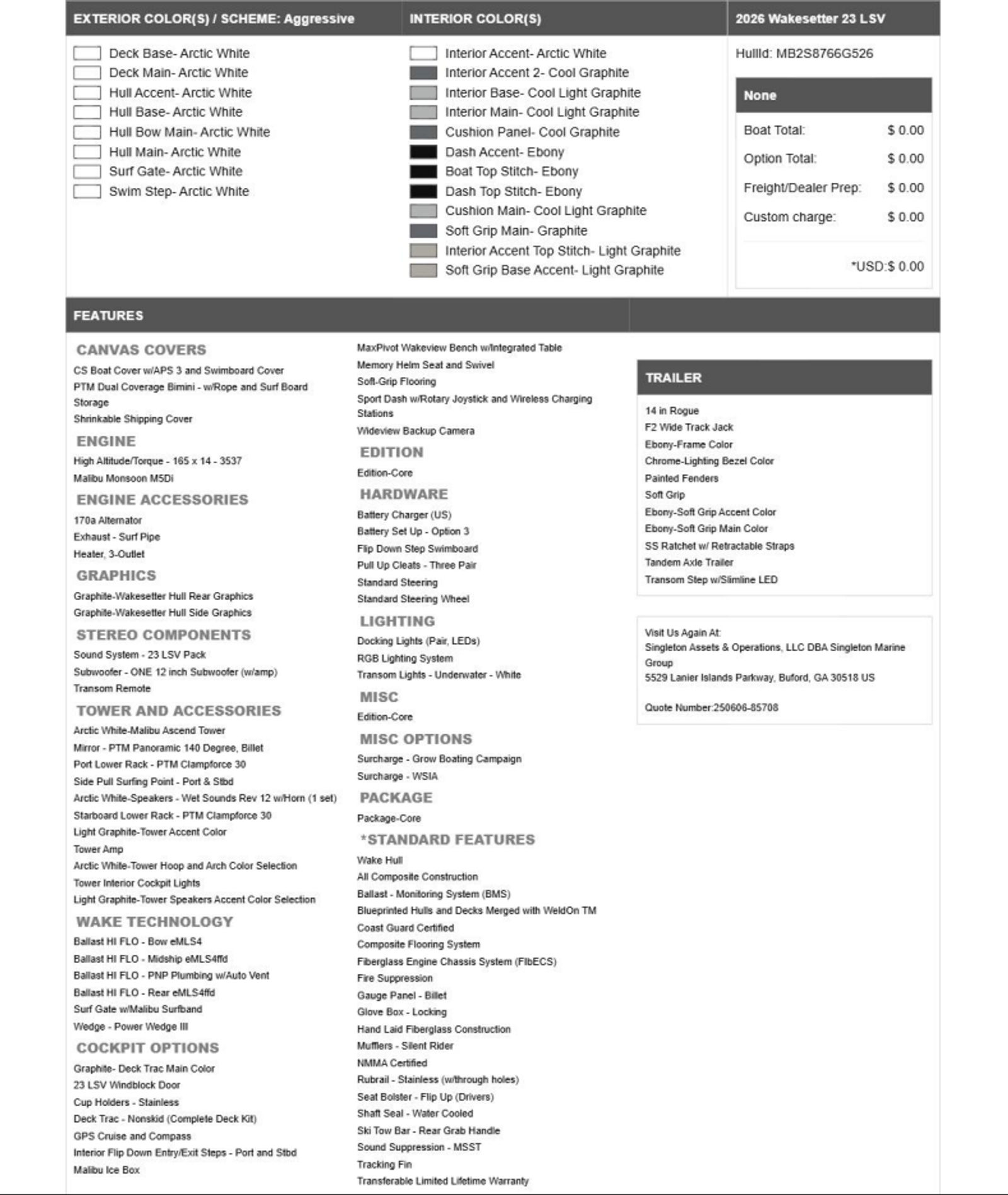 This 2026 Malibu Wakesetter 23 LSV is packed with special features that elevate your boating experience to new heights. Enjoy peace of mind with a Transferable Limited Lifetime Warranty, ensuring long-term protection and value. The CS Boat Cover with APS 3 and Swimboard Cover keeps your investment protected from the elements, while the Flip Down Step Swimboard offers easy and safe access to the water for swimmers and riders alike.A touch of sophistication is added with Chrome - Lighting Bezel Color, enhancing the boat’s visual appeal, especially during evening outings. The 23 LSV Windblock Door provides added comfort by shielding the cockpit from wind and spray, making every ride more enjoyable. The innovative MaxPivot Wakeview Bench with Integrated Table transforms the seating area into a versatile space for socializing, dining, or simply relaxing between sessions.Safety and convenience are further enhanced with the Deck Trac - Nonskid (Complete Deck Kit), offering secure footing throughout the boat. The Memory Helm Seat and Swivel ensures that the captain enjoys optimal comfort and support, while the Transom Remote allows for easy control of your audio system from the swim platform. For those who demand the best in wake performance, the Ballast HI FLO - Midship eMLS4ffd system delivers rapid and efficient ballast adjustments, allowing you to customize your wake for every rider’s preference.