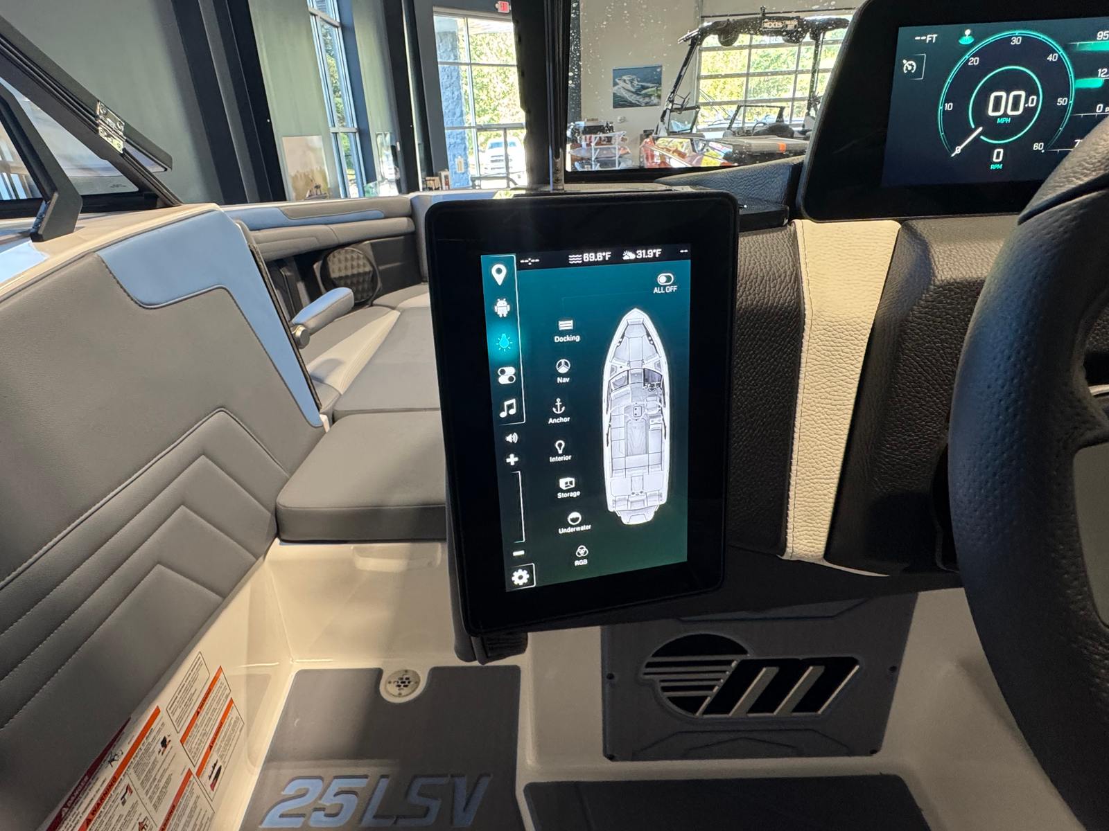 The 2025 Malibu Wakesetter 25 LSV is loaded with features designed to elevate your boating experience. The extended Gen II Surf CS Bimini Top provides ample shade and protection from the sun, ensuring comfort during long days on the water. The CS Boat Cover with APS 3 and Swimboard Cover keeps your investment protected when not in use, preserving its stunning appearance and value. Distinctive Arctic White-Wakesetter hull rear and side graphics add a touch of flair, making this boat a true head-turner wherever you go. The interior’s luxurious color scheme not only looks fantastic but also offers a welcoming and comfortable environment for passengers.