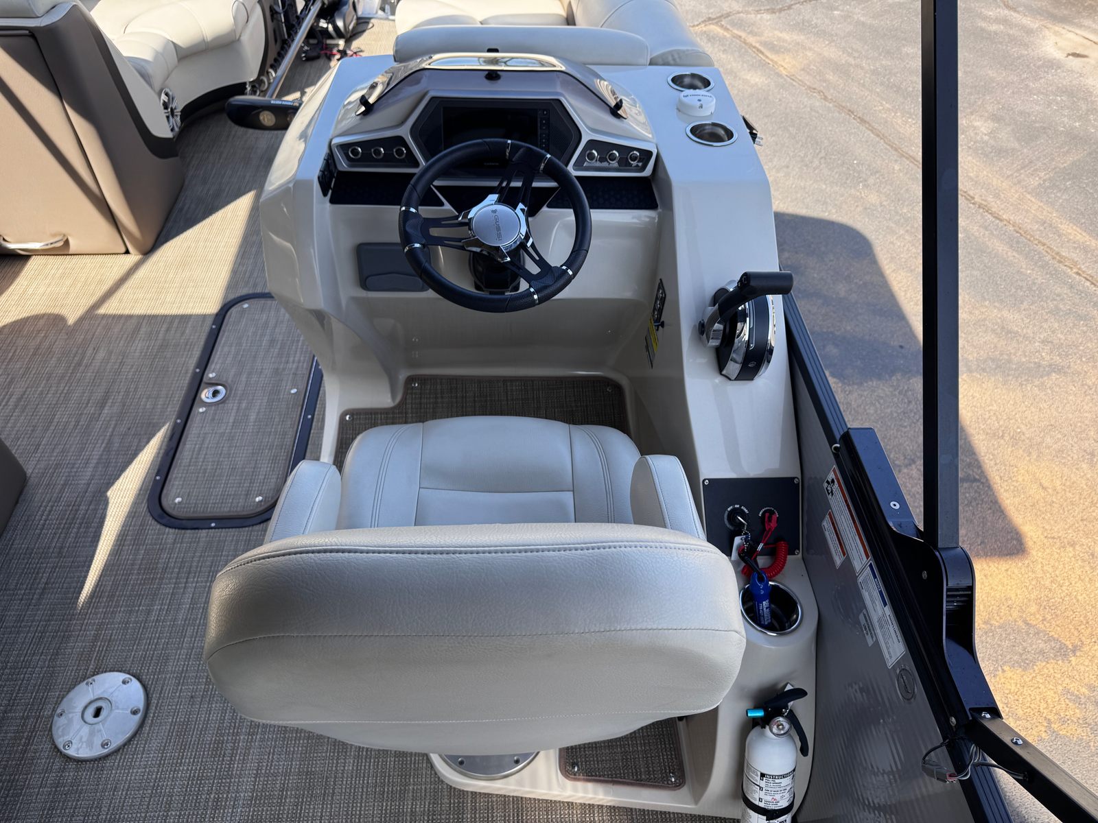 Powering the Manitou Oasis Angler 220 SHP is a robust 250-horsepower engine with only 95 hours of use. This single-engine setup delivers impressive acceleration and smooth handling, ensuring you can navigate lakes, rivers, and coastal waters with confidence. The SHP (Sport Handling Package) hull design is engineered for superior stability and agility, allowing you to enjoy thrilling rides and tight turns while maintaining a comfortable and secure experience for everyone onboard. Whether you are towing water toys, heading to your favorite fishing spot, or simply cruising at sunset, the performance of this pontoon boat will exceed your expectations.