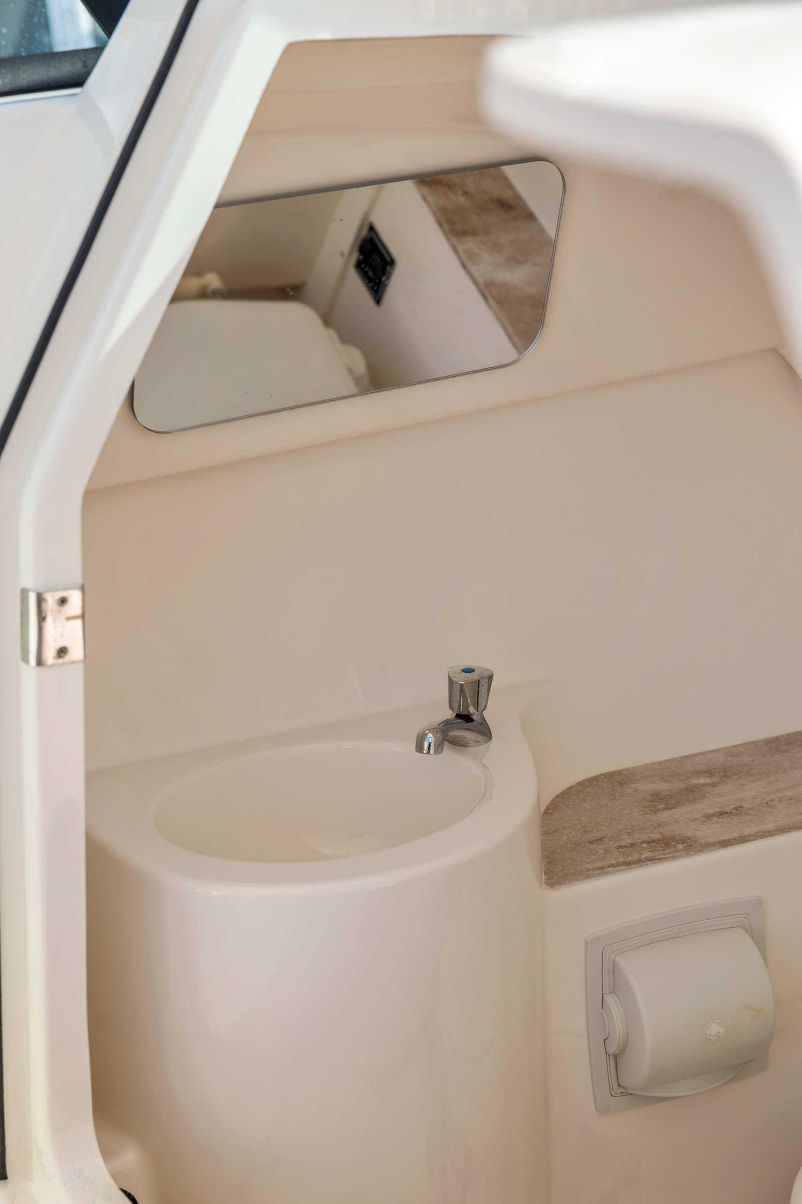 One of the defining features of the 265 DC is its well-appointed cabin and enclosed head. On the port side, you’ll find a spacious head compartment with a marine toilet, sink, and vanity—ventilated, easy to access, and a huge plus on long days aboard. Opposite, there’s a portside console cabin/storage space that can be used for gear, dry storage, or even a quick escape from the sun. Combined, these dual consoles provide ample storage and the kind of convenience rarely found in boats of this size.