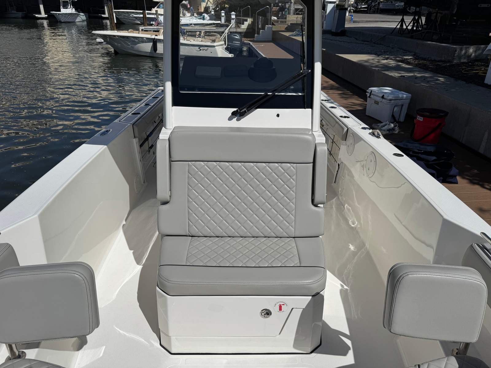 - Molded Helm Seat Console with Drink Holders (2), Rod Holders (2), Dedicated Tackle Storage Trays (5), Storage Drawers, Bucket/Soft-side Cooler Storage, Cutting Board and 12V Main Distribution Panel