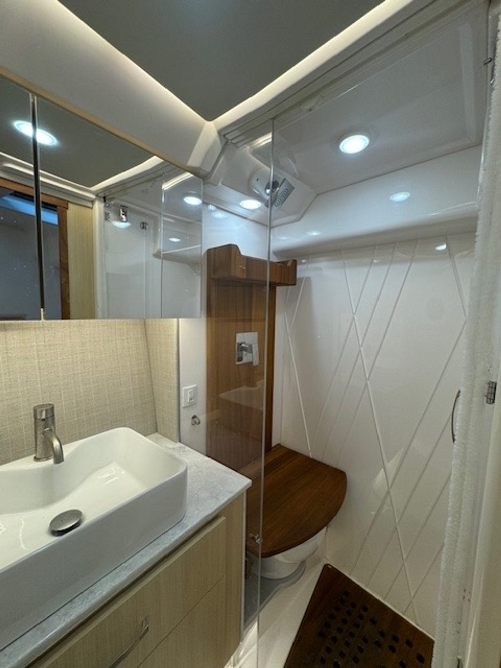 • Mid Cabin TV, Titanium Upholstery, and Toilet with Overboard Discharge