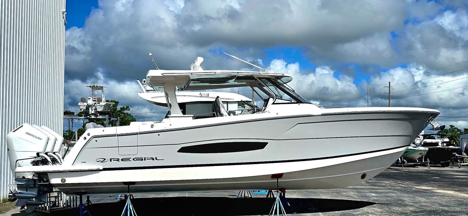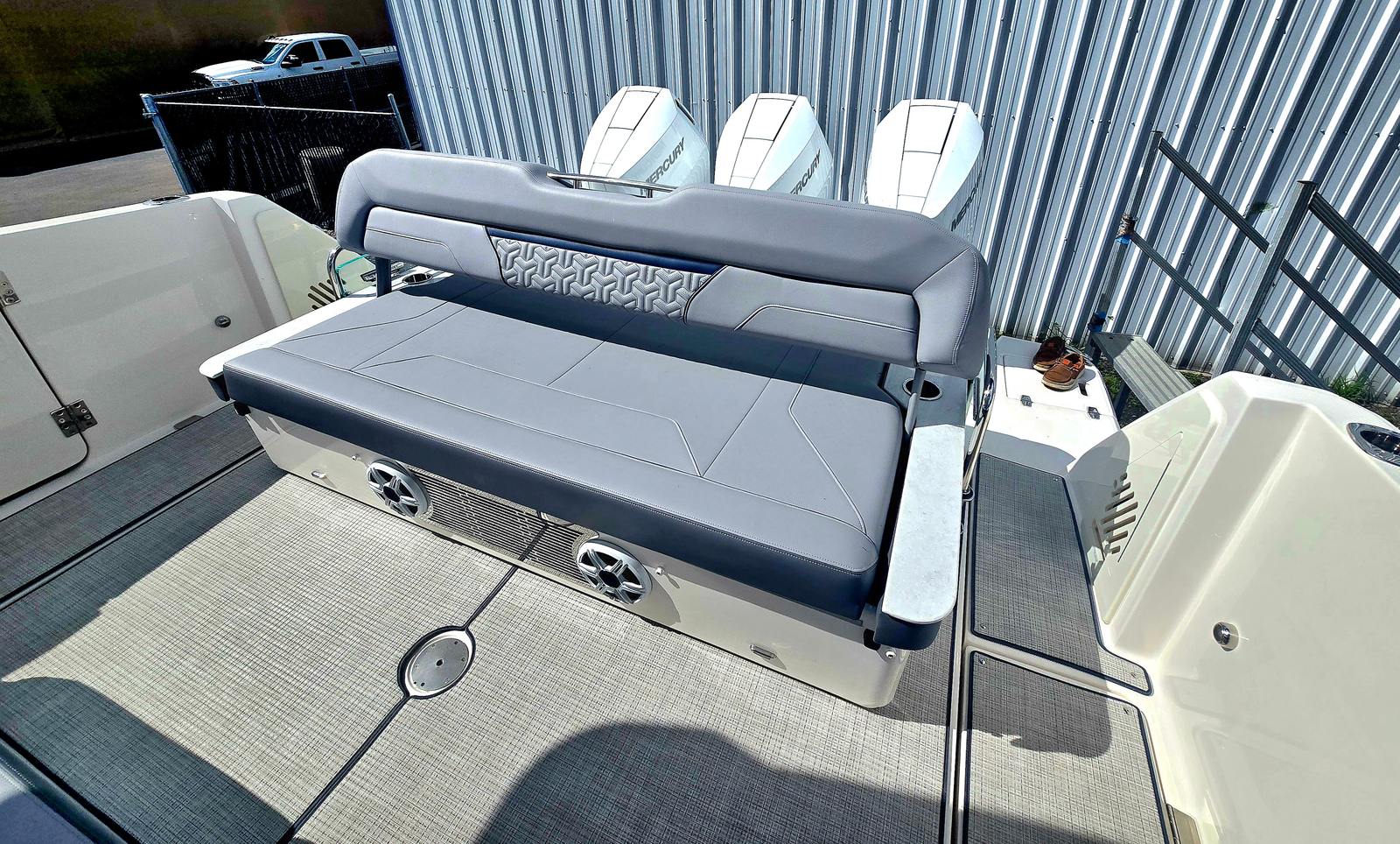 The 2026 Regal 38 SAV is loaded with premium features that set it apart from other yacht boats for sale. The exterior showcases a striking Bottom Color in Tahiti Beach White, complemented by the Z6MB Mediterranean Blue accent and a sophisticated Hull Color in Steel Grey. The Stainless Steel Upgrade Package adds a touch of modern elegance and durability throughout the yacht, ensuring every detail is both beautiful and built to last.Step aboard and you will find a cockpit designed for both relaxation and entertainment. The inclusion of a Television in the cockpit transforms your outdoor space into a vibrant social hub, perfect for movie nights or catching the big game while anchored in your favorite bay. The Countertops feature a stunning Mosaic design, adding a touch of artistry and luxury to your onboard experience. The White Canvas provides a clean, classic look that enhances the yacht’s overall aesthetic.For those who value connectivity and safety, the Garmin VHF Radio ensures reliable communication wherever your adventures take you. The Bow Sunshade System, operated manually, offers flexible protection from the sun, allowing you to create a comfortable lounging area at the bow. The Cockpit Refrigerator keeps your refreshments chilled and easily accessible, making it simple to entertain guests or enjoy a cool drink after a swim.