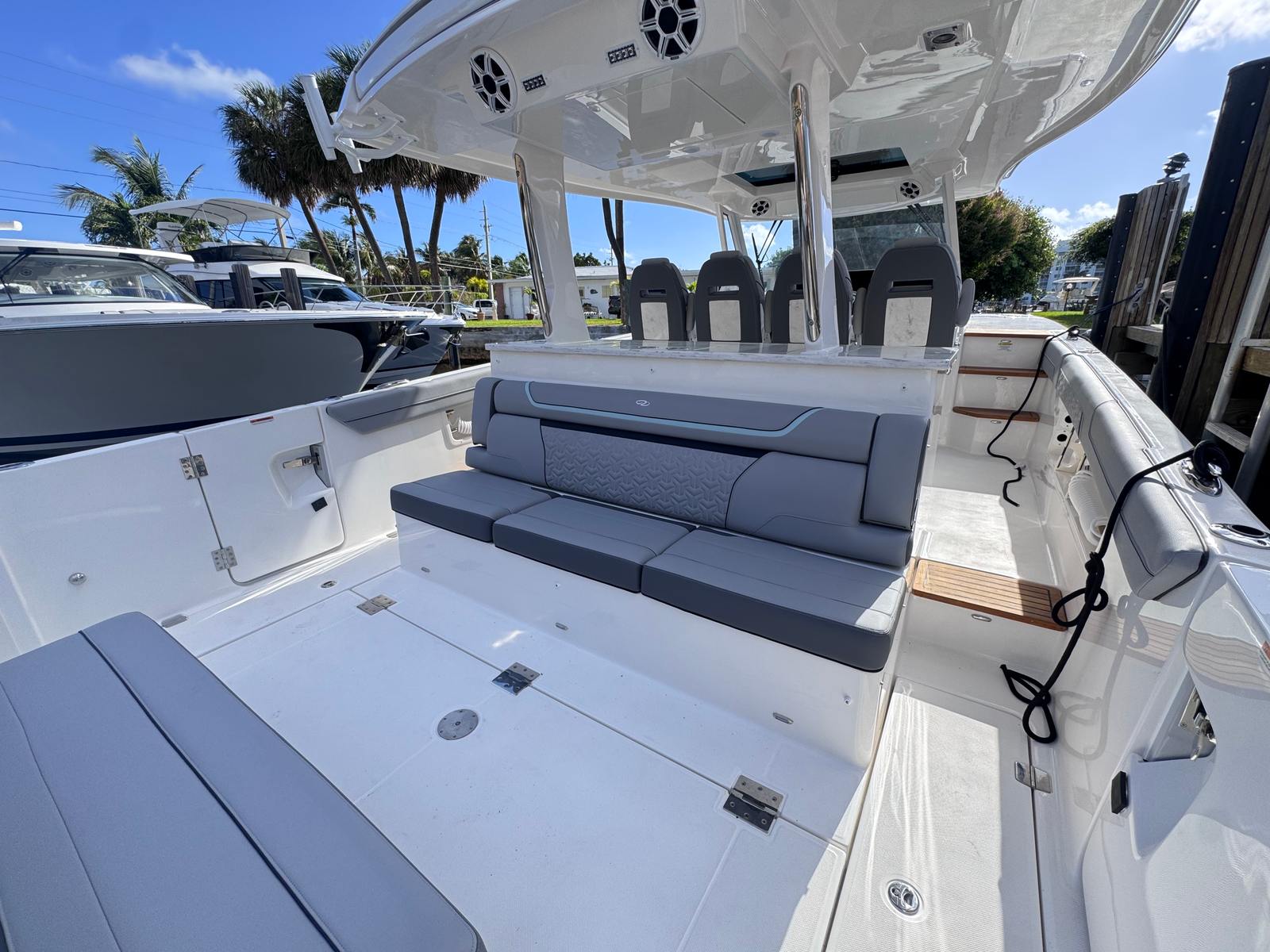 The Regal 38 SAV is as practical as it is luxurious. The ample storage options throughout the yacht make it easy to stow gear, water toys, and personal items, keeping the deck clutter-free and organized. The integrated steering system simplifies docking and close-quarters navigation, reducing stress and allowing you to focus on enjoying your time on the water. The efficient design of the triple Yamaha engines ensures optimal fuel usage, so you can spend more time cruising and less time refueling.The durable teak steps provide secure footing when boarding or moving about the yacht, while the protective canvas covers help maintain the vessel’s pristine appearance. Every feature is designed with the owner’s convenience in mind, making the 38 SAV a smart choice for those seeking a yacht boat for sale that balances luxury with everyday usability.
