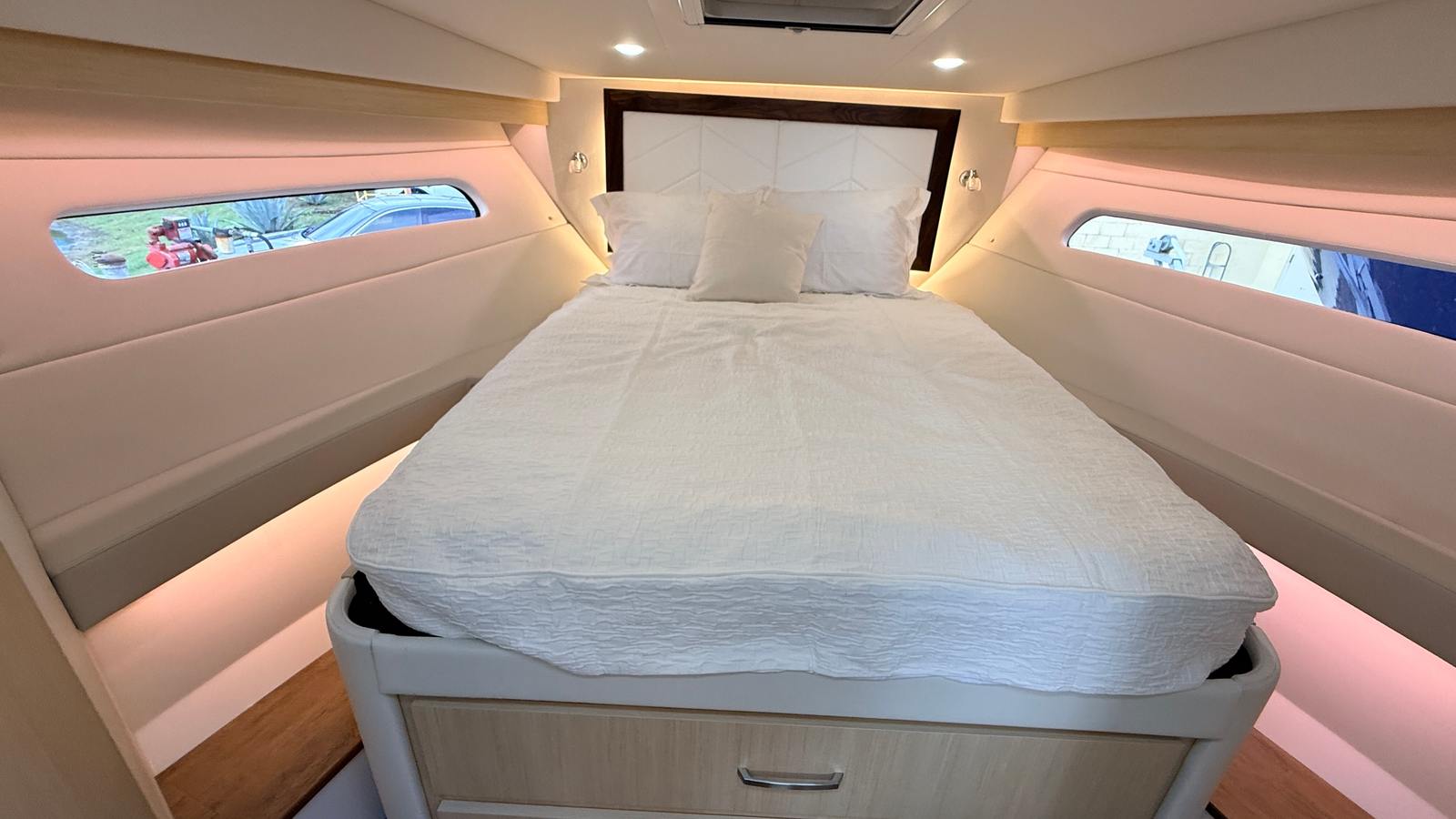 The Regal 38 XO is packed with special features that set it apart from other yacht boats for sale. The hull boasts a striking Tahiti Beach White color, complemented by a Mediterranean Blue bootstripe and matching bottom color. The interior is finished in Titanium, offering a modern and inviting atmosphere for you and your guests. The absence of bottom paint highlights the yacht’s fresh, new condition, while the aft cockpit canvas options, including the transom seat cover and Palm Beach enclosure, provide versatile protection and comfort. The windshield privacy cover and Mediterranean Blue canvas add both style and functionality, ensuring you’re prepared for any weather or occasion.