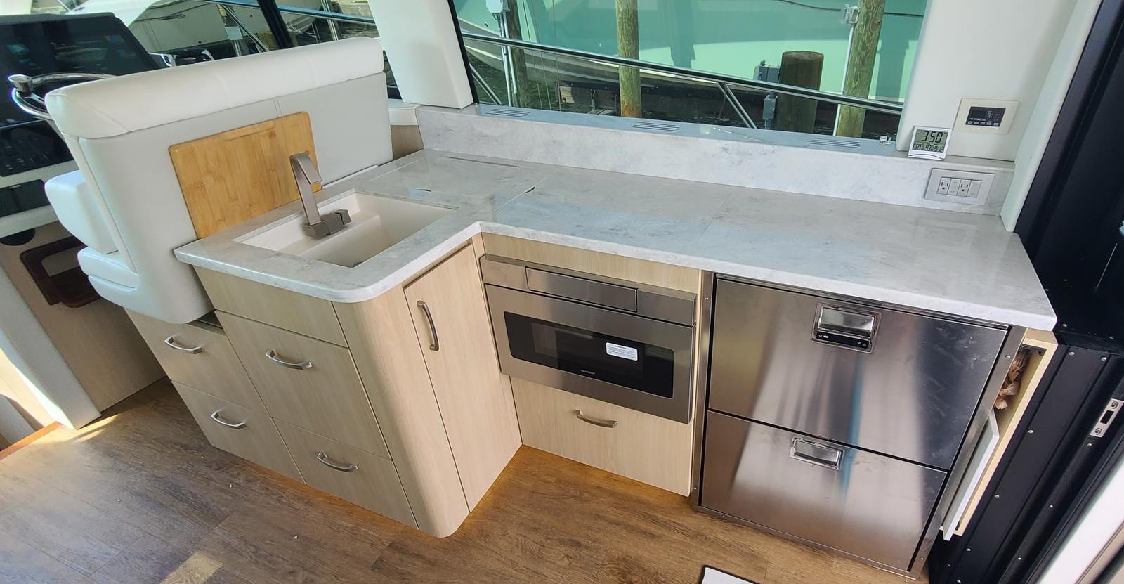 - Galley: Equipped with refrigerator, microwave, cooktop, and solid-surface countertops.