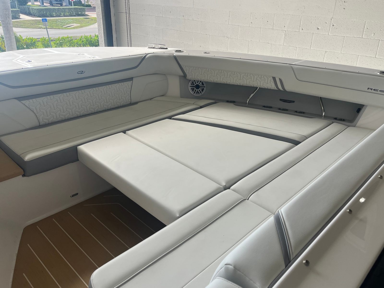 The Regal 50 SAV is meticulously crafted to offer a premium yachting experience. Its special features include the triple Mercury 600HP Verado engines, which are renowned for their quiet operation and robust power delivery. The yacht’s hull color in Steel Gray, paired with the Mediterranean Blue bootstripe and Tahiti Beach White bottom, creates a sophisticated and modern aesthetic. The multi-zone color scheme—featuring Pure White and Lunar Grey in various zones and a touch of Mediterranean Blue—adds a custom, high-end feel that is sure to turn heads wherever you go. Every detail of the 50 SAV’s design has been thoughtfully considered to provide both visual appeal and functional excellence.