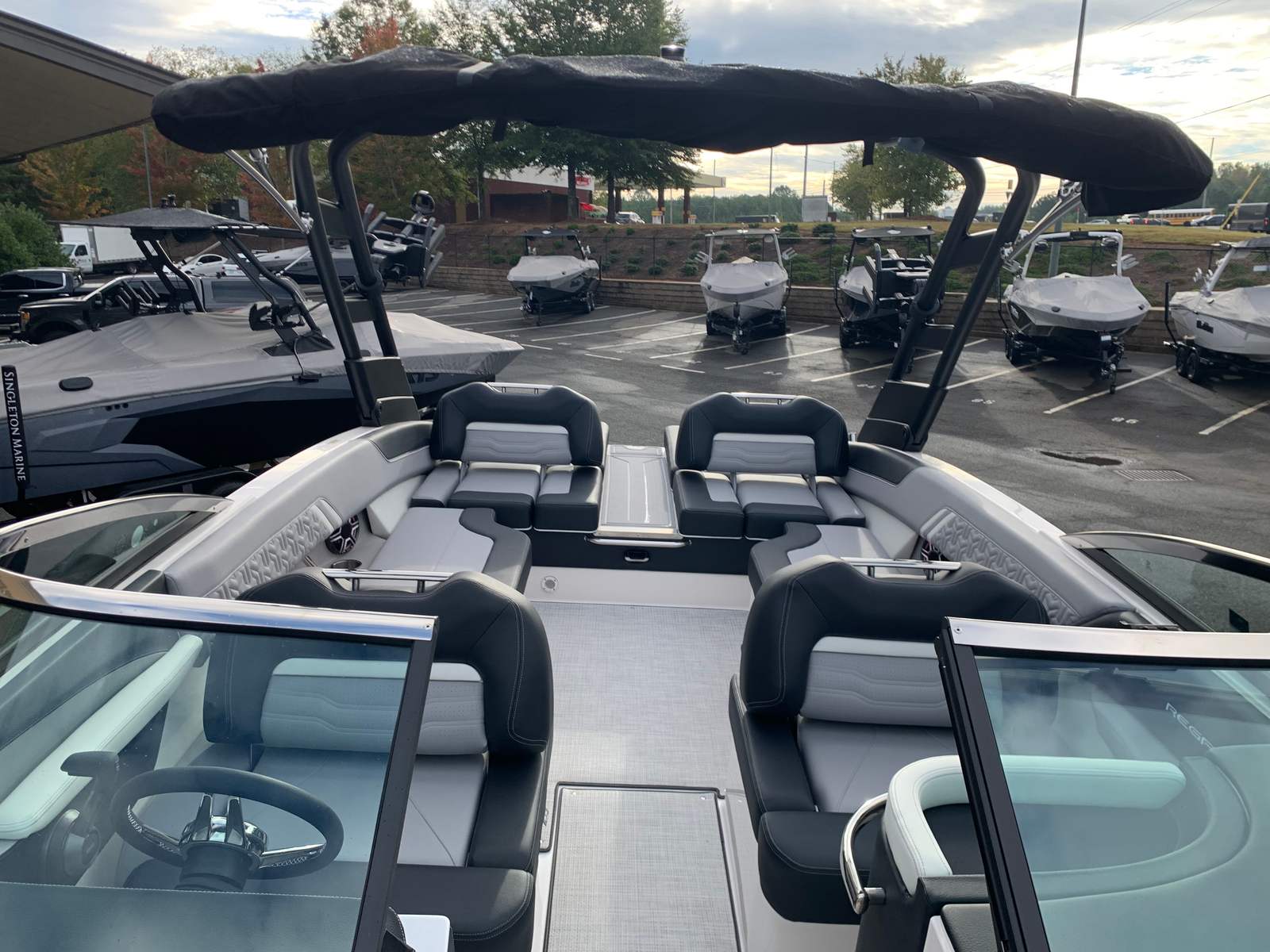 The Regal LS6 Surf is designed with both aesthetics and functionality in mind. Its exterior showcases a harmonious blend of Black, Steel Grey, and Tahiti Beach White, complemented by a White swim platform that invites you to dip your toes in the water or launch your next aquatic adventure. The interior features Z1LGC Lunar Grey - Chil, Z2BLC Black - Chil, Z3BLC Black - Chil, Z4PWS Pure White - Standard, and Z5PWS Pure White - Standard, creating a sophisticated and inviting atmosphere for you and your guests. Every detail is thoughtfully crafted to enhance your time on the water, from the spacious bow seating to the ergonomic helm.