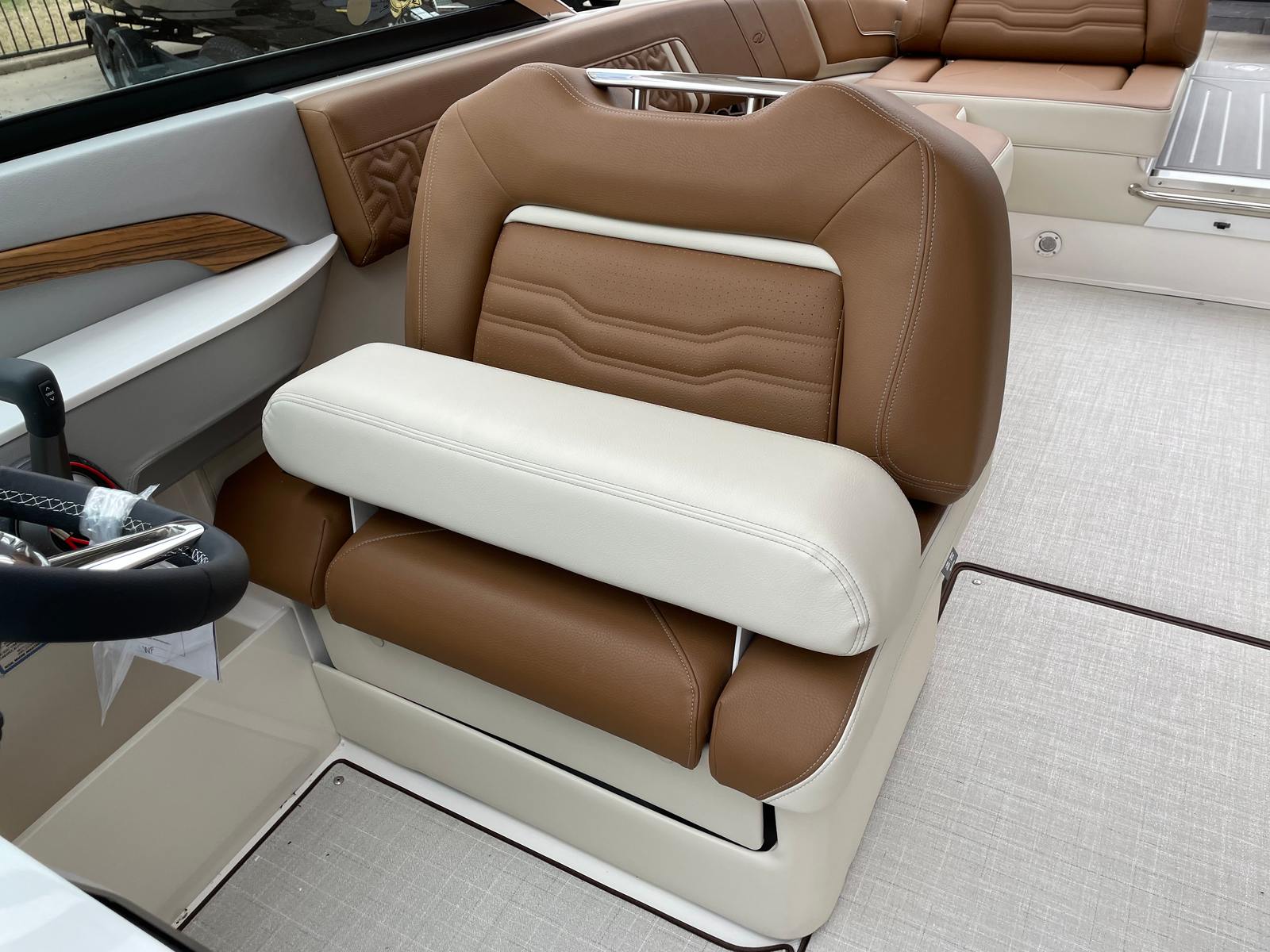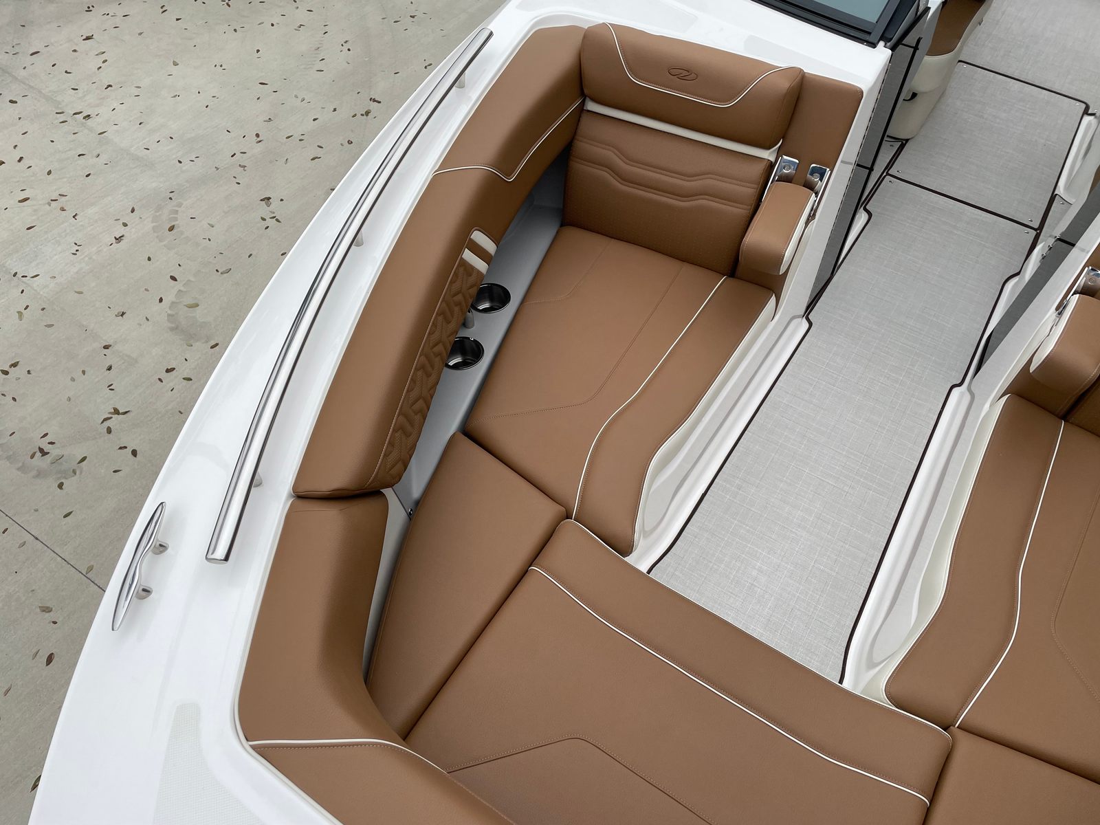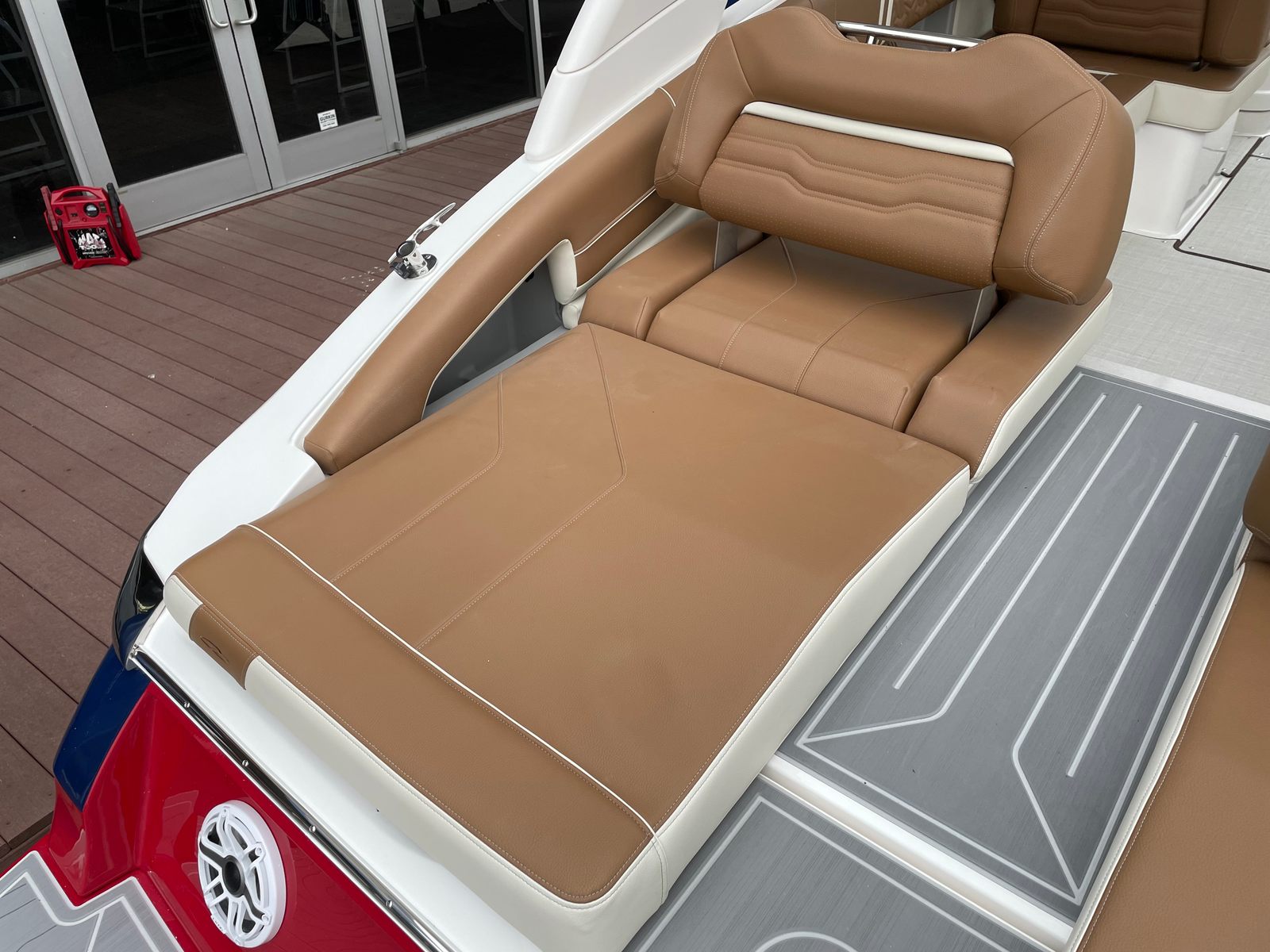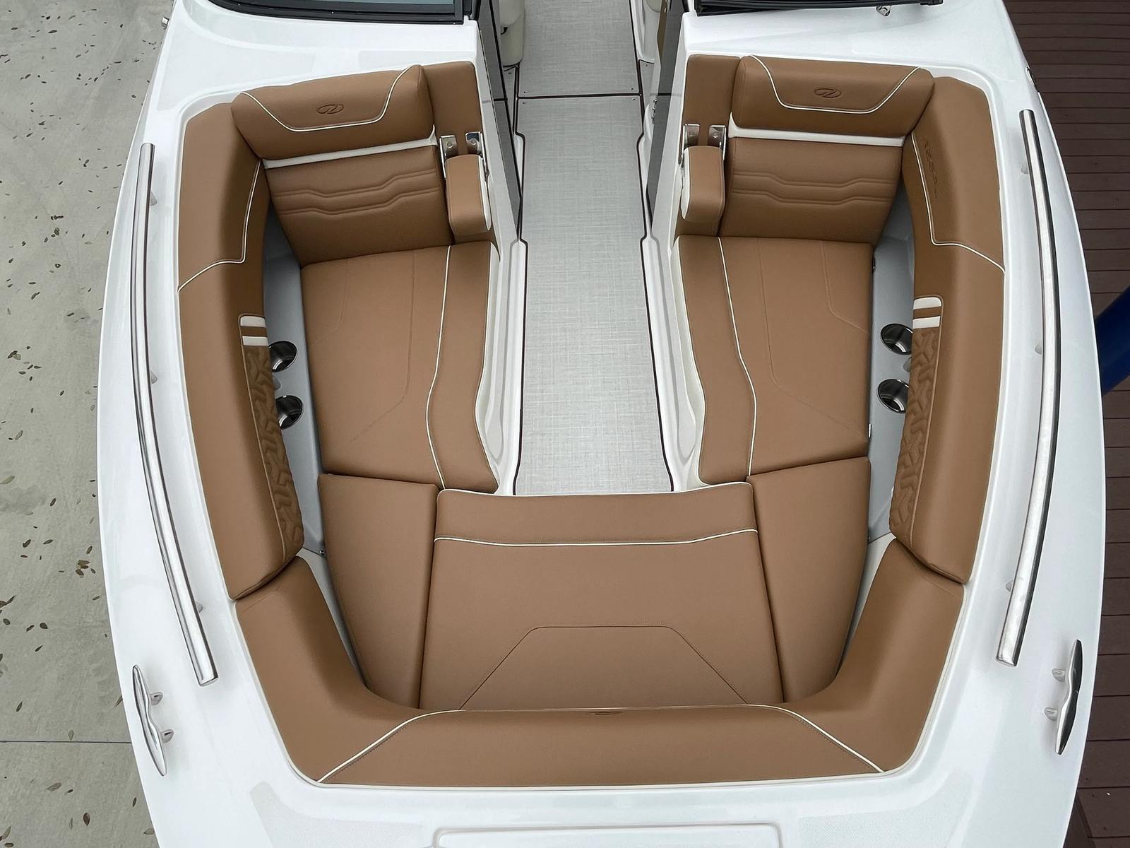 The Regal LS9 Bowrider is packed with premium features that enhance both its appearance and functionality. The Mediterranean Blue hull and bottom color create a sophisticated look, while the Flame Red bootstripe adds a bold touch of personality. Inside, the LS9 boasts a luxurious multi-zone seating arrangement, with Saddle Brown - Chil upholstery in Zones 1, 3, and 6, and Vista White - Standard in Zones 2, 4, and 5. This combination of colors and materials provides a refined, inviting atmosphere for you and your guests. The ergonomic seating is designed for maximum comfort, allowing everyone onboard to relax and enjoy the ride.