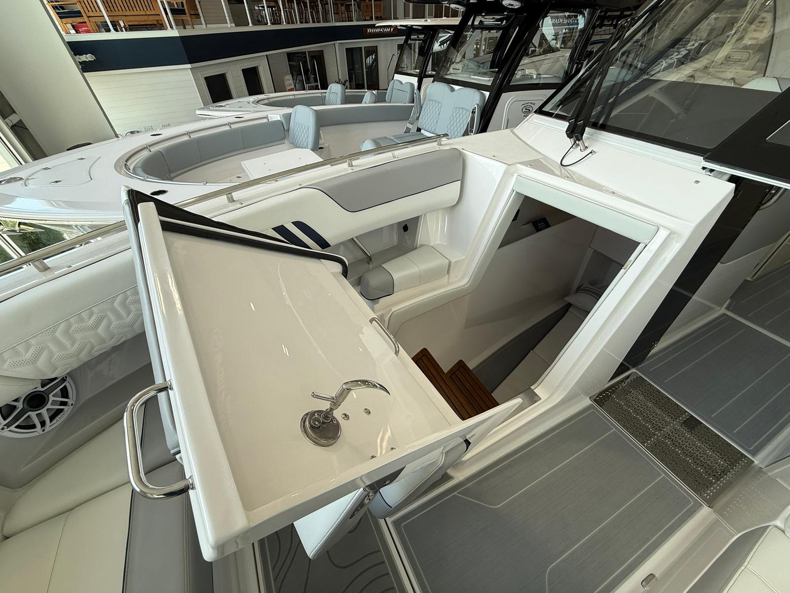 The 2026 Regal LX36 is loaded with premium features that elevate your boating experience to new heights. The Aft Cockpit Canvas - Palm Beach Enclosure provides protection from the elements, allowing you to enjoy your time on the water regardless of the weather. The Anchor Windlass - All Chain system ensures effortless anchoring, while the Bow Thruster offers enhanced maneuverability, making docking and tight turns a breeze. The Bow Cover White Stamoid and Canvas - White add a touch of elegance and durability, perfectly complementing the boat’s Mediterranean Blue bottom and Tahiti Beach White bootstripe.For those who love to entertain, the cockpit is equipped with a refrigerator to keep your refreshments chilled and a beautiful Teak Cockpit Table that invites guests to gather and relax. The Companion Garmin 8616 navigation system provides state-of-the-art technology, ensuring you stay on course and connected wherever your adventures take you.