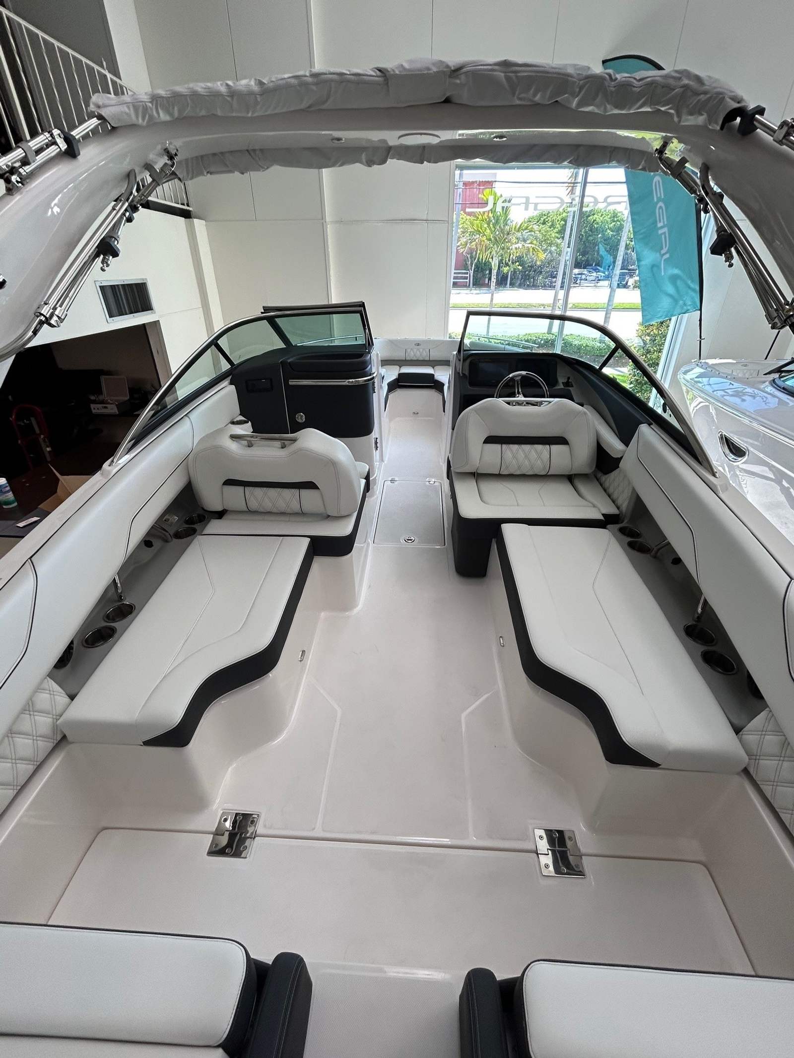 The 2025 Regal LX4 comes loaded with premium features that elevate your boating experience. The dual Garmin 943 displays provide state-of-the-art navigation and system monitoring, giving you confidence and control at the helm. The transom shower and pressure water package add a touch of convenience, allowing you to rinse off after a swim or clean up with ease. The hull’s Steel Grey color is complemented by a black travel storage cover, ensuring your boat stays protected when not in use.The PowerTower in white is a standout feature, offering both style and functionality, while the head compartment adds a level of comfort and privacy for longer outings. The inclusion of a premium package ensures that every detail, from upholstery to hardware, meets the highest standards of luxury. The port light in a half-moon design brings in natural light and enhances the cabin’s ambiance. With black canvas accents, the LX4’s aesthetic is both modern and timeless, making it a Regal boat for sale that truly stands out.