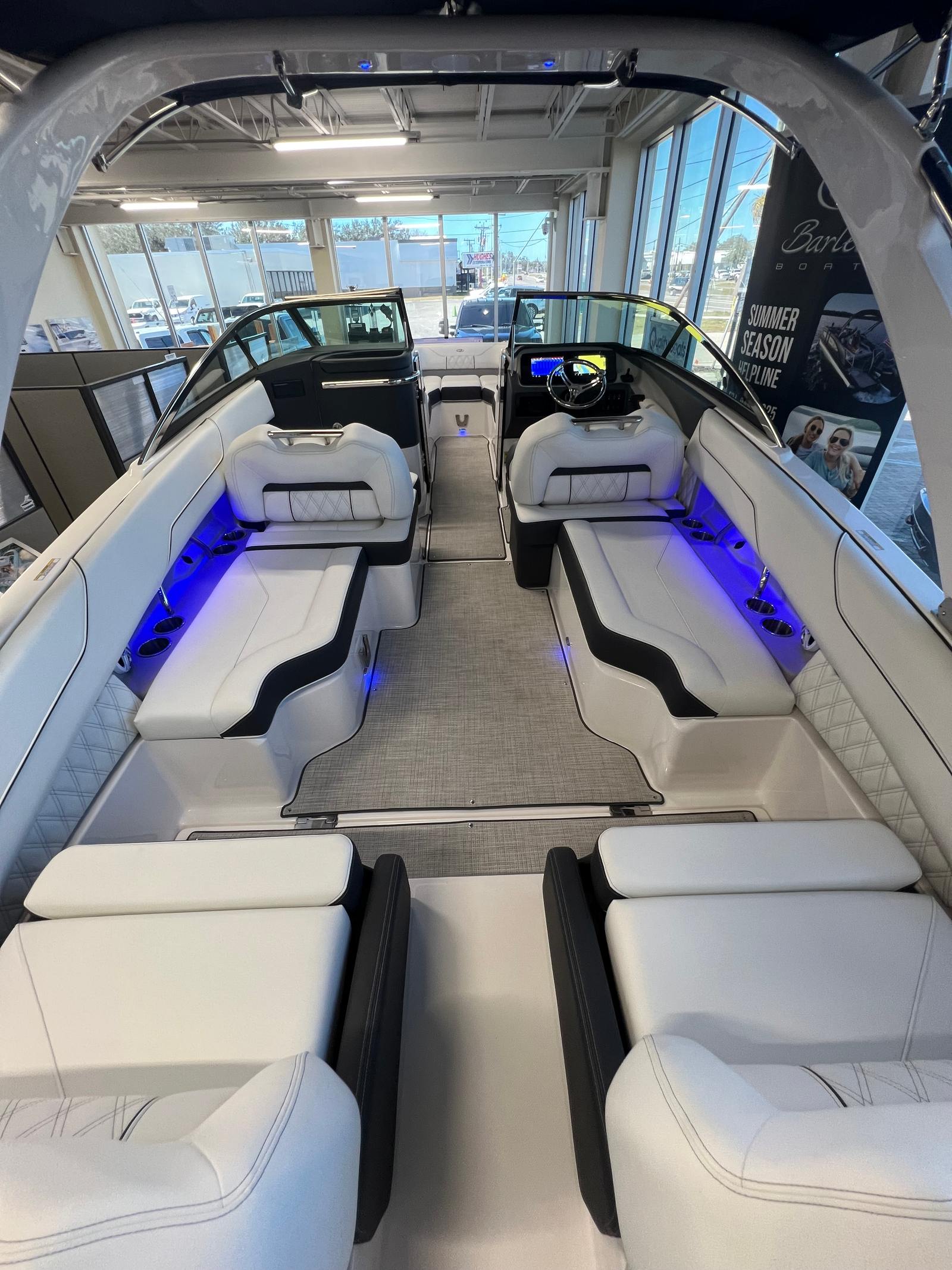The 2026 Regal LX4 Bowrider is a brand-new addition to the Regal lineup, boasting a generous length of 24.33 feet. This spacious design ensures ample room for relaxation, entertainment, and adventure, making it the perfect choice for those who appreciate both comfort and excitement. The LX4’s modern profile is accentuated by its Tahiti Beach White finish and Mediterranean Blue canvas, creating a striking presence whether you are cruising the lake, exploring coastal waters, or anchored at your favorite spot.